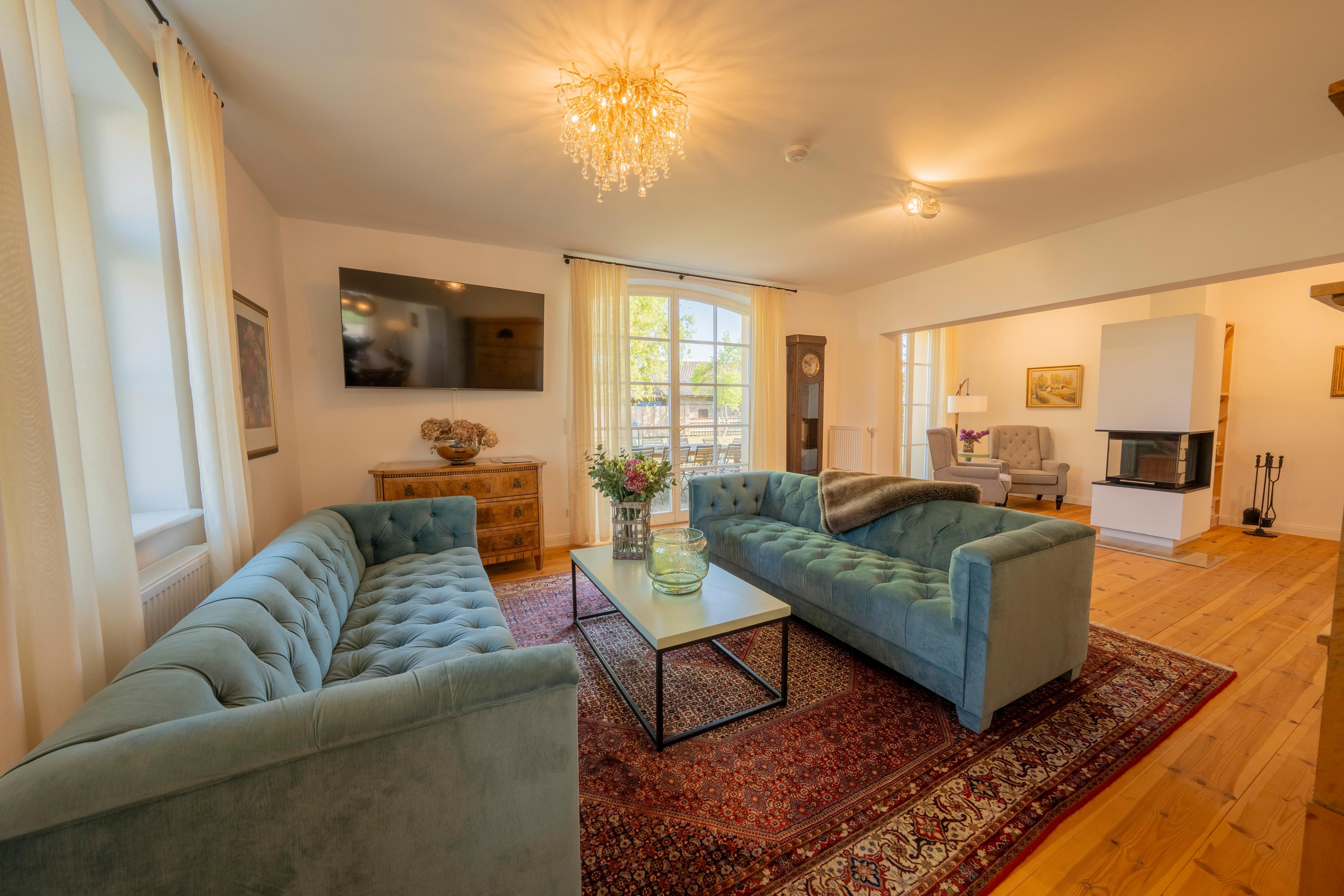 Wohnzimmer mit Kamin: Lichtdurchflutet und gemütlich, mit TV-Flatscreen und einladender Sitzgarnitur.