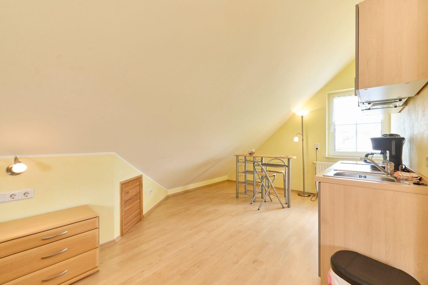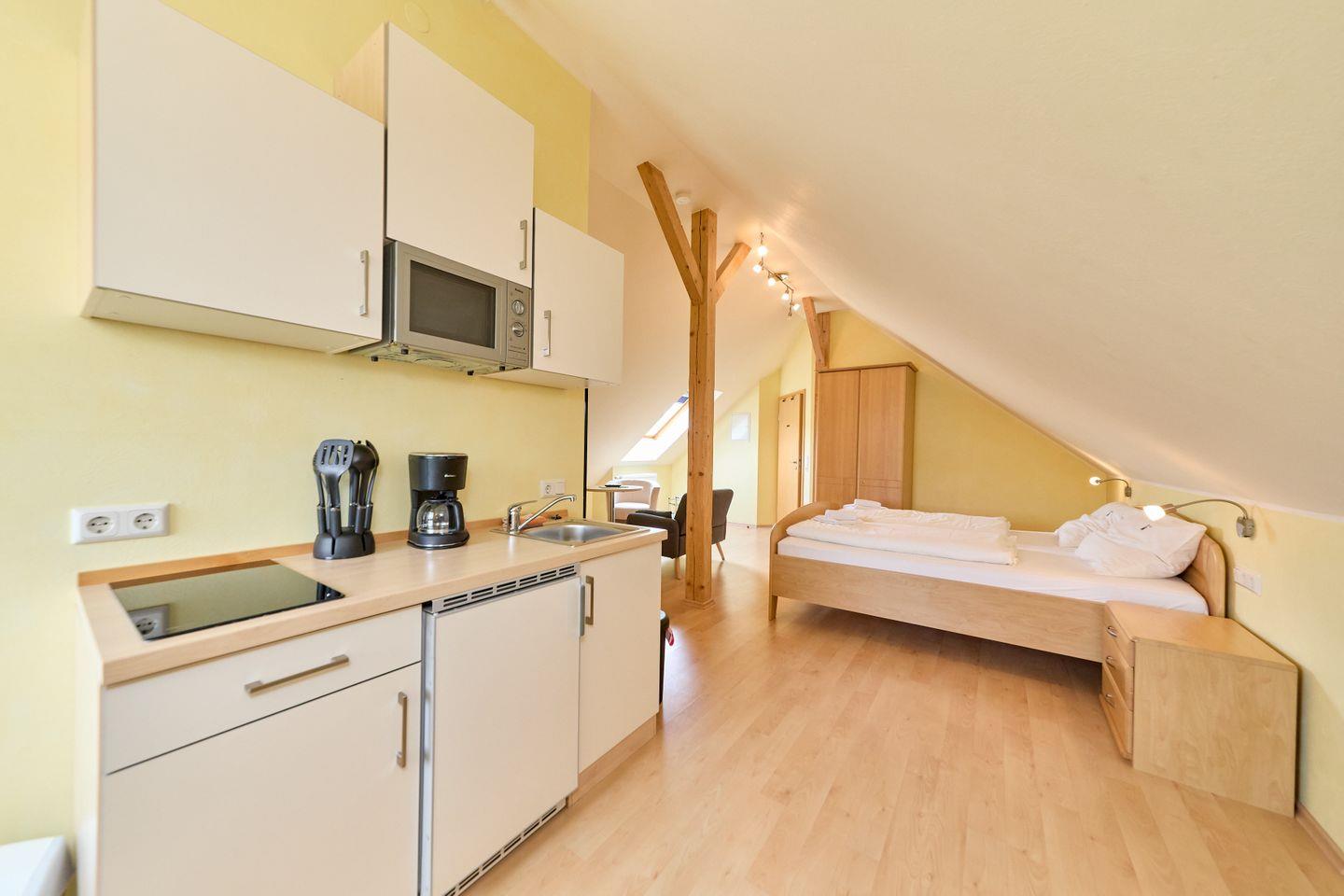 Diese Fewo bietet Platz für bis zu 2 Personen in einem gemütlichen Appartment, mit .einer Kochnische, kleinem Essbereich.