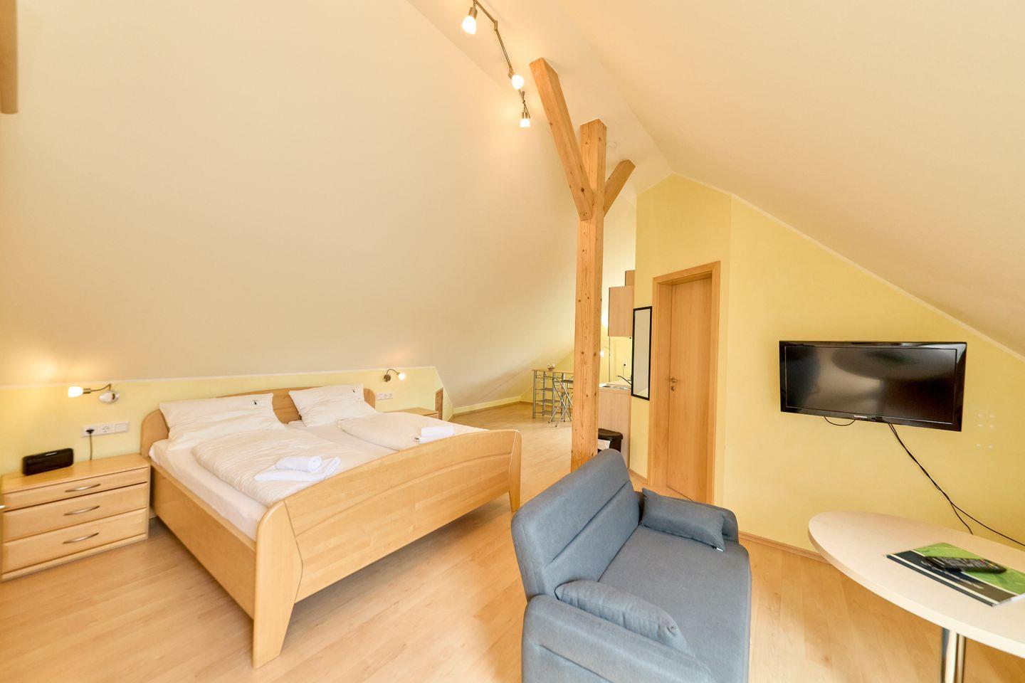 Das Schlafzimmer ist hell und freundlich eingerichtet und sorgt für eine erholsame Nachtruhe. Hier erwarten Sie ein komfortables Doppelbett und ausreichend Stauraum für Ihr Gepäck. Der großzügige Wohnbereich bietet zusätzlichen Raum zum Entspannen, ausgestattet mit einem bequemen Sessel sowie einem Fernseher, auf dem Sie nach einem erlebnisreichen Tag Ihre Lieblingssendungen verfolgen können.