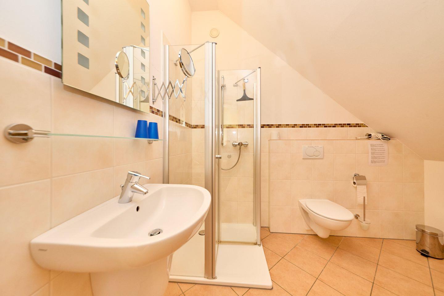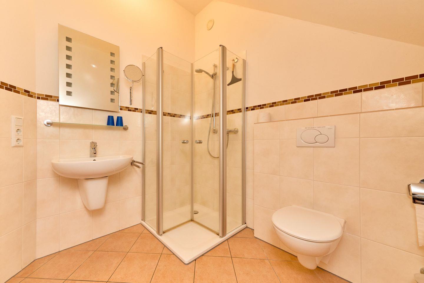 Das Badezimmer bietet sowohl modernen Komfort als auch funktionale Ausstattung. Mit einer Dusche, einem WC und einem Waschbecken steht Ihnen alles zur Verfügung, was Sie für Ihre persönliche Hygiene benötigen. Handtücher und Badetücher sind inkludiert, sodass Sie sich um nichts kümmern müssen. Zudem finden Sie im Bad einen Haartrockner, der Ihren täglichen Bedürfnissen gerecht wird.