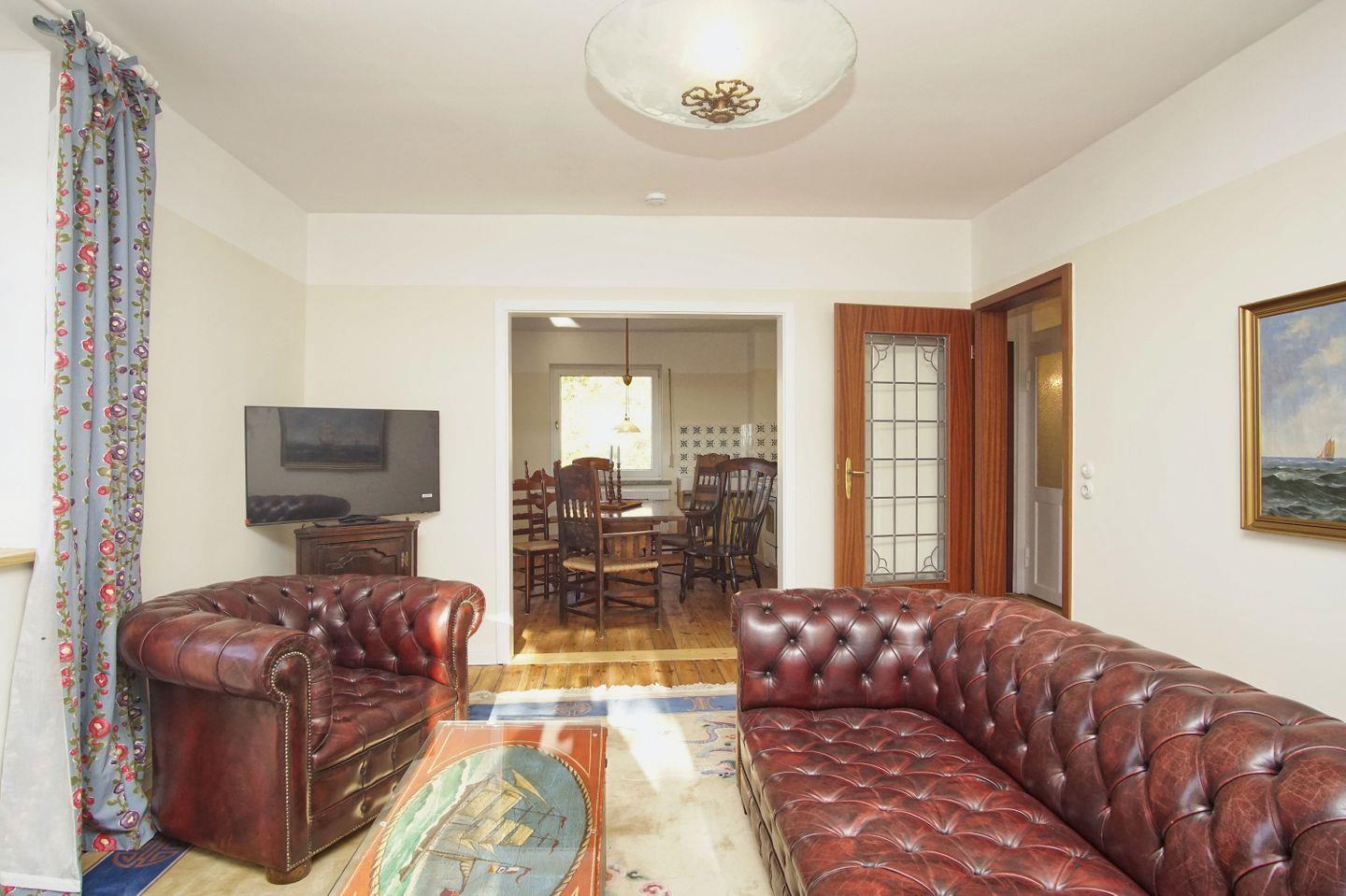 WOHNEN // Wohnzimmer im Obergeschoss mit bequemer Ledercouch und Ledersessel, Flachbild-TV, Meerblick ++