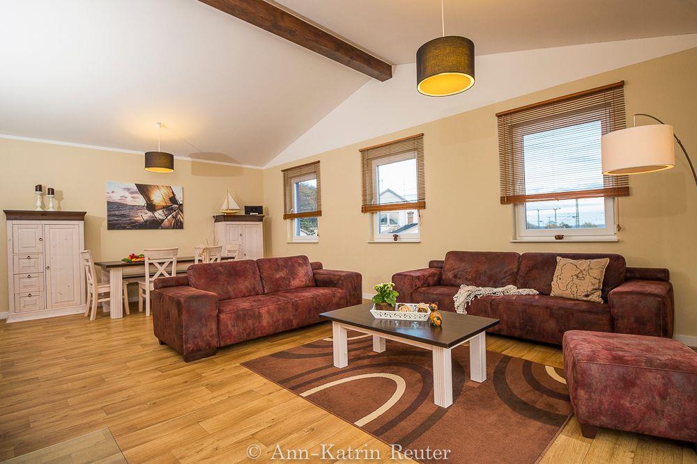 Über eine Treppe gelangen Sie in den großen und modern eingerichteten Wohnbereich mit offener Küche. Eine behagliche Sitzecke mit Flachbildfernseher und Kamin lädt zum Verweilen ein. In der komplett ausgestatteten Küchenzeile finden Sie unter anderem einen Ceranherd mit Backofen, eine Geschirrspülmaschine sowie eine Mikrowelle.
