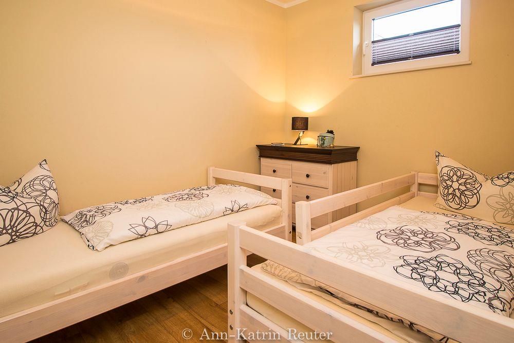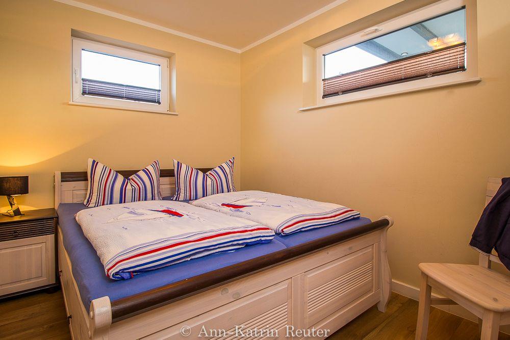 Über einen separaten Eingang gelangen Sie in die untere Ebene der modern eingerichteten Ferienwohnung. Hier finden Sie das Elternschlafzimmer mit Doppelbett, das Kinderschlafzimmer mit 2 Einzelbetten (bzw. mit Doppelstockbetten in den Wohnungen Fischmöwe und Silbermöwe) sowie das Badezimmer mit Dusche und WC.