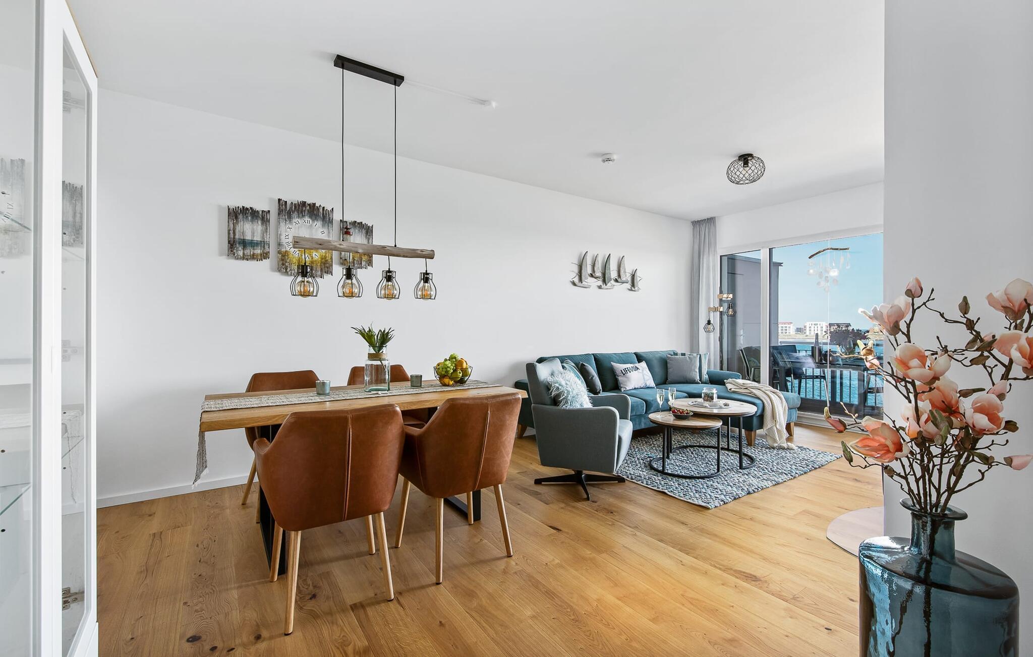 Der Blick fällt aus dem Wohnbereich und dem Hauptschlafzimmer durch bodentiefe Fenster und vom Balkon aus auf die Weite des Meeres. Bei gutem Wetter ist der Blick bis zu den dänischen Inseln möglich.
