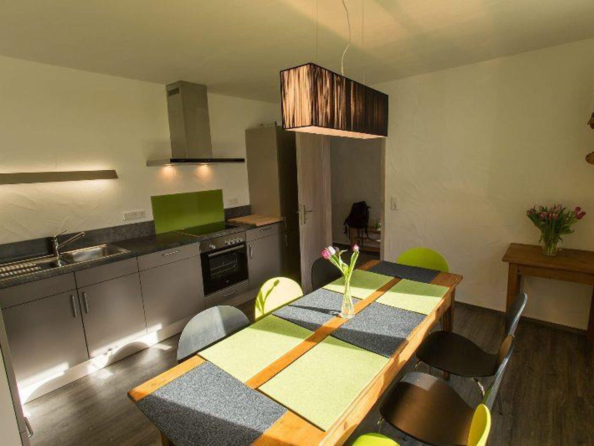 Küche und Esszimmer für bis zu 8 Personen mit: Backofen, Elektroherd, Kühlschrank, Spülmaschine, Wasserkocher, Pad-Kaffeemaschine und Mikrowelle. Wohnzimmer mit gemütlicher Sitzecke, Gartenausgang zur Terrasse.