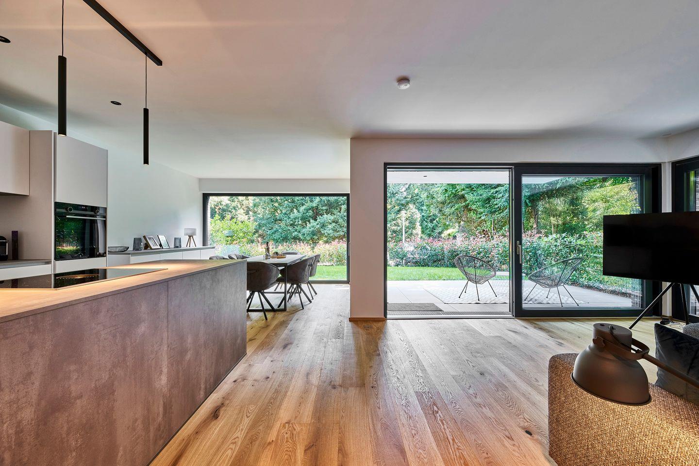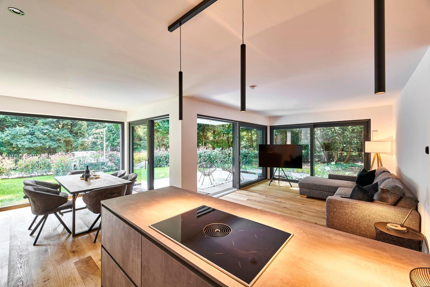 Die Ferienwohnung beeindruckt mit einem offenen Wohn- und Essbereich samt integrierter Küche und Kochinsel. Der Austritt auf die großzügige Garten-Terrasse erweitert die Unterkunft und ermöglicht entspannte Momente im Freien.