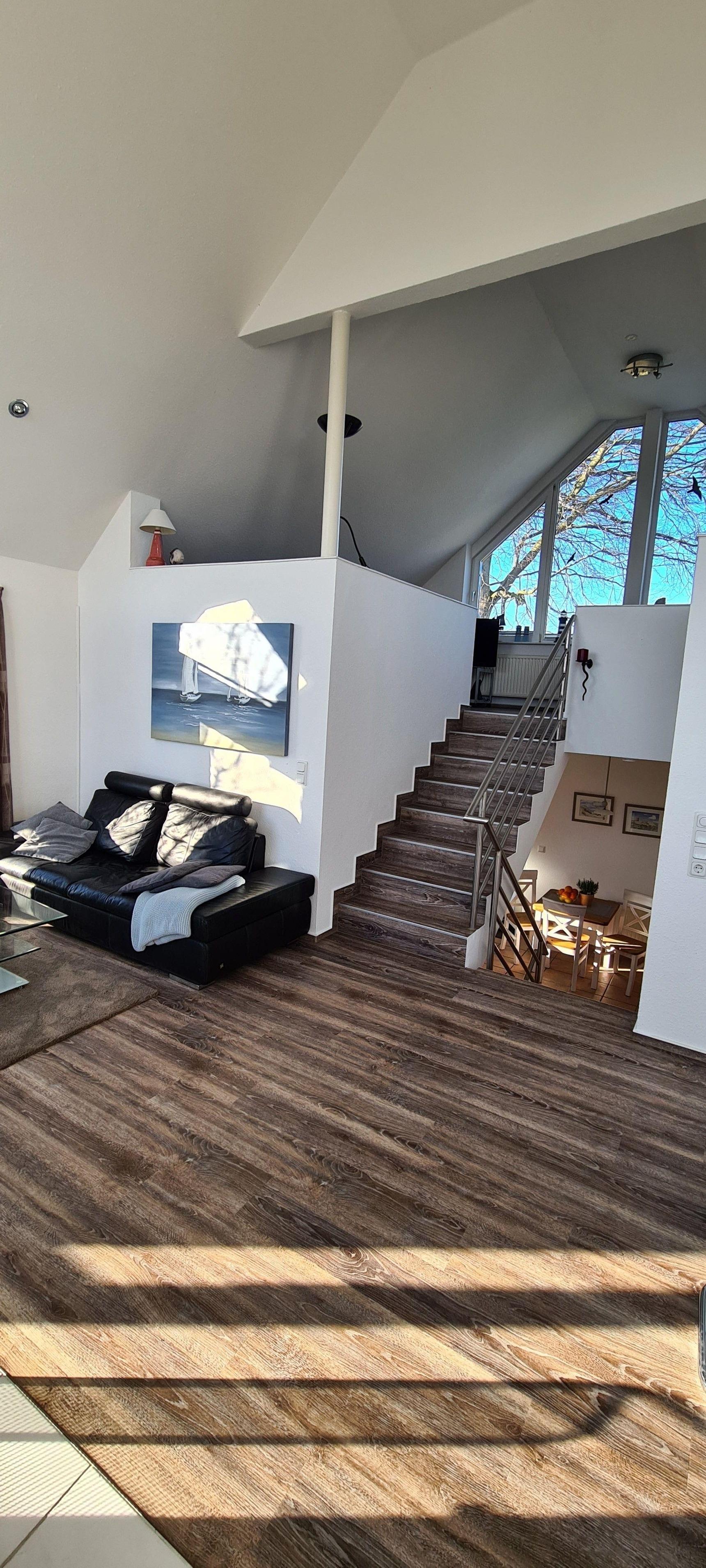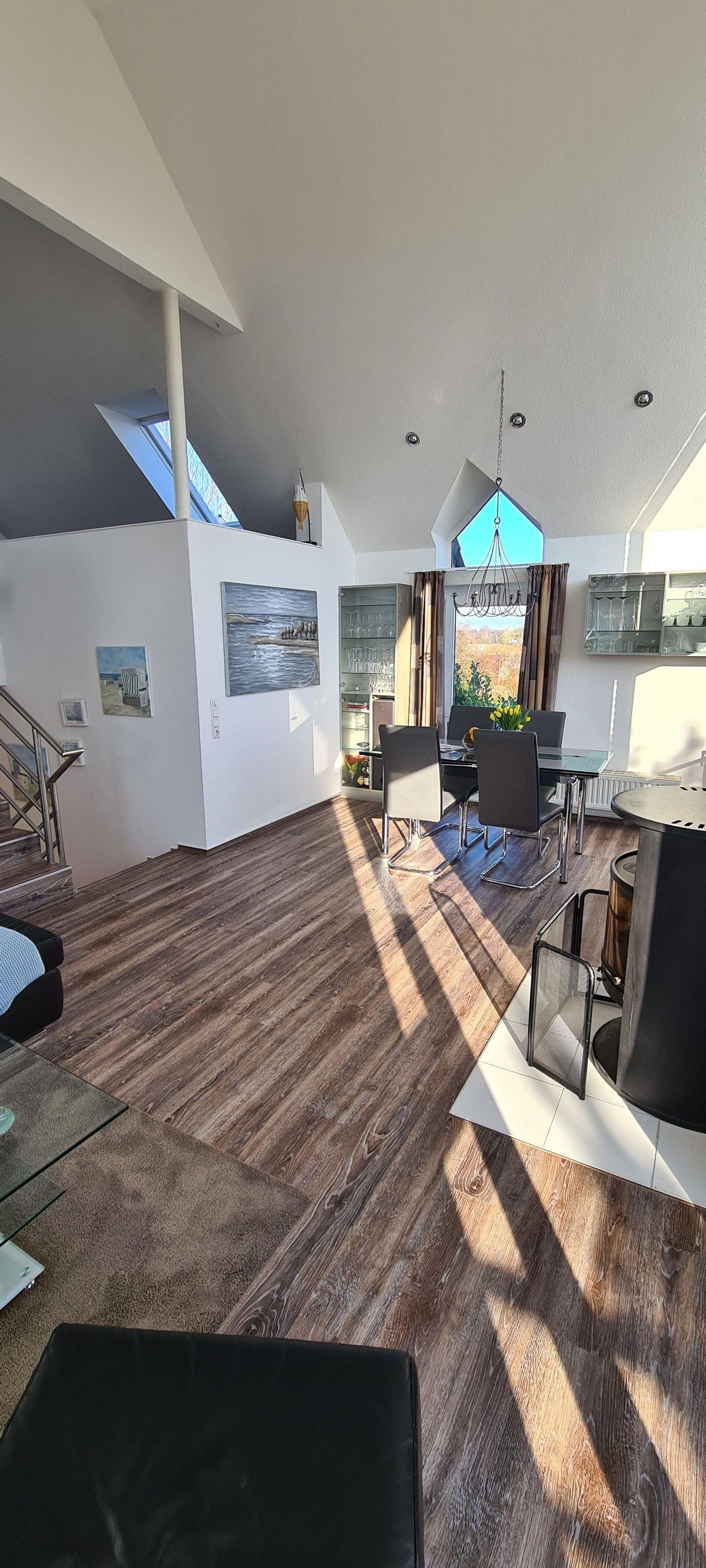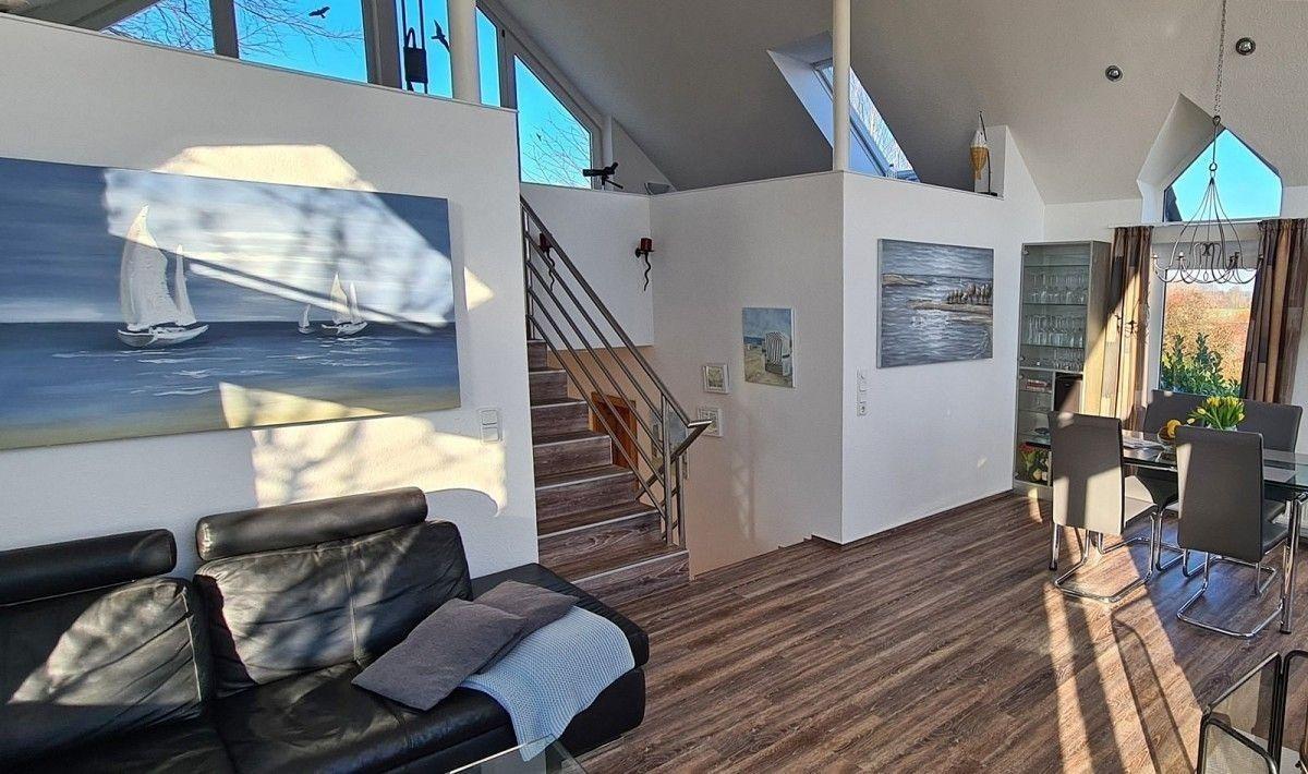 Das Haus bietet für 4 Personen viel Komfort auf mehreren Wohnebenen. Der offen gestaltete Wohn- und Essraum im 1. Stock bietet sich als schöner Mittelpunkt für Euren Familienurlaub an, denn er ist mit einem gemütlichen Sofa und Liegesessel sowie einem großen Esstisch ausgestattet. Von dort gelangt Ihr direkt auf die große Panorama-Dachterrasse: Genießt dort die Sonnenstunden und beobachtet dabei die vorbeifahrenden Segelboote auf der Schlei. Erlebnisreiche Urlaubstage könnt Ihr mit einem Glas Wein im gemütlichen Strandkorb ausklingen lassen...