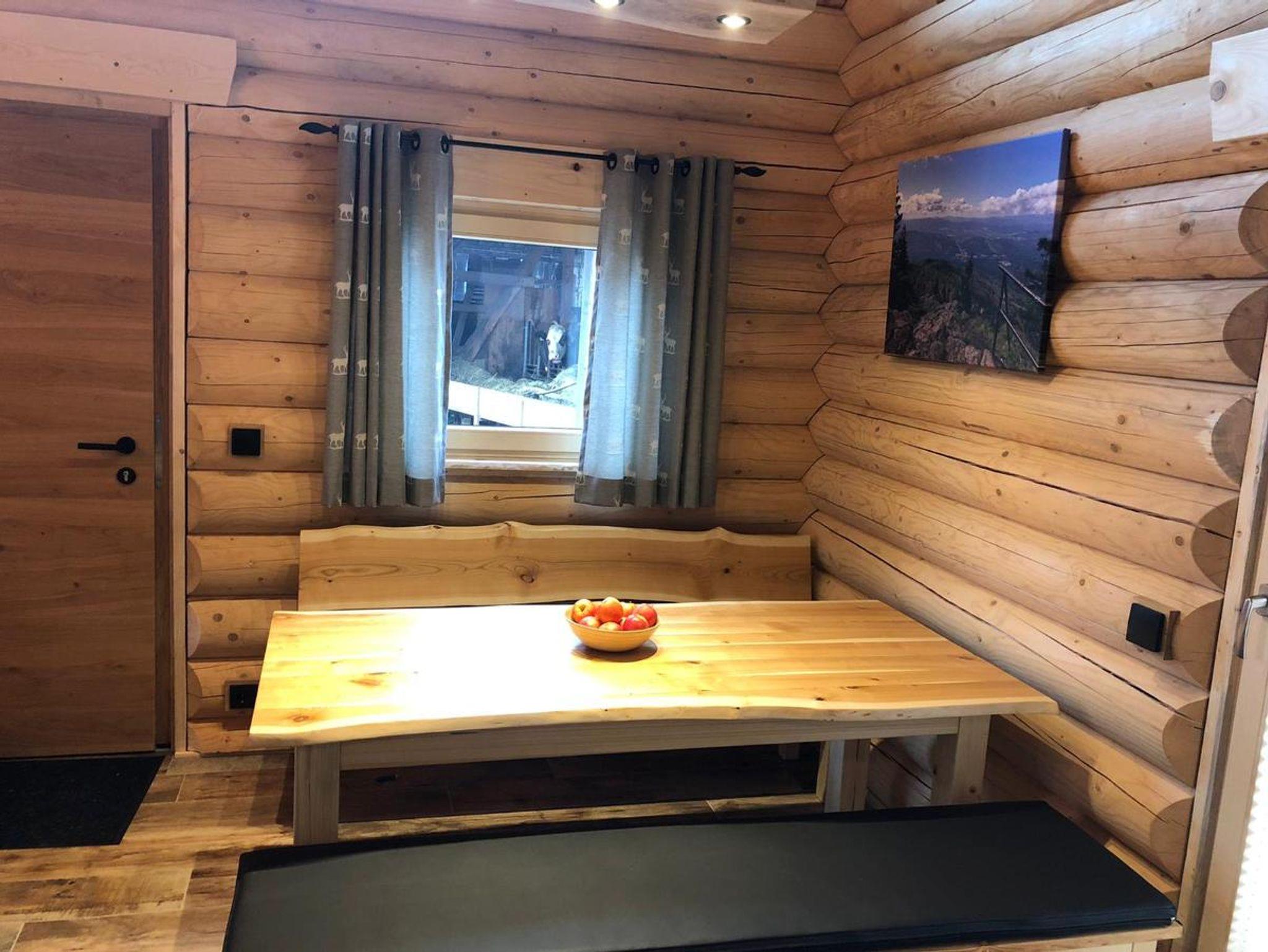 Das Rundholzchalet wurde komplett aus eigenem Holz und mit viel Liebe gefertigt. Es ist in schlichtem Design mit handgefertigten, naturbelassenen Vollholzmöbeln ausgestattet.