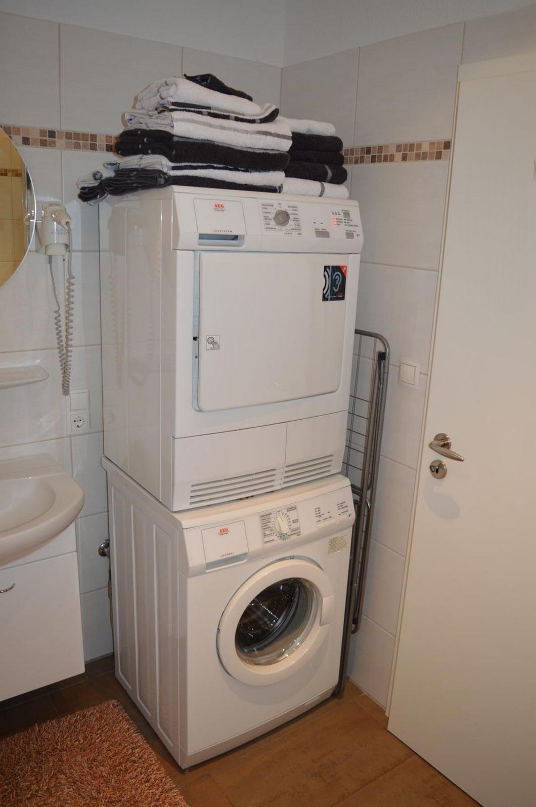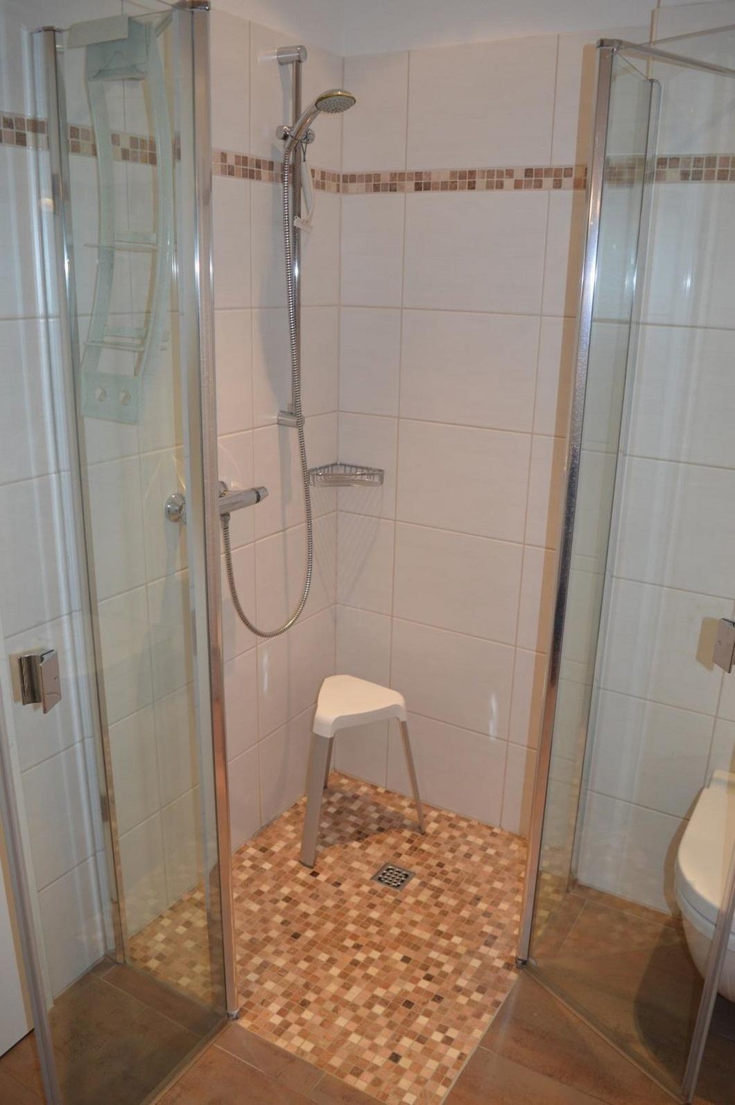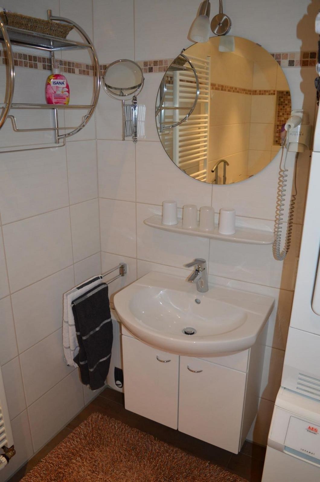 Das moderne Bad wurde mit einer ebenerdigen Dusche, einem WC und einem Waschbecken ausgestattet. Waschmaschine, Wäschetrockner und Fön sind ebenfalls vorhanden. Im Bad befindet sich außerdem eine Fußbodenheizung. Hand- und Badetücher stellen wir Ihnen in ausreichender Anzahl zur Verfügung. Auch Bademäntel finden Sie hier für sich vor.