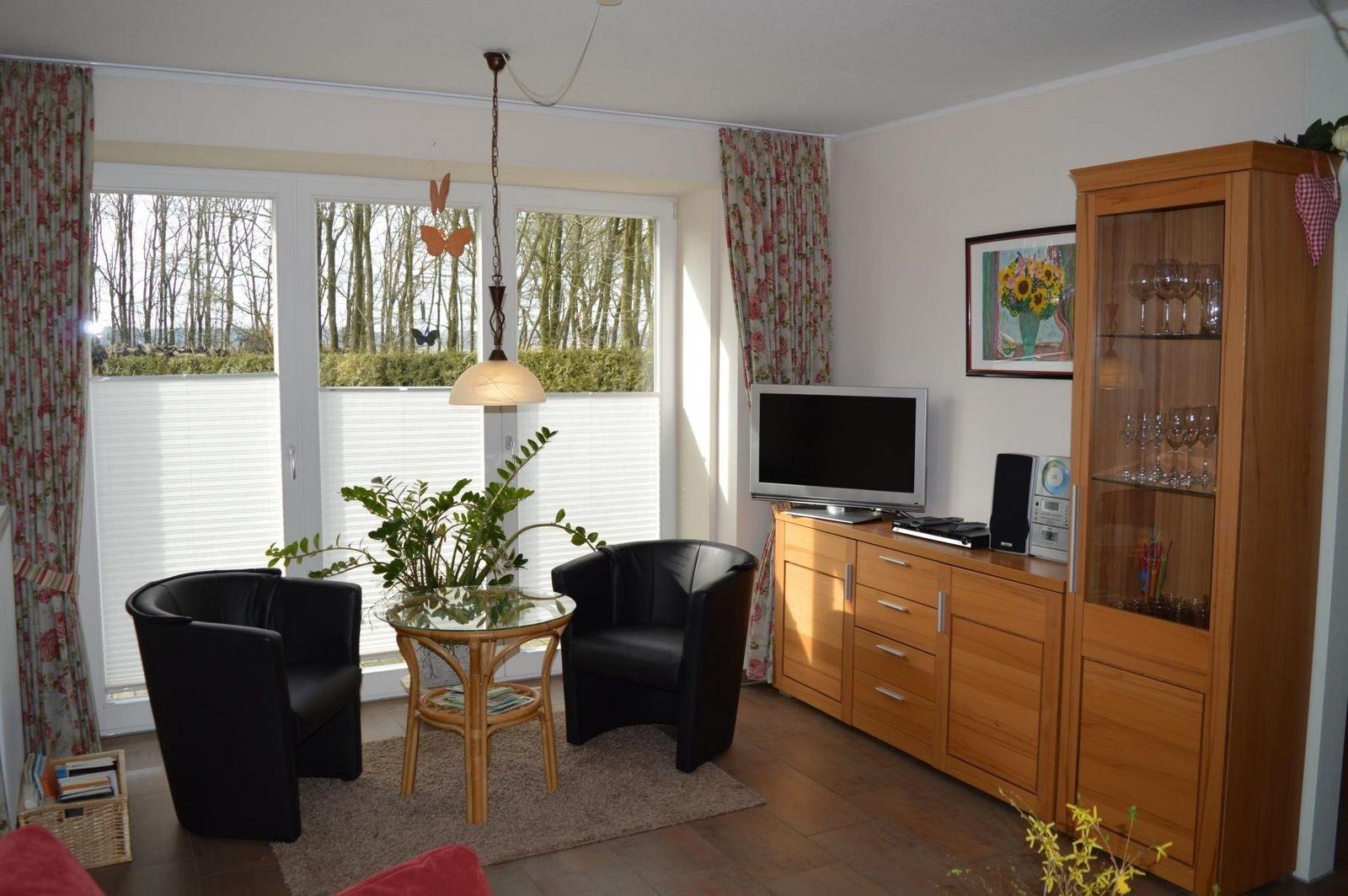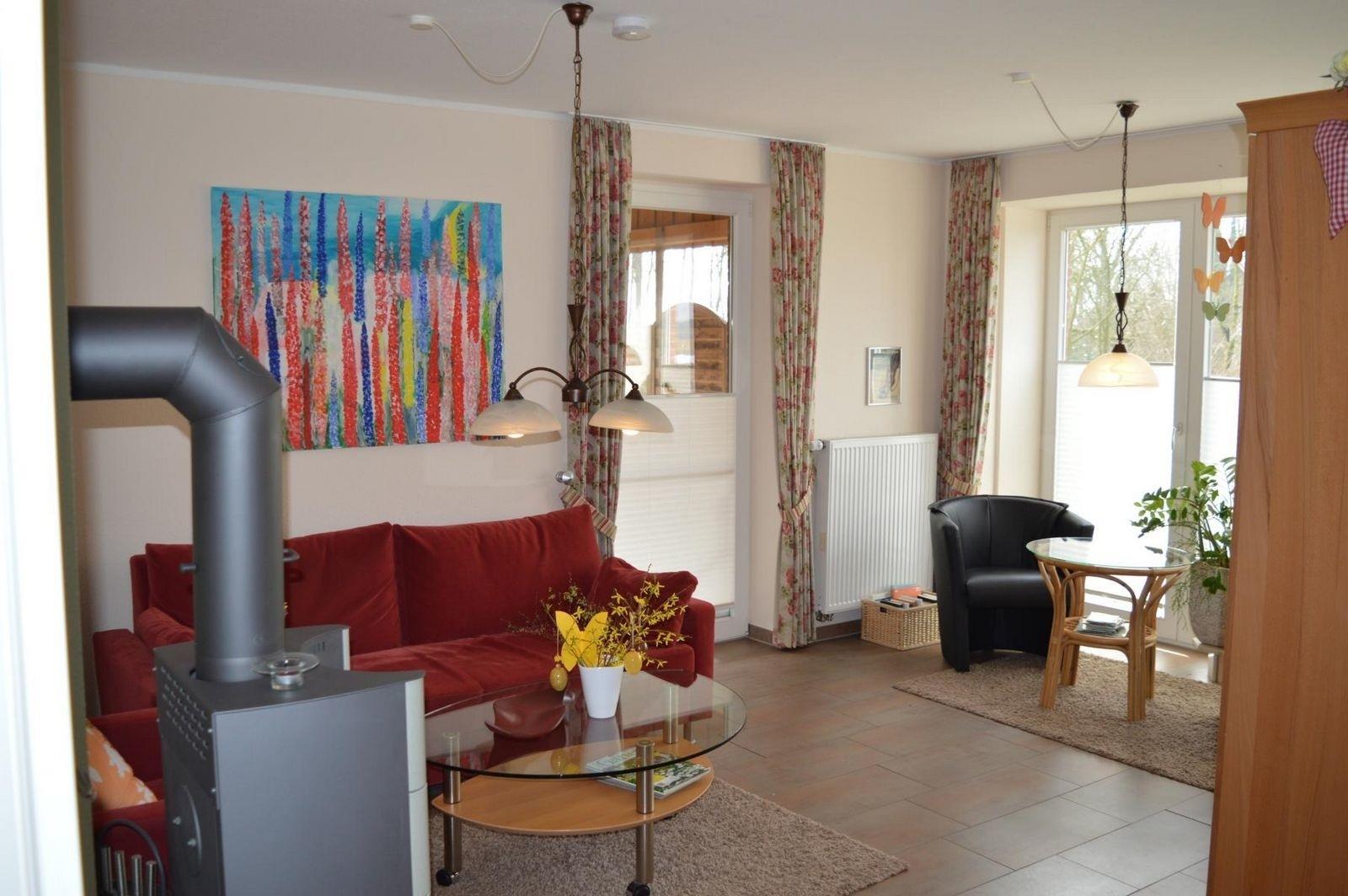 Das geräumige und helle Wohnzimmer ist ausgestattet mit einem Kaminofen, einer gemütlichen Sitzgruppe und einer einladenden Leseecke. Das Sofa kann ausgezogen und dann als zusätzliches Doppelbett genutzt werden. Mit Fernseher, Radio, CD- und DVD-Player, Spielesammlungen und verschiedenen Büchern ist für Ihre Unterhaltung gesorgt.