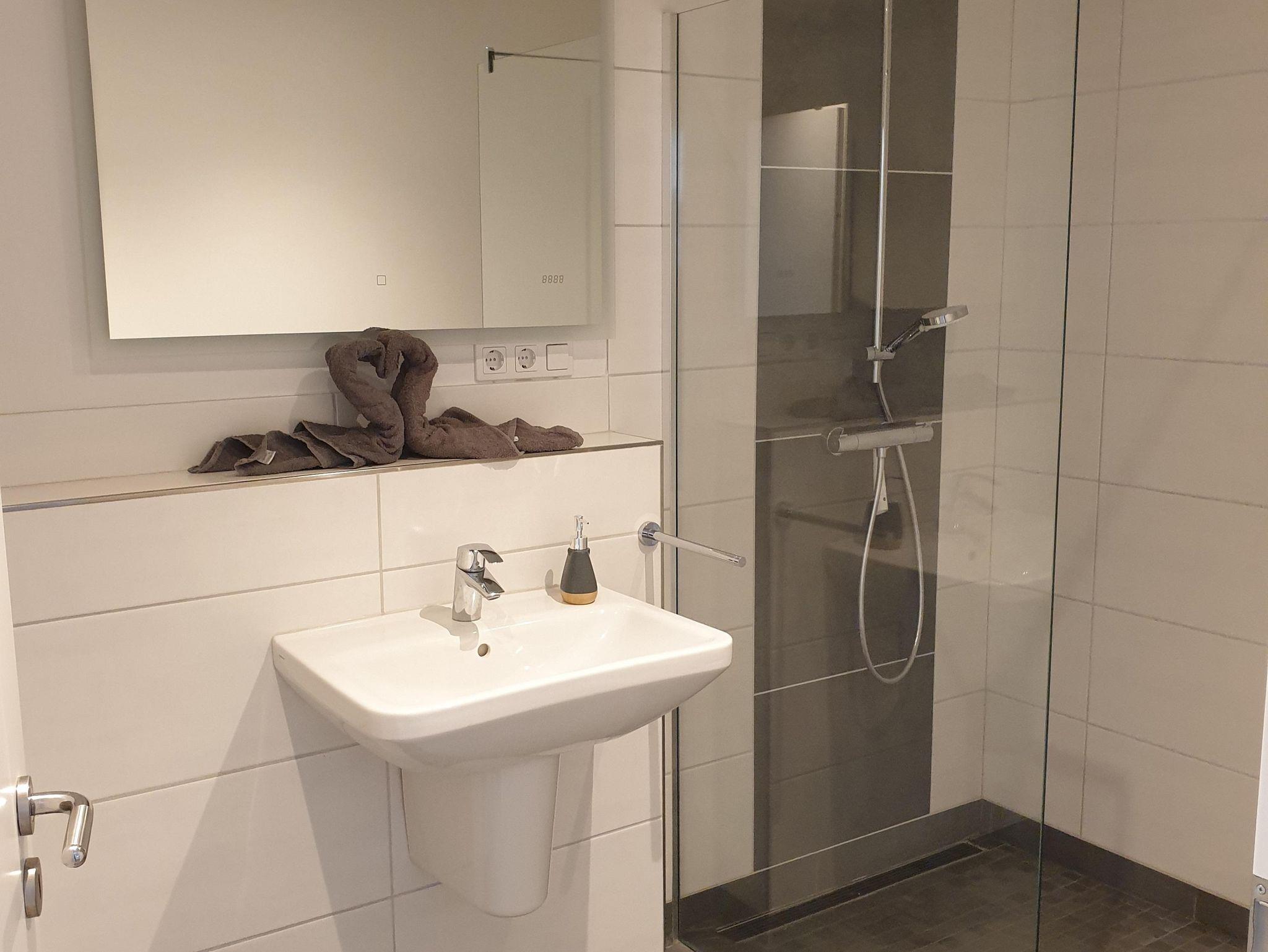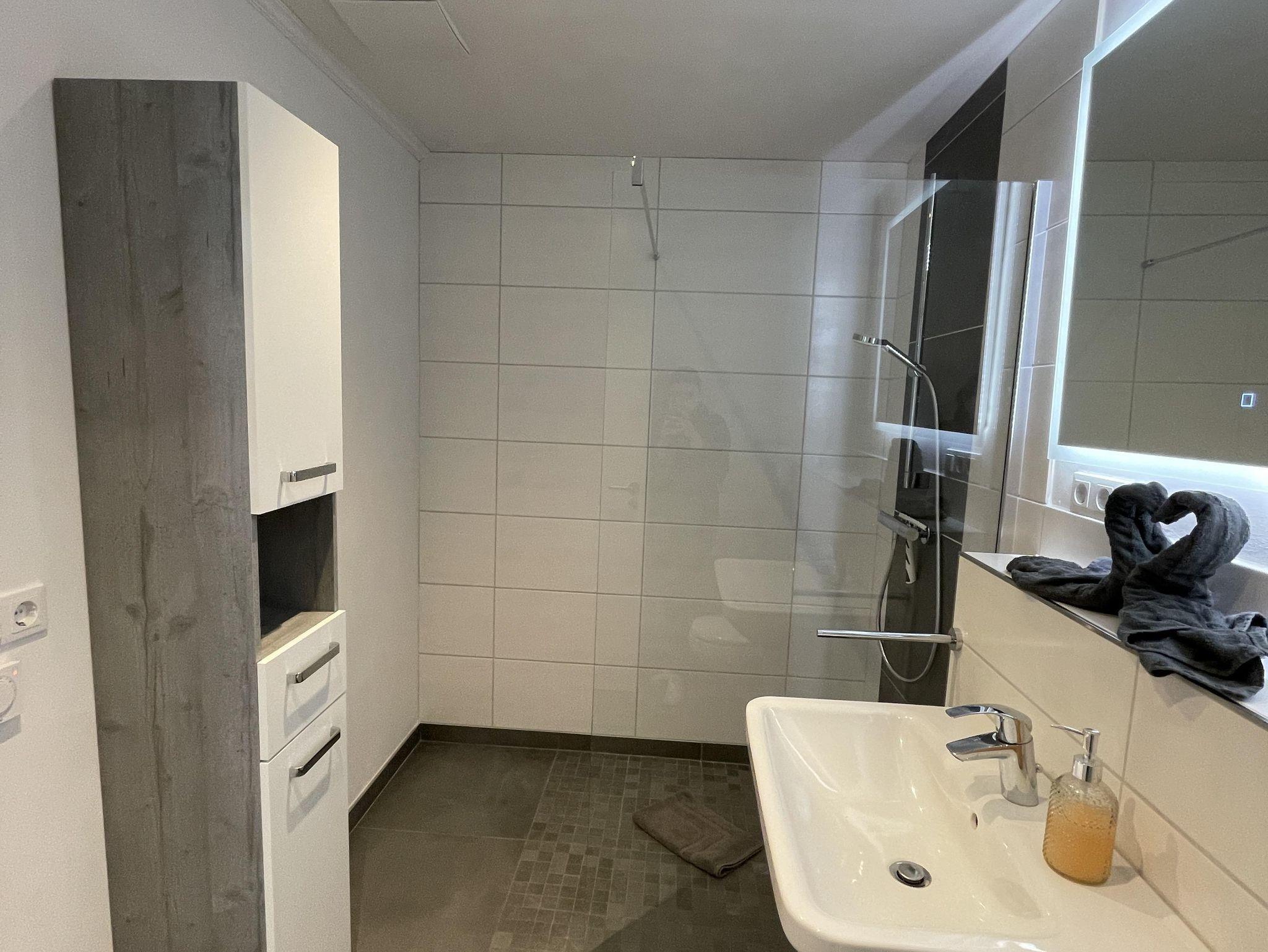 Auch das Badezimmer ist großzügig mit offener Dusche und viel Platz gestaltet. Mit ganz viel Liebe zum Detail liegen hier dekorativ gefaltete Handtücher für Sie bereit.