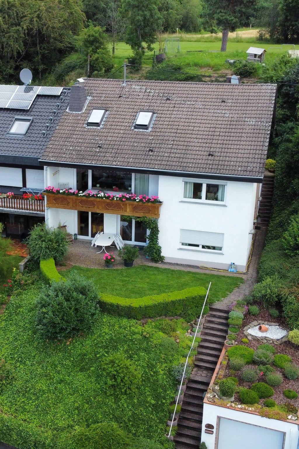 large garden with deckchair, seating area and stainless steel barbecue and views of the Rhine Valley and Eifel.