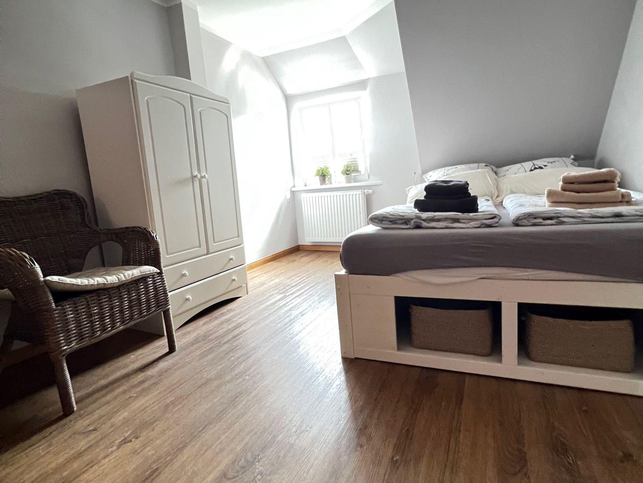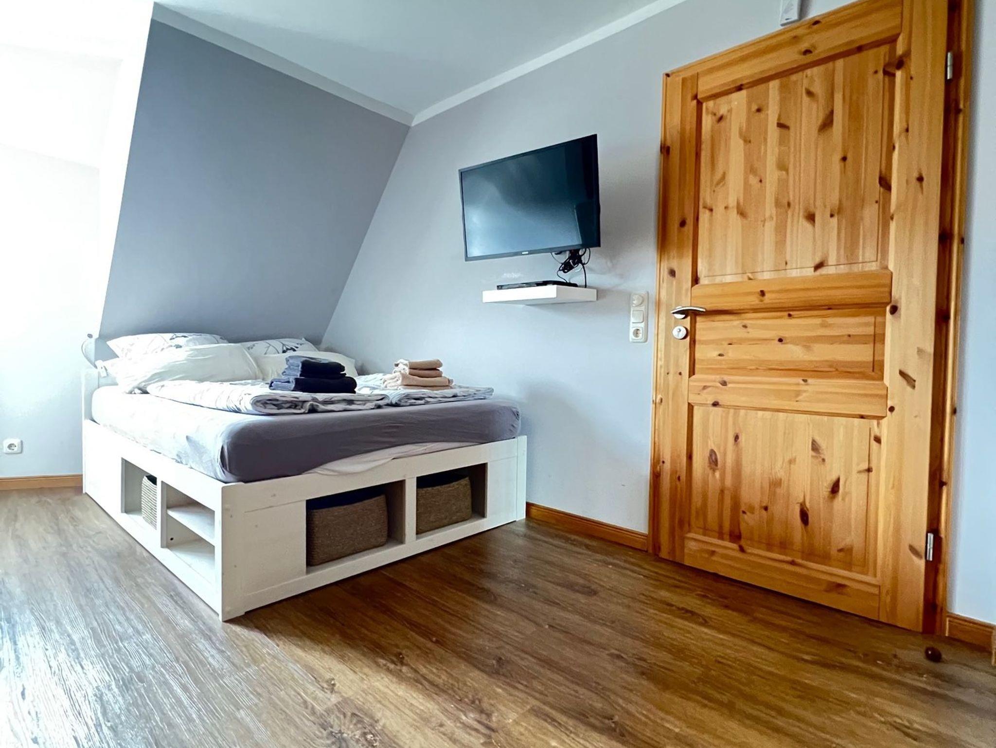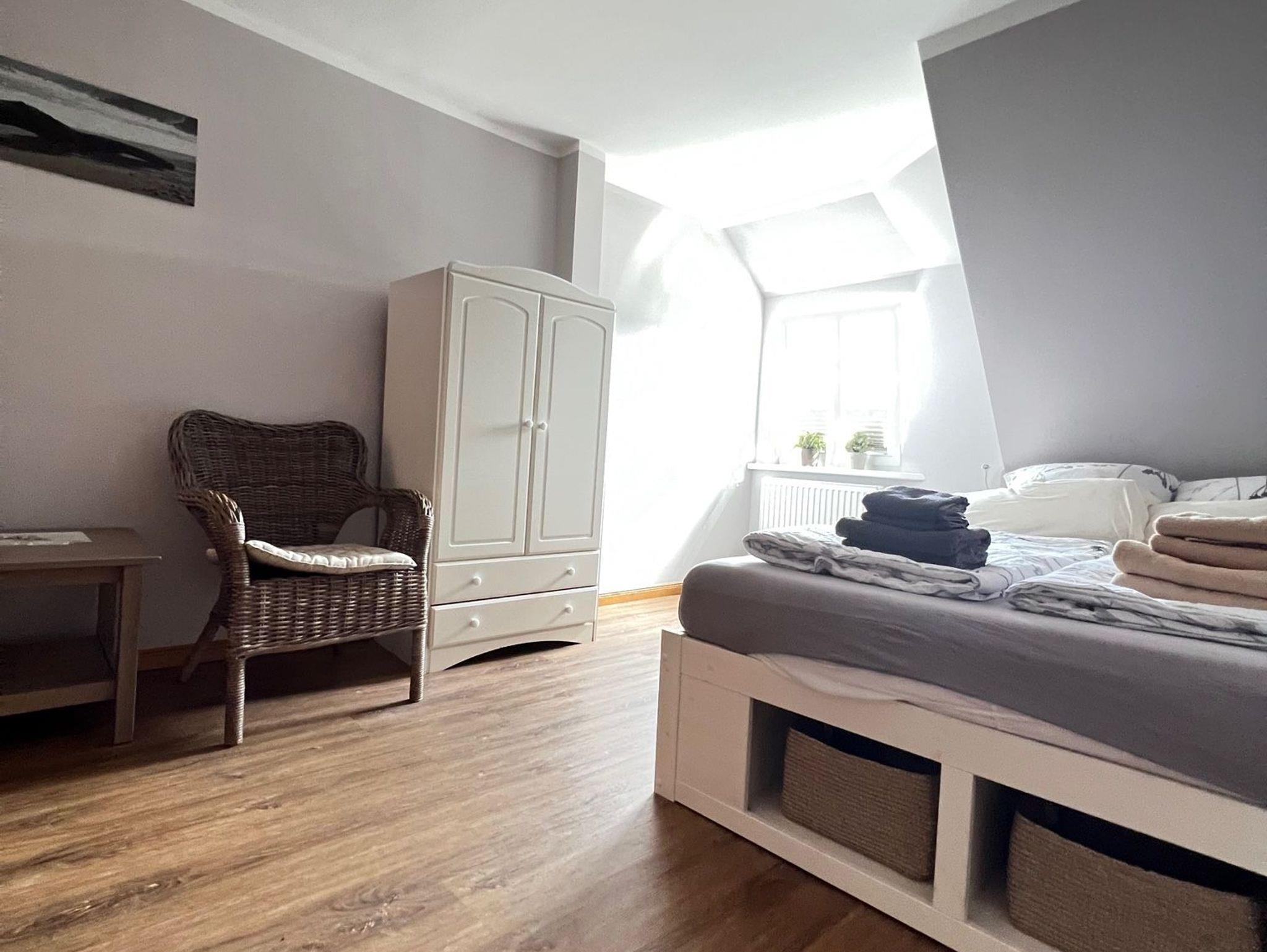 Die Wohnung bietet einen Wohn- und Schlafbereich, eine kleine Küchenzeile zur Selbstverpflegung sowie ein Badezimmer mit Dusche. Die Einrichtung ist zweckmäßig und klar, perfekt für Gäste, die Wert auf Funktionalität und Ruhe legen.