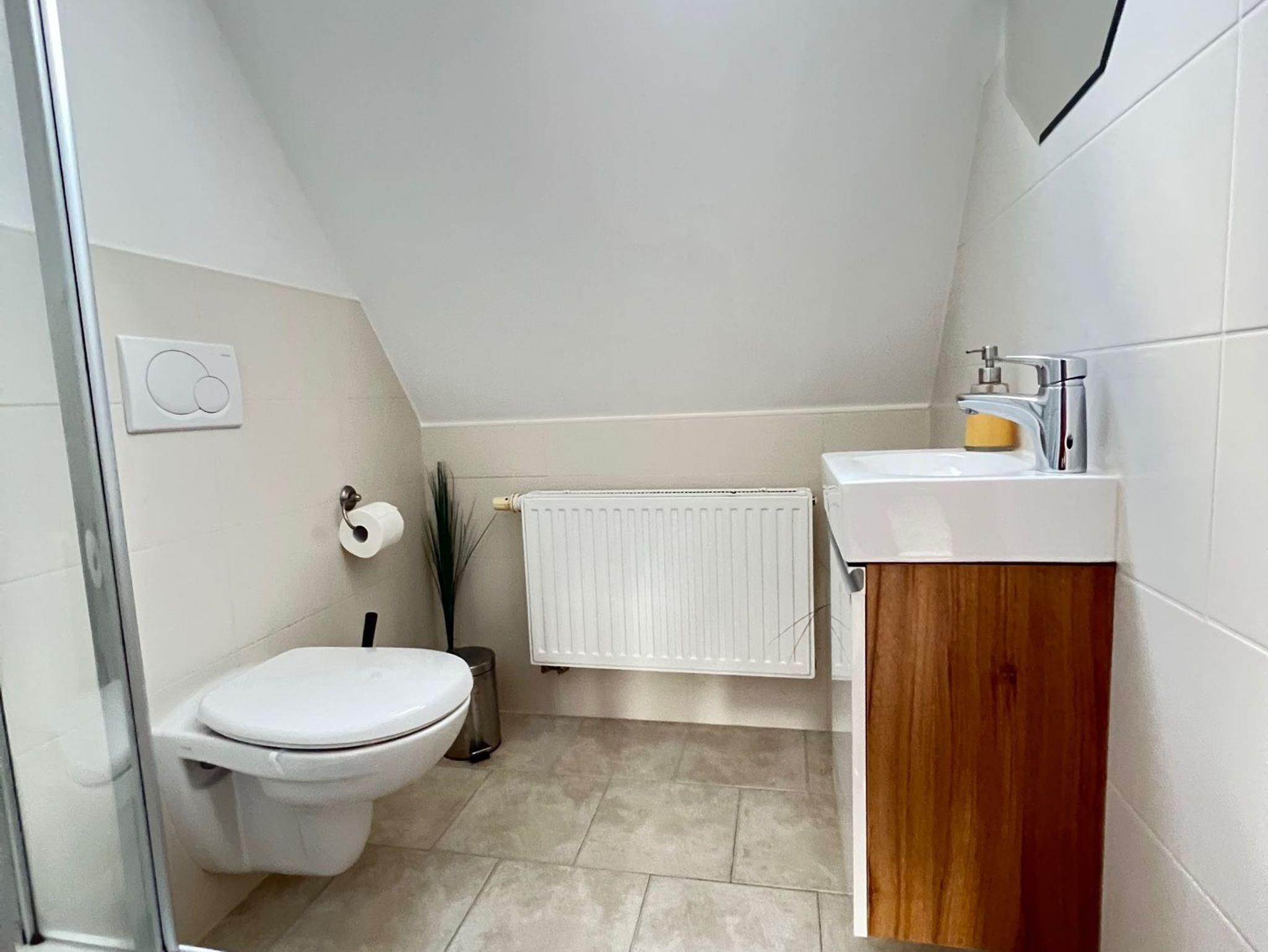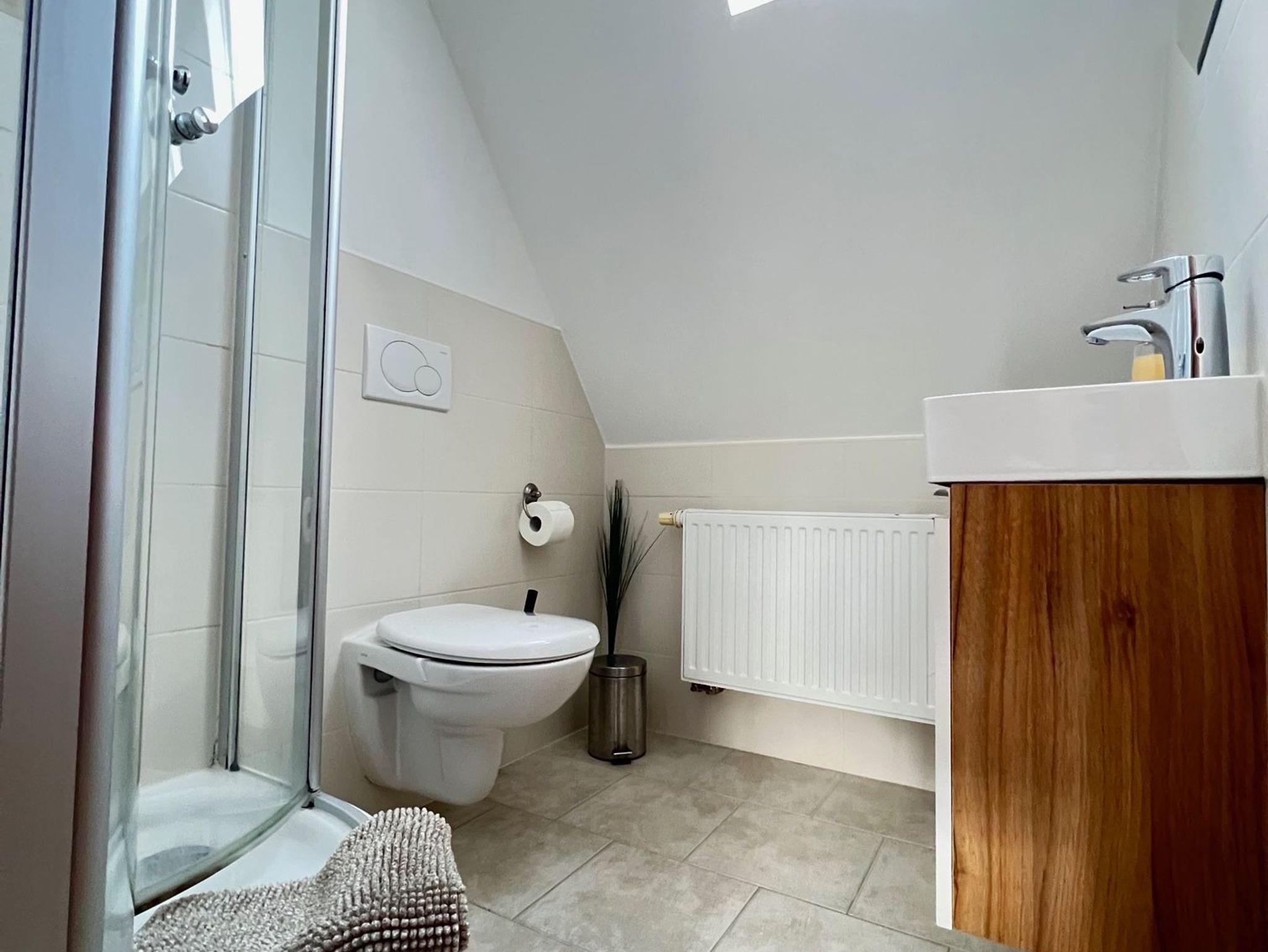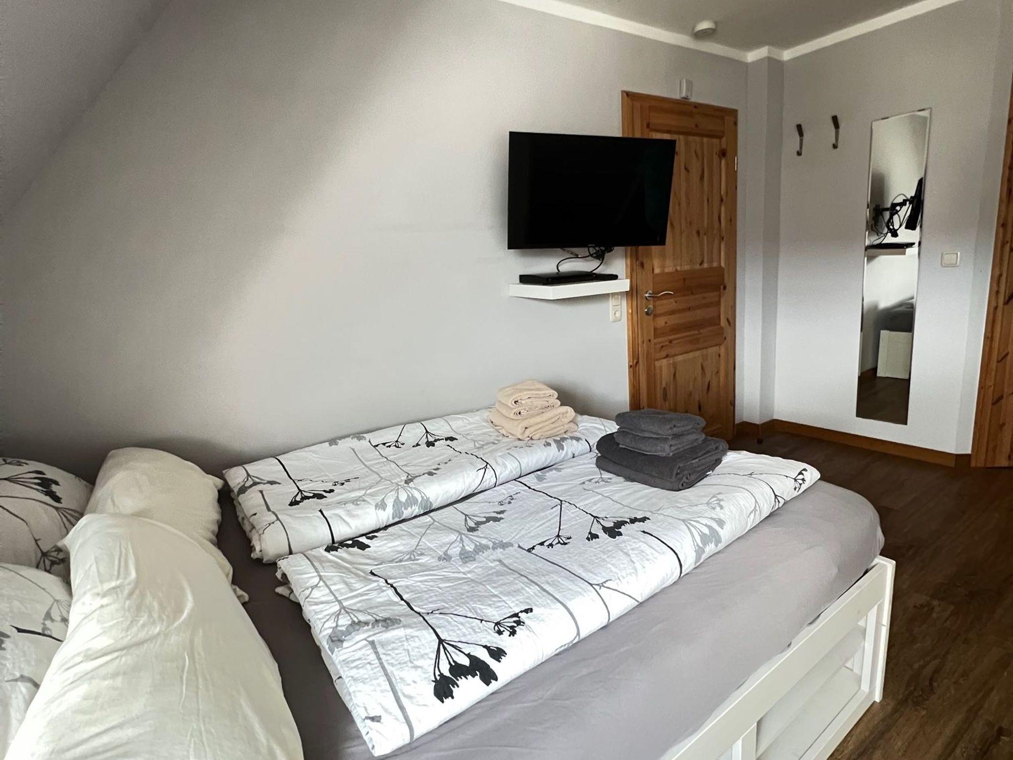 Die Wohnung bietet einen Wohn- und Schlafbereich, eine kleine Küchenzeile zur Selbstverpflegung sowie ein Badezimmer mit Dusche. Die Einrichtung ist zweckmäßig und klar, perfekt für Gäste, die Wert auf Funktionalität und Ruhe legen.