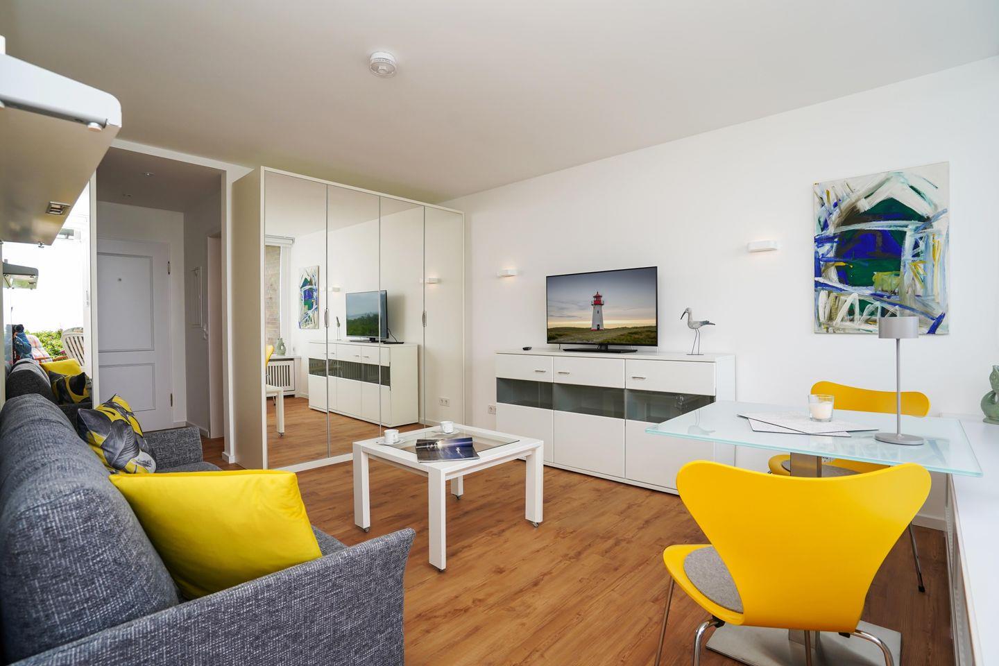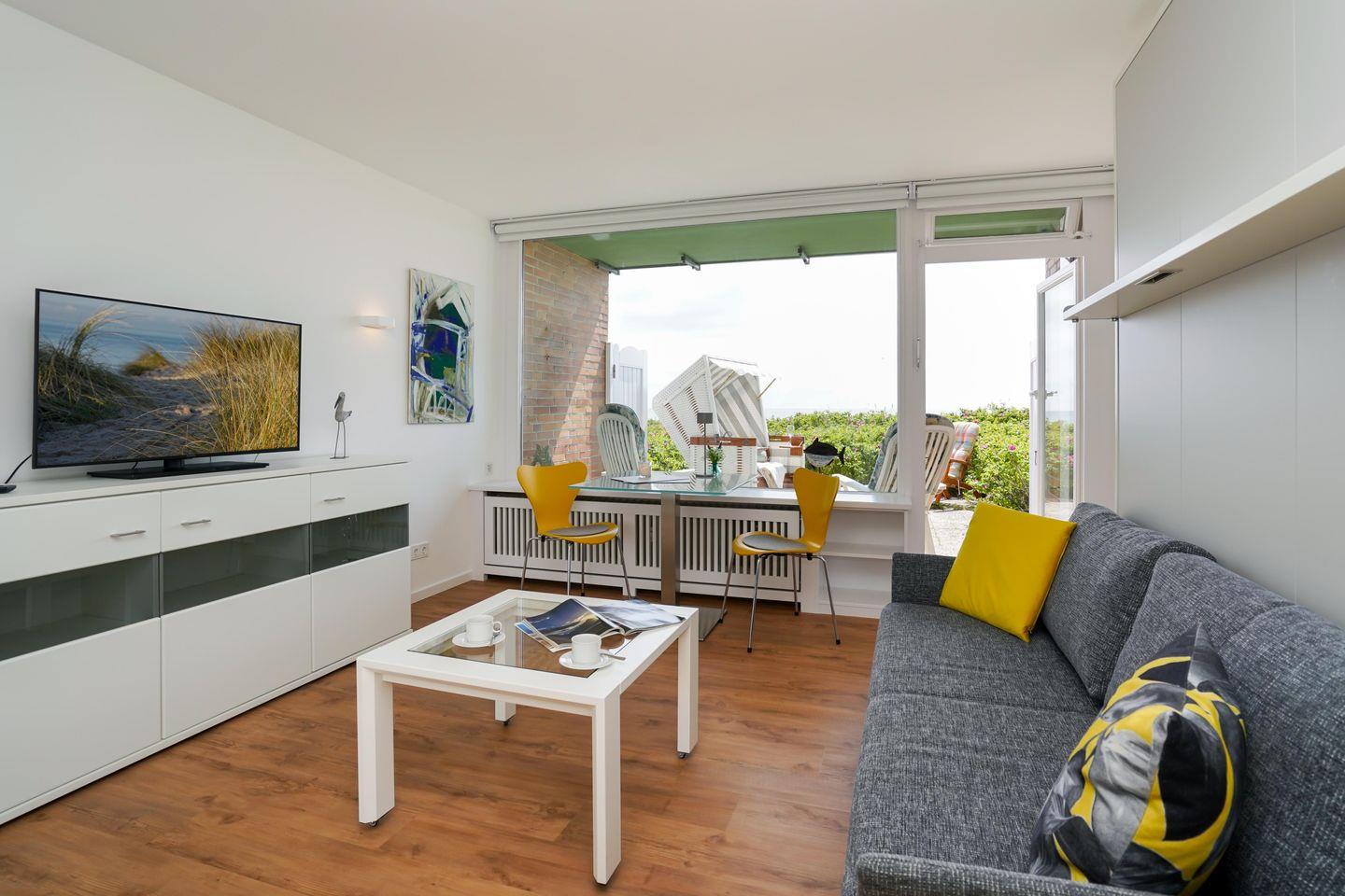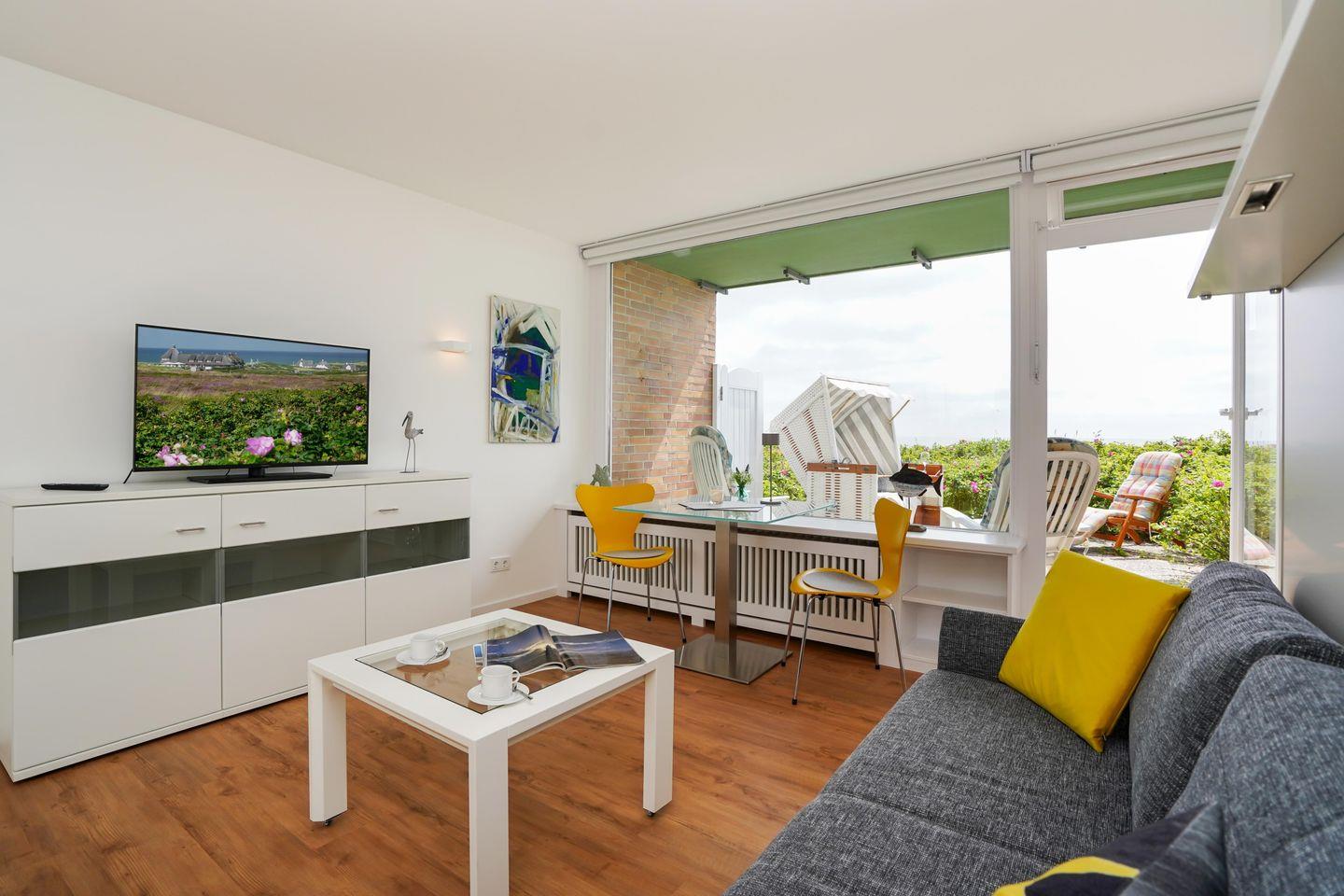 Das moderne 1-Zimmer App. "Strandsonne" für bis zu 2 Personen zeichnet sich durch seine direkte Strandlage sowie einen traumhaften Panorama-Meerblick über das Lister Watt aus. Der Wohn-/Schlafbereich inkl. ausklappbaren Schlafsofa sowie Essecke bietet Ihnen eine Kombination aus hochwertiger Ausstattung und höchstem Komfort. Genießen Sie den einzigartigen Blick sowie die Ruhe von der angrenzenden Frühstücksterrasse. Die kleine Küchenzeile samt Geschirrspüler ist voll ausgestattet. Das Badezimmer verfügt über eine Dusche. WLAN steht Ihnen kostenfrei zur Verfügung. Haustiere sind erlaubt. Der Fahrstuhl des Apartmenthauses ist nur über Treppenstufen erreichbar. Die Ferienunterkunft verfügt über keinen zugehörigen PKW-Stellplatz, nutzen Sie bitte die öffentlichen Stellplätze A-D.