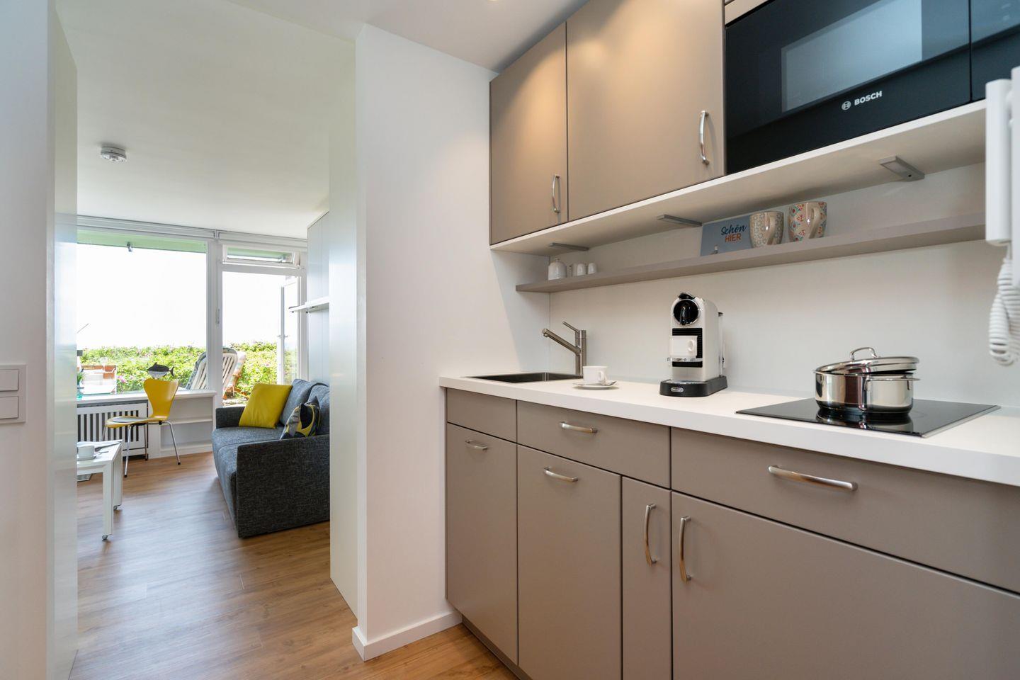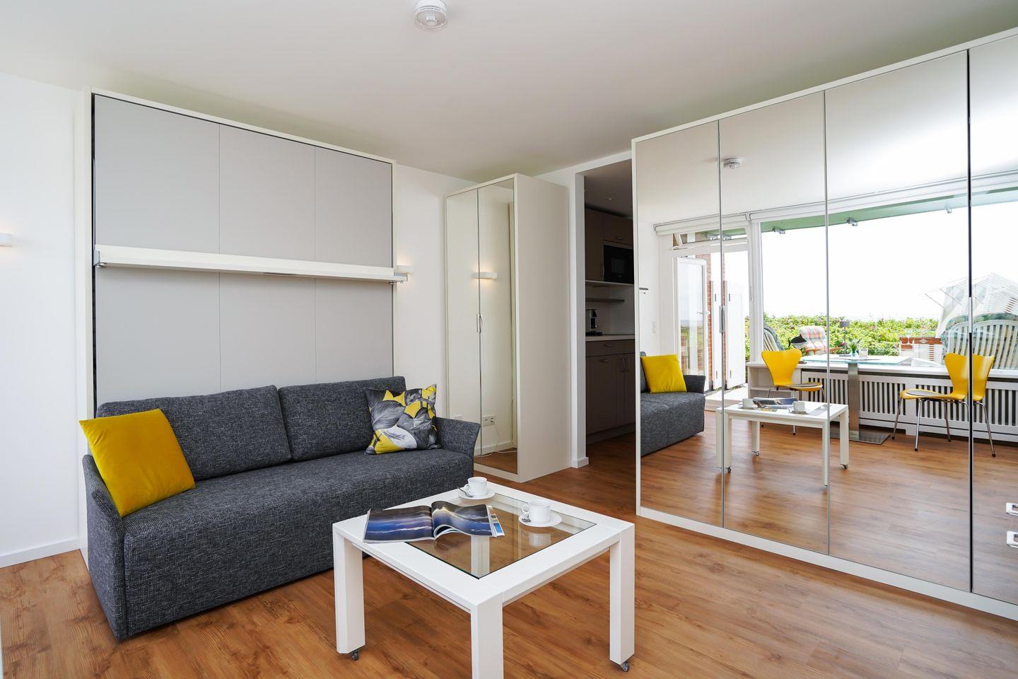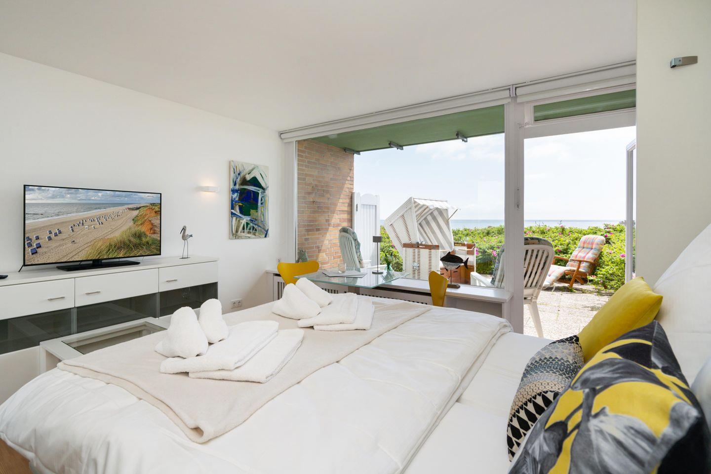 Das moderne 1-Zimmer App. "Strandsonne" für bis zu 2 Personen zeichnet sich durch seine direkte Strandlage sowie einen traumhaften Panorama-Meerblick über das Lister Watt aus. Der Wohn-/Schlafbereich inkl. ausklappbaren Schlafsofa sowie Essecke bietet Ihnen eine Kombination aus hochwertiger Ausstattung und höchstem Komfort. Genießen Sie den einzigartigen Blick sowie die Ruhe von der angrenzenden Frühstücksterrasse. Die kleine Küchenzeile samt Geschirrspüler ist voll ausgestattet. Das Badezimmer verfügt über eine Dusche. WLAN steht Ihnen kostenfrei zur Verfügung. Haustiere sind erlaubt. Der Fahrstuhl des Apartmenthauses ist nur über Treppenstufen erreichbar. Die Ferienunterkunft verfügt über keinen zugehörigen PKW-Stellplatz, nutzen Sie bitte die öffentlichen Stellplätze A-D.