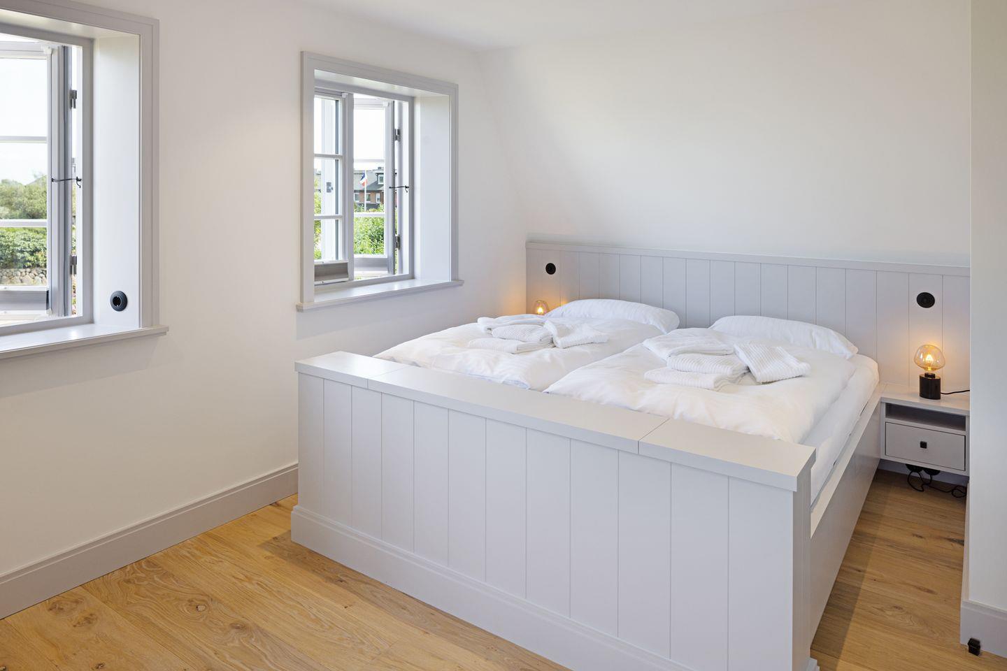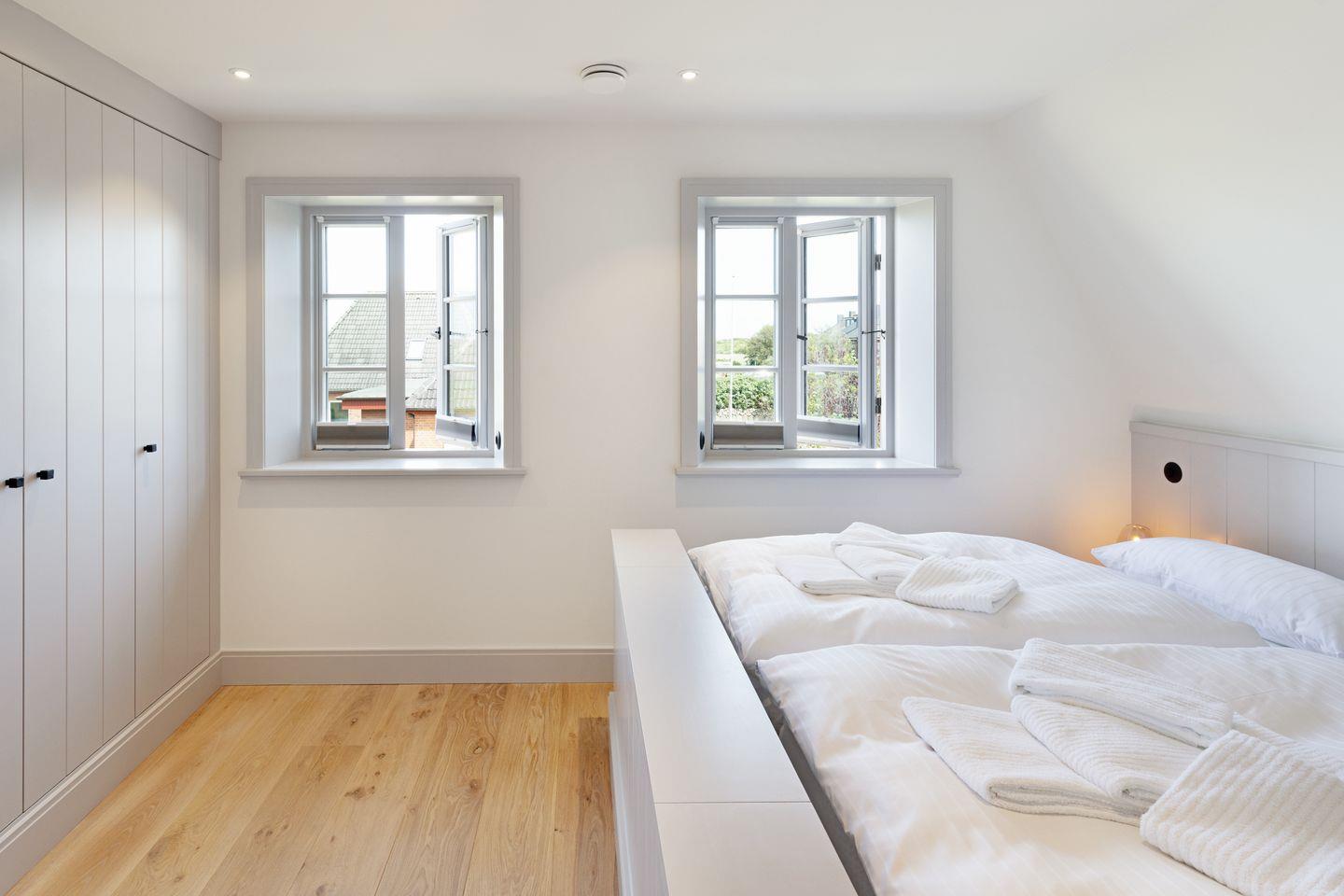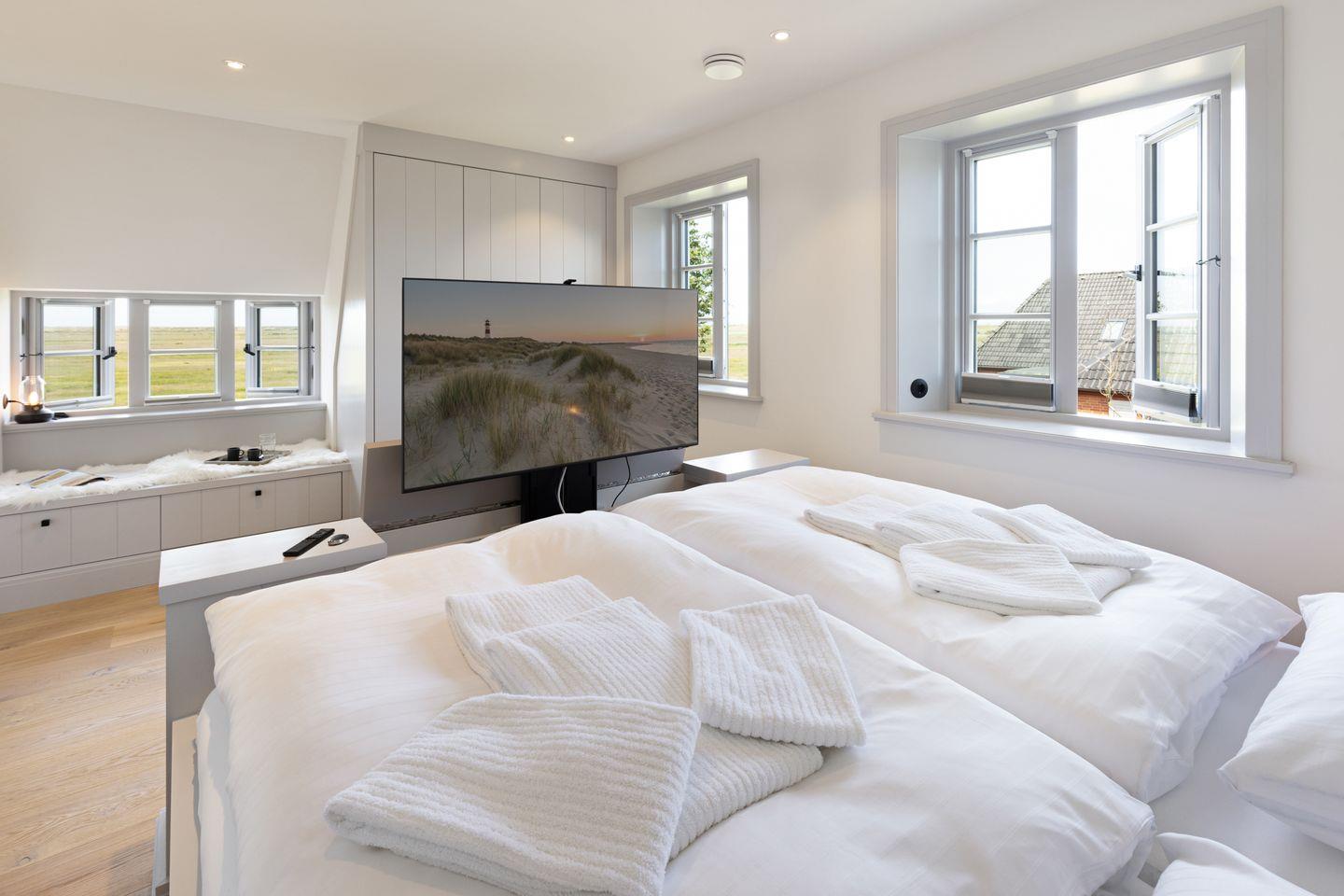 Im Obergeschoss befinden sich zwei komfortable Schlafzimmer, jeweils ausgestattet mit Doppelbett und Fernseher. Beide Zimmer bieten einen herrlichen, freien Blick auf die Lister Fenne und schaffen eine besonders ruhige und erholsame Schlafatmosphäre. Ergänzt wird diese Etage durch ein modernes Badezimmer mit Dusche sowie ein weiteres Gäste-WC.