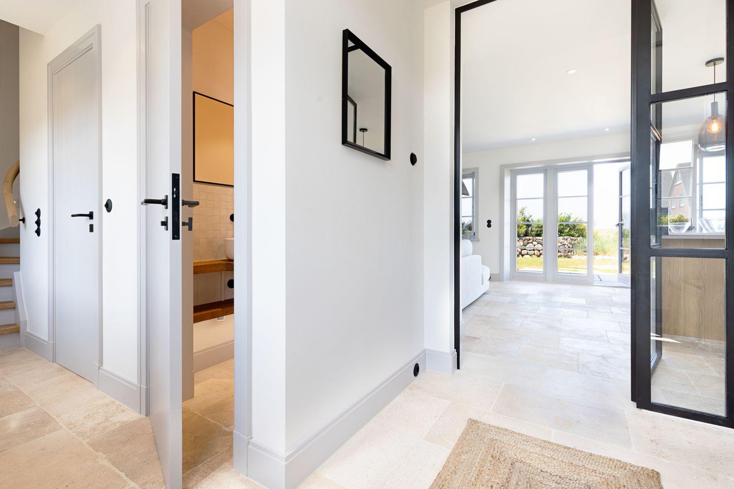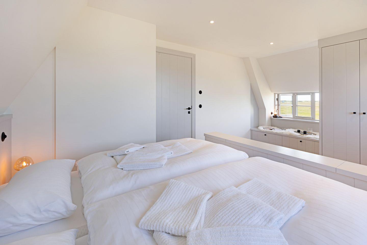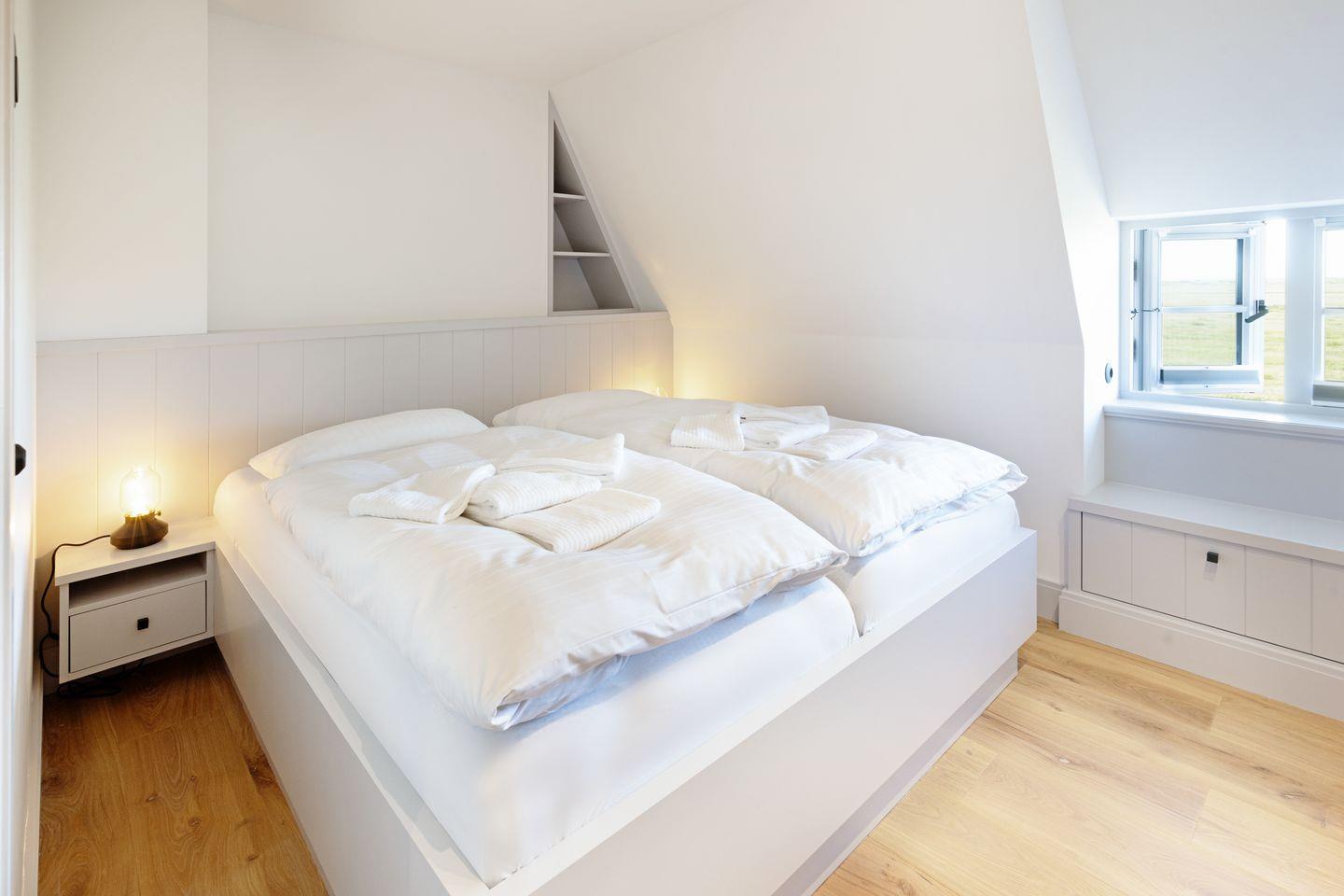 Im Obergeschoss befinden sich zwei komfortable Schlafzimmer, jeweils ausgestattet mit Doppelbett und Fernseher. Beide Zimmer bieten einen herrlichen, freien Blick auf die Lister Fenne und schaffen eine besonders ruhige und erholsame Schlafatmosphäre. Ergänzt wird diese Etage durch ein modernes Badezimmer mit Dusche sowie ein weiteres Gäste-WC.