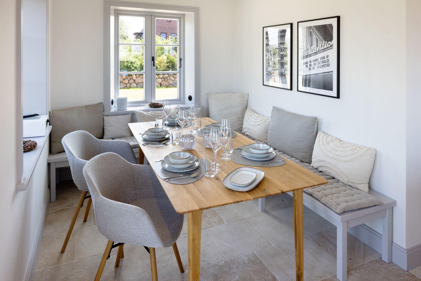 Ein besonderes Highlight ist der großzügige Außenbereich: Der weitläufige Garten mit zwei Terrassen eröffnet Ihnen einen direkten Blick auf das Naturschutzgebiet. Hier können Sie die Ruhe der Umgebung und die frische Nordseeluft in vollen Zügen genießen. Gartenmöbel sowie ein Strandkorb stehen Ihnen saisonal zur Verfügung und laden zum Verweilen im Freien ein.