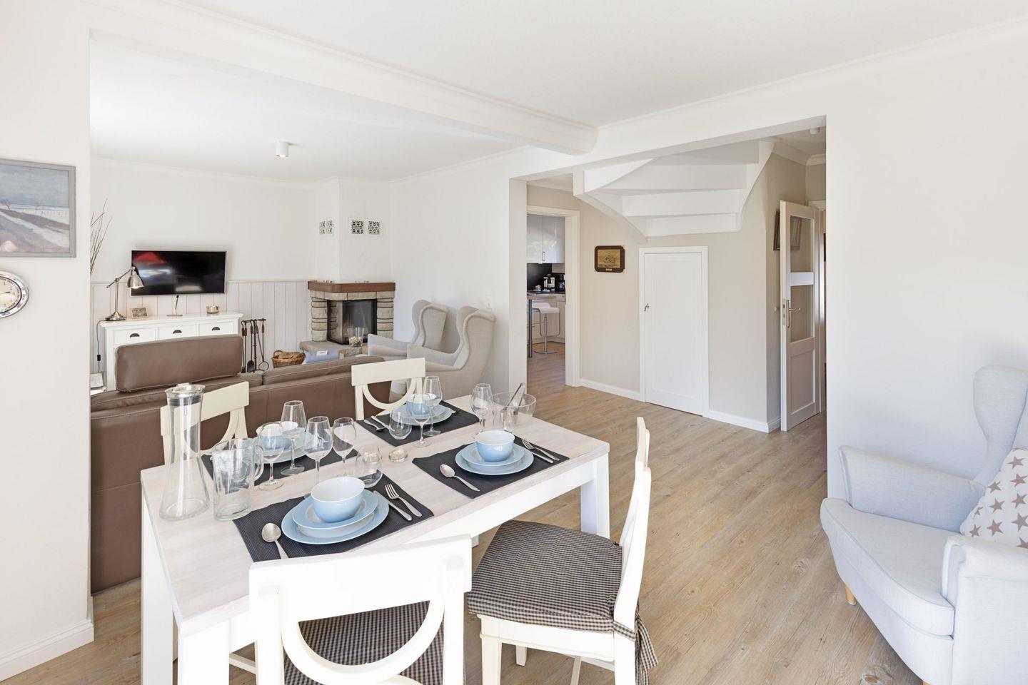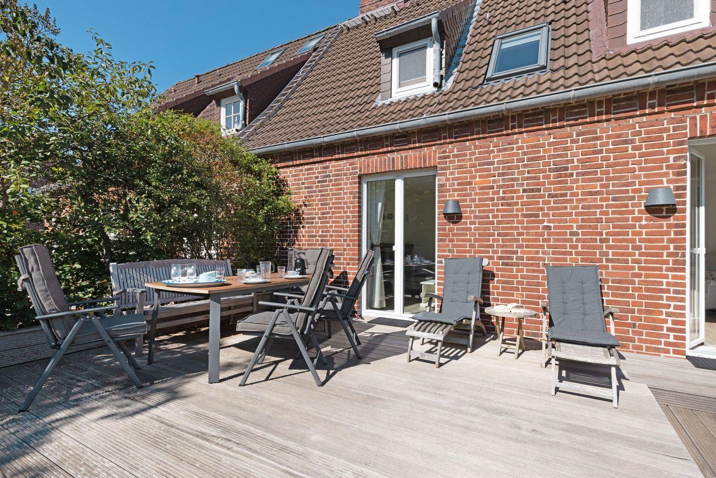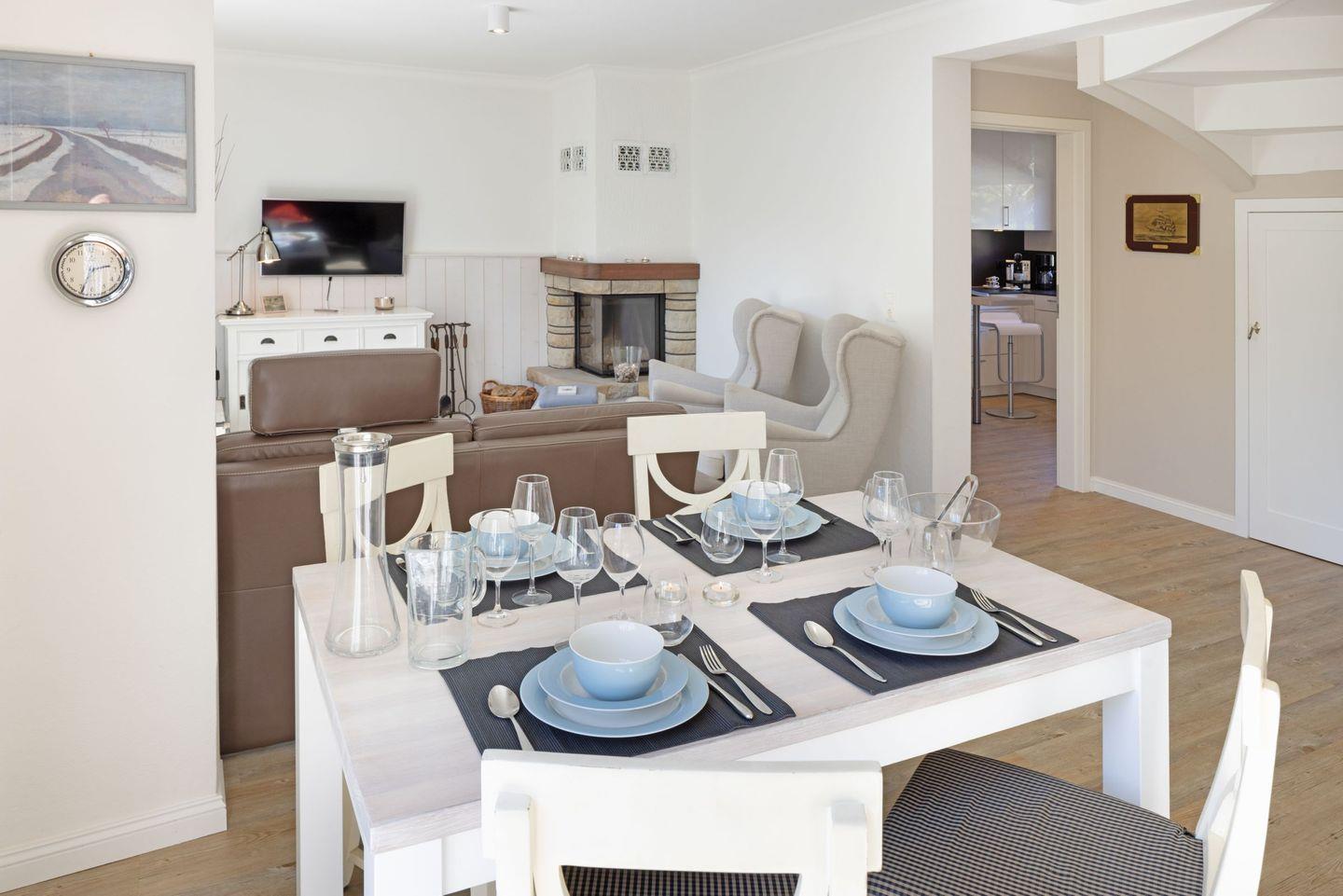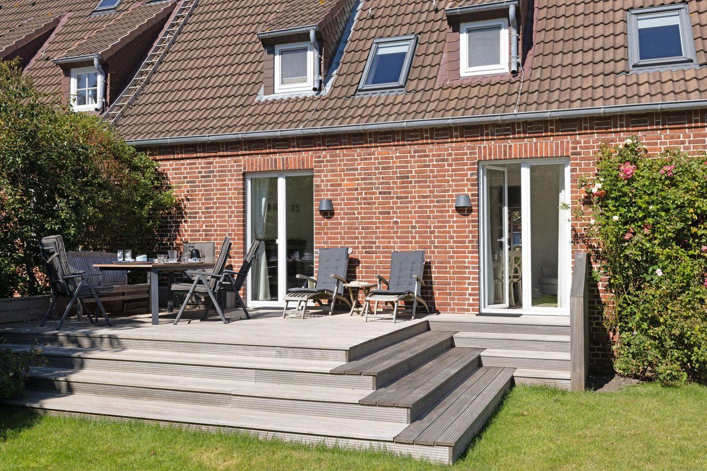 Großzügiges familienfreundliches Feriendoppelhaus für vier Personen mit Kamin, Terrasse und Strandkorb.