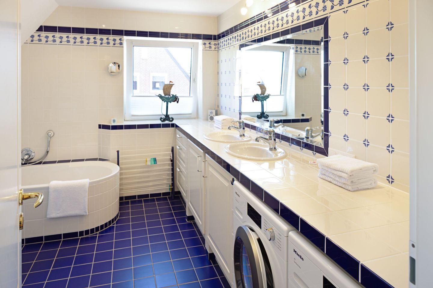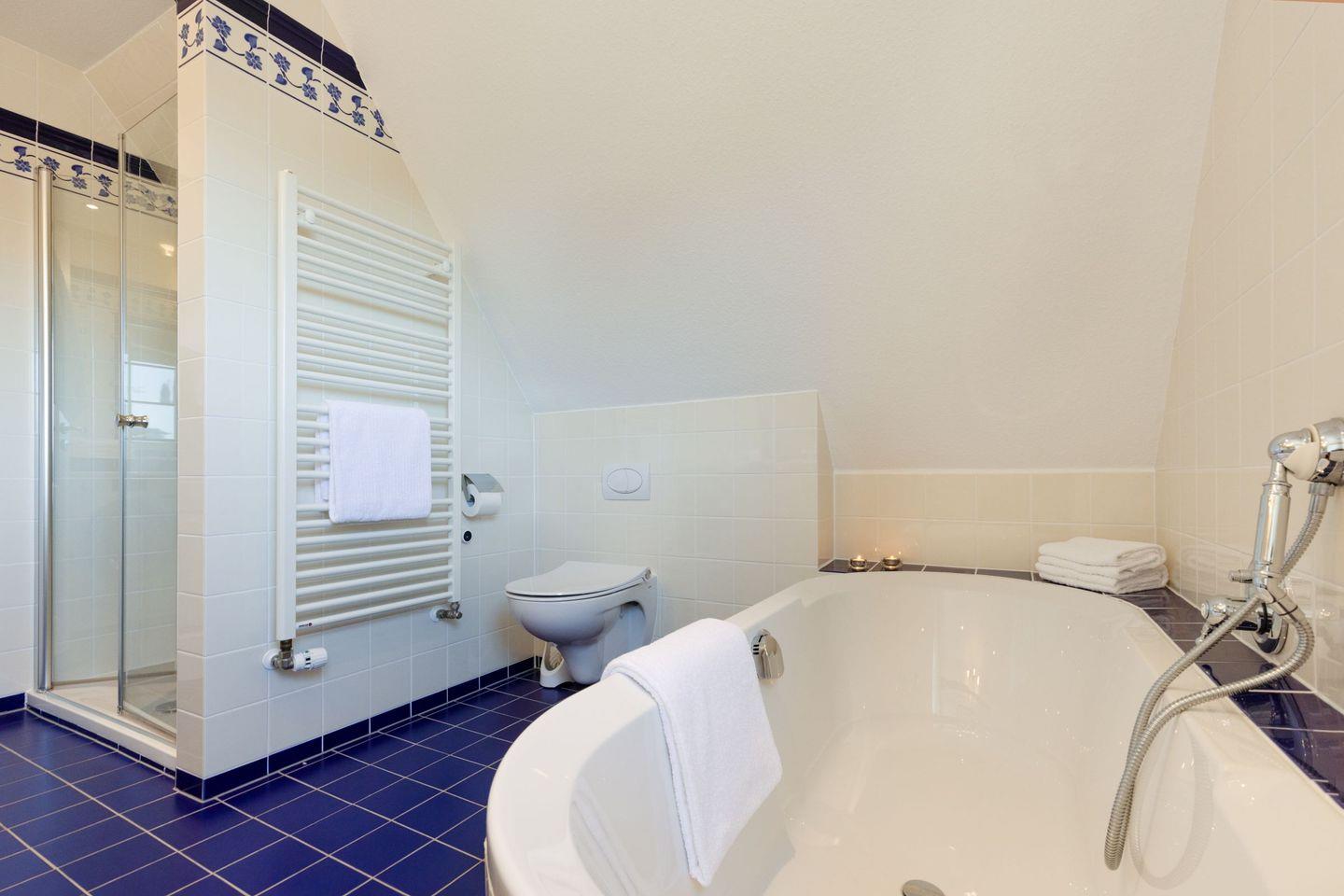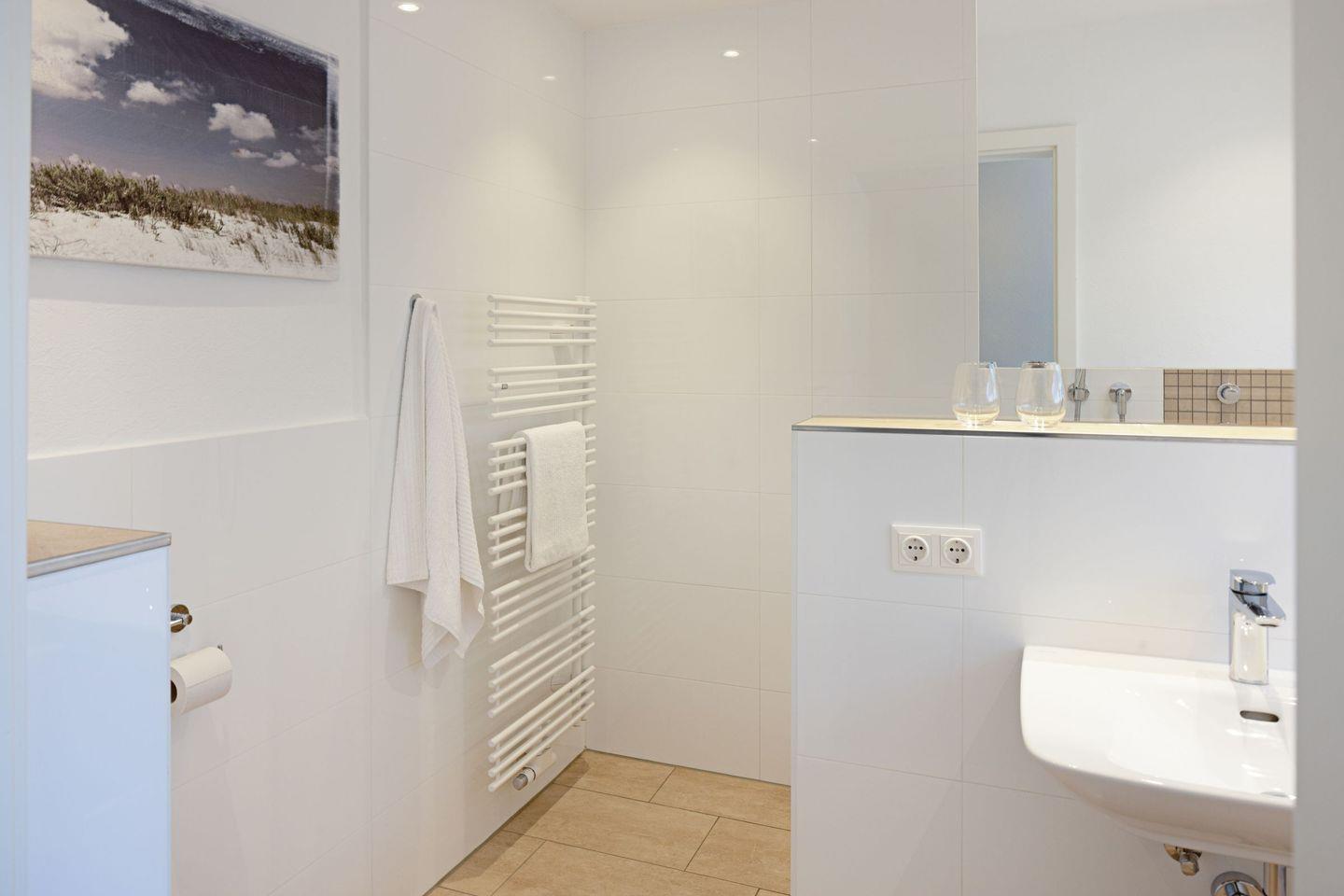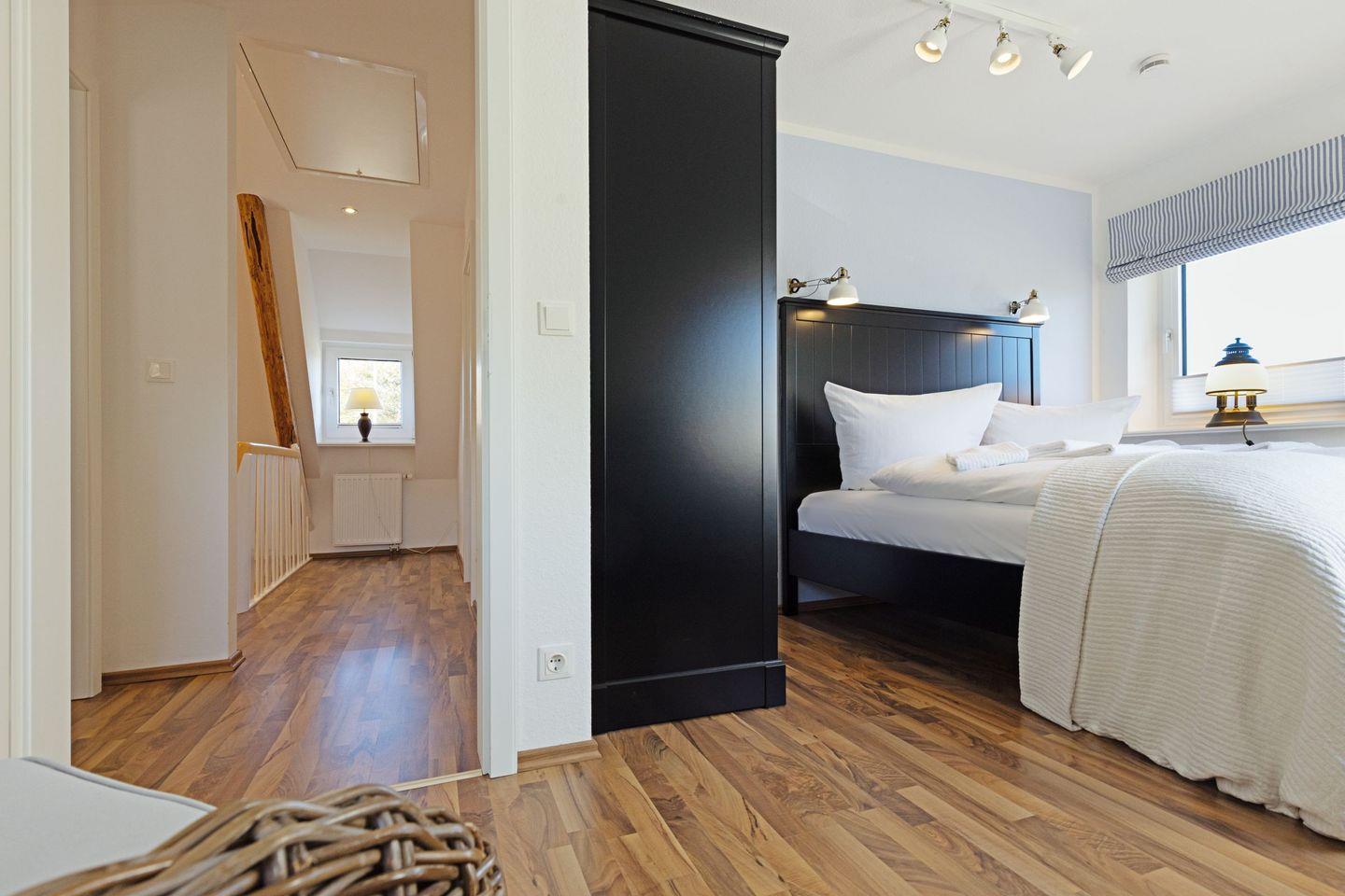 Zwei Schlafzimmer mit jeweils einem Doppelbett und ein Bad mit Badewanne und Dusche befinden sich in der 1. Etage.