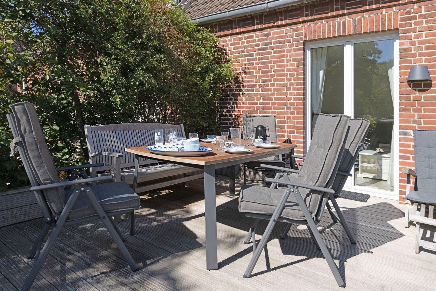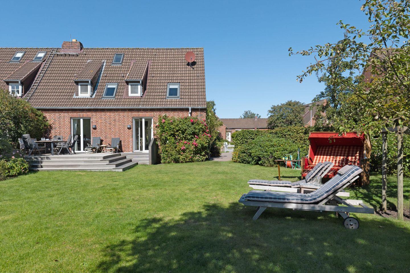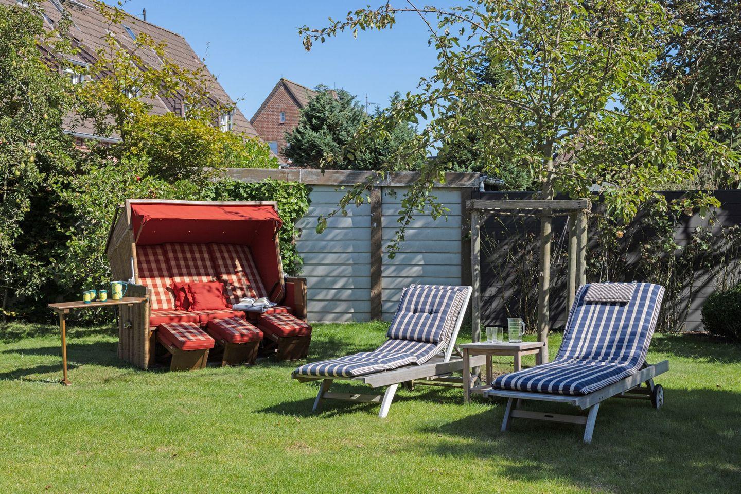 Im Außenbereich lädt Ihr großzügiger Garten mit Terrasse (saisonal Gartenmöbel und Strandkorb) zum Relaxen ein. Waschmaschine und Trockner sind vorhanden.