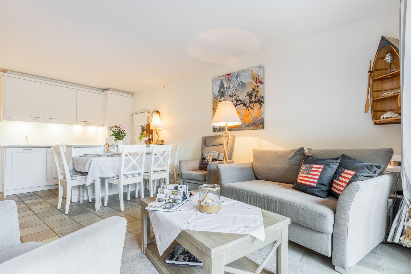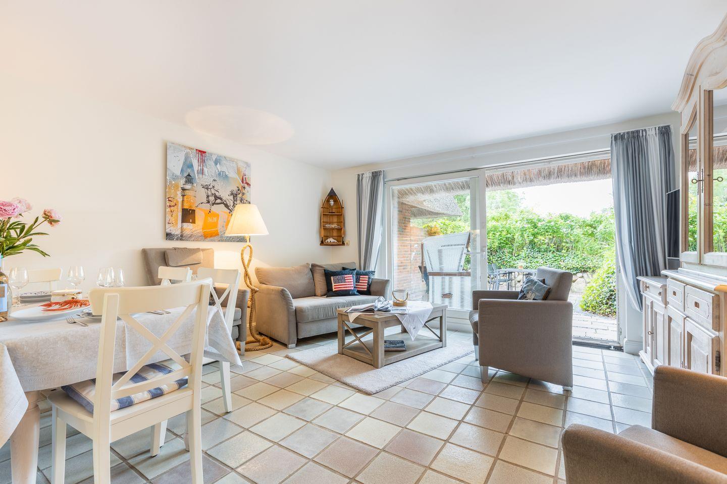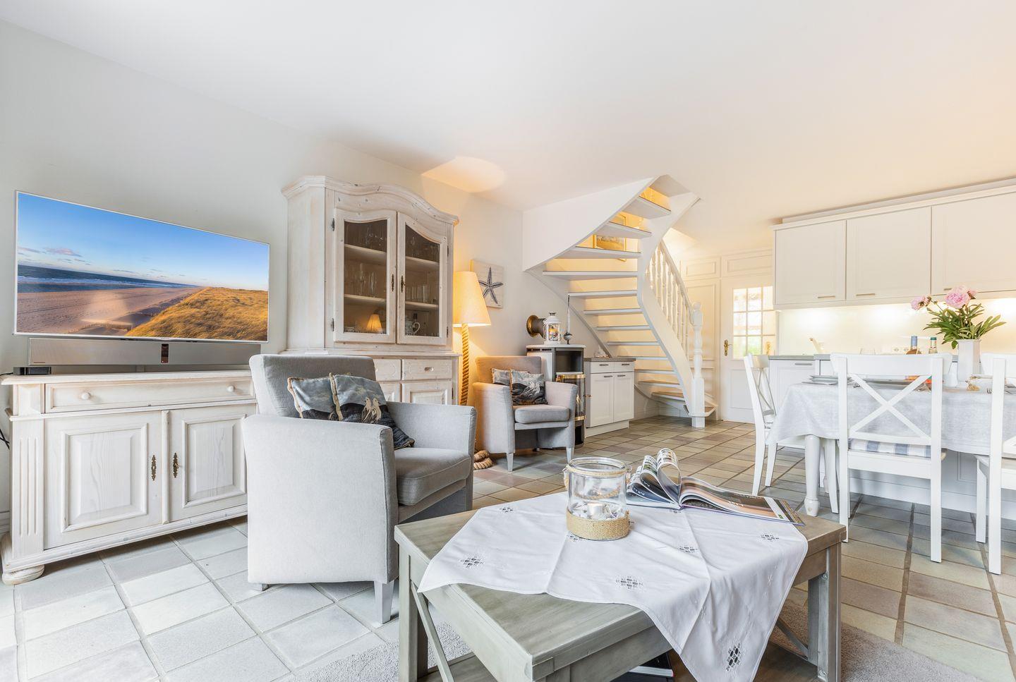 Erdgeschoss: Durch einen sehr schön mit Dünengras angelegten Außenbereich gelangen Sie über eine kleine Diele in den Wohnbereich. Dieser bietet Ihnen viel Platz, ein schönes Wohnambiente und ist durch seine Südausrichtung sonnendurchflutet. Sat TV, Mini Hifianlage, schnelles WLAN (über Glasfaser-Internetanschluss 250/40 Mbit) im Haus und Garten sowie Entertainment über vorhandene Smart-TV‘s möglich. Ihre im März 2014 neu installierte Küche ist in den Wohnbereich integriert.