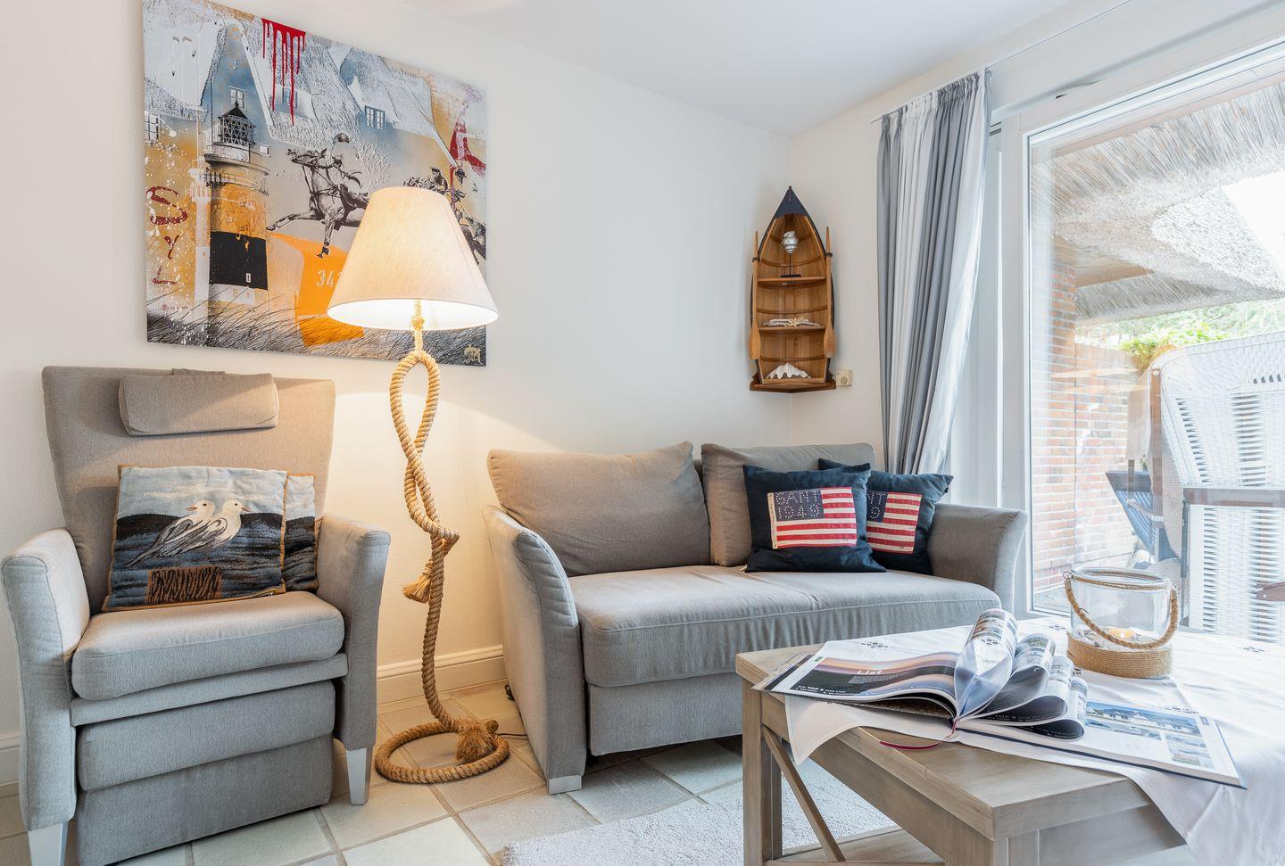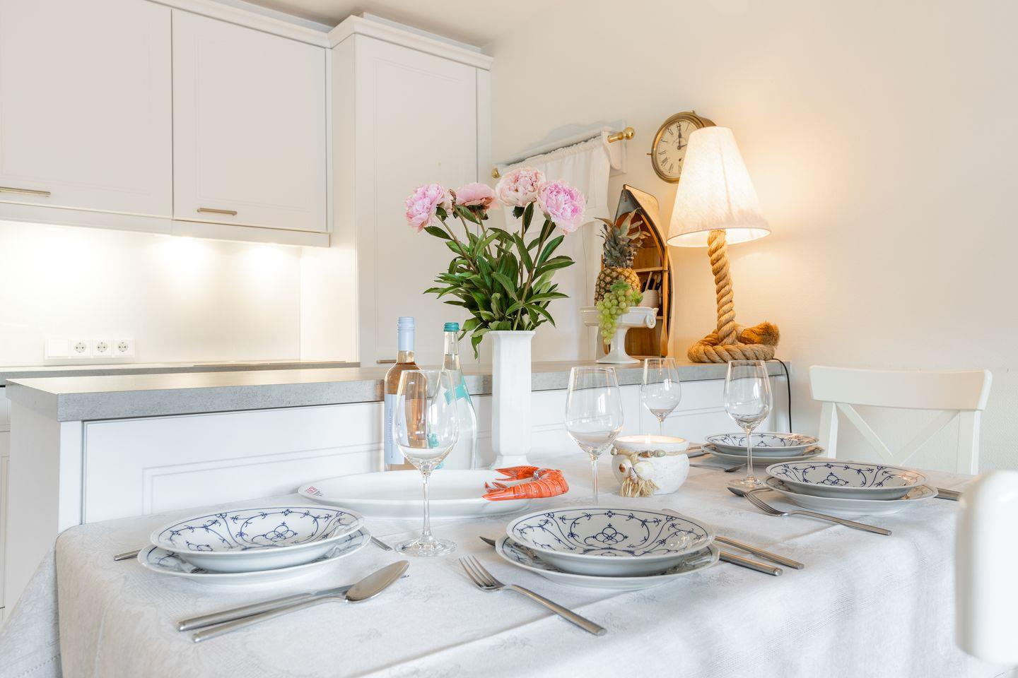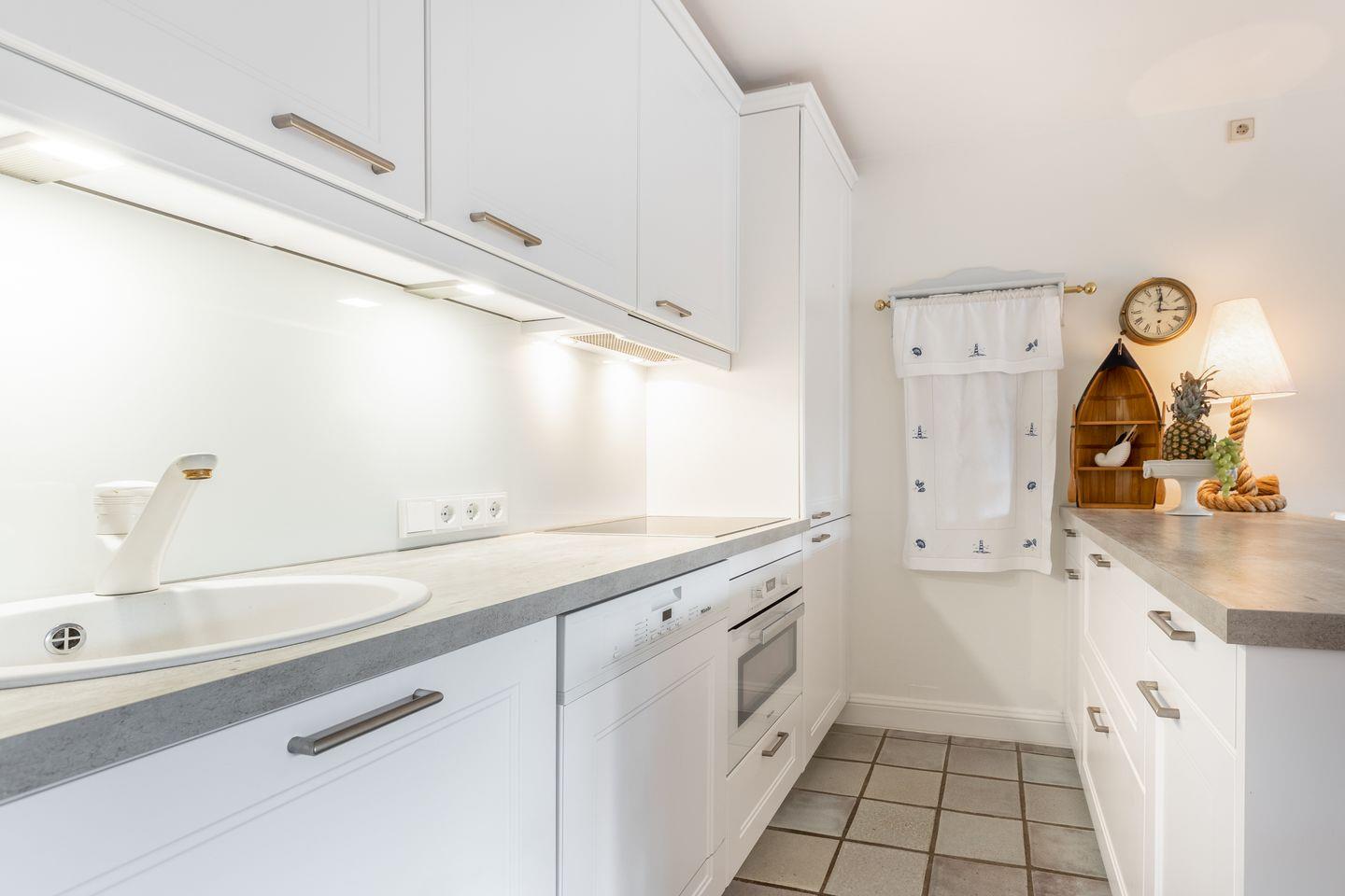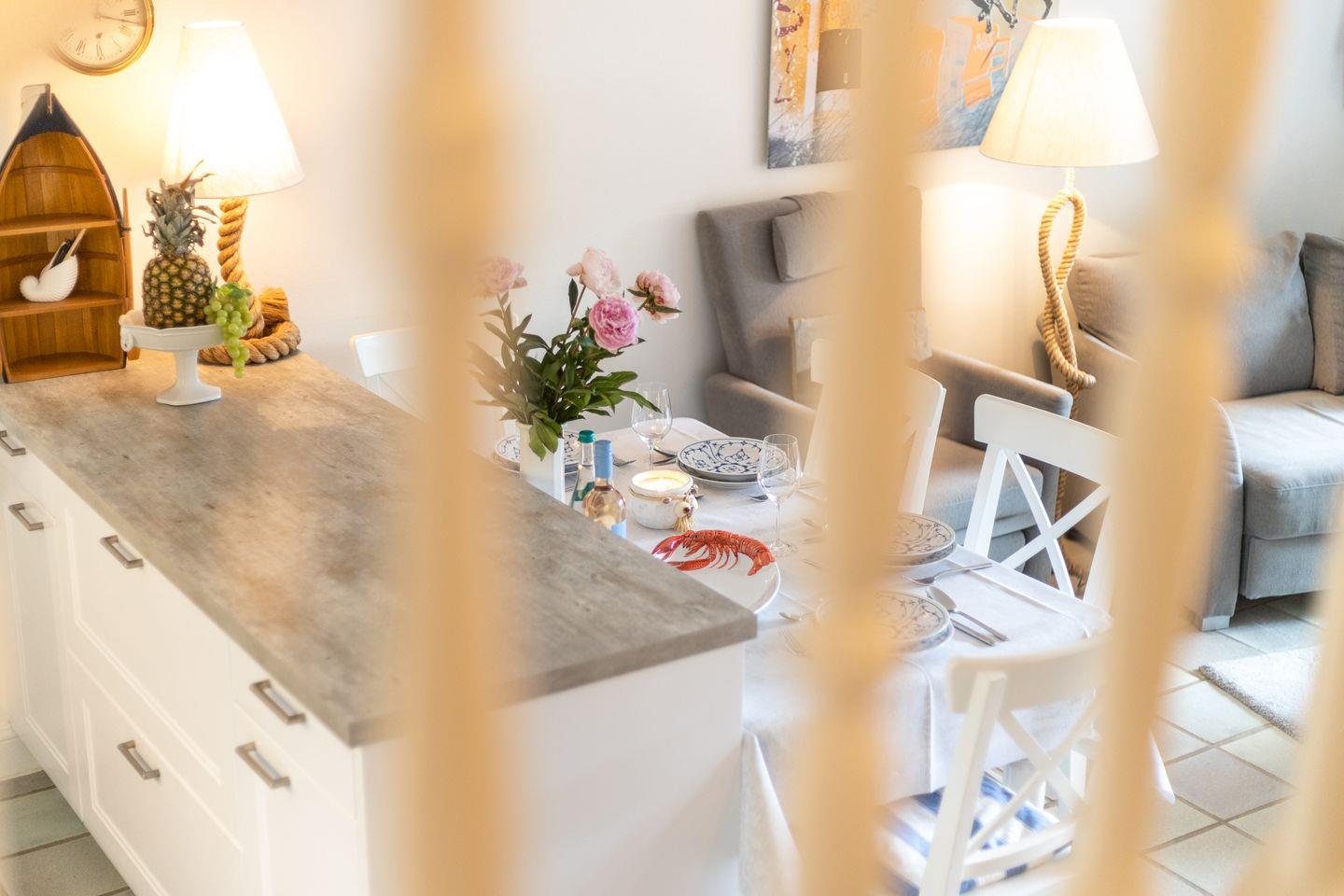 Erdgeschoss: Durch einen sehr schön mit Dünengras angelegten Außenbereich gelangen Sie über eine kleine Diele in den Wohnbereich. Dieser bietet Ihnen viel Platz, ein schönes Wohnambiente und ist durch seine Südausrichtung sonnendurchflutet. Sat TV, Mini Hifianlage, schnelles WLAN (über Glasfaser-Internetanschluss 250/40 Mbit) im Haus und Garten sowie Entertainment über vorhandene Smart-TV‘s möglich. Ihre im März 2014 neu installierte Küche ist in den Wohnbereich integriert.