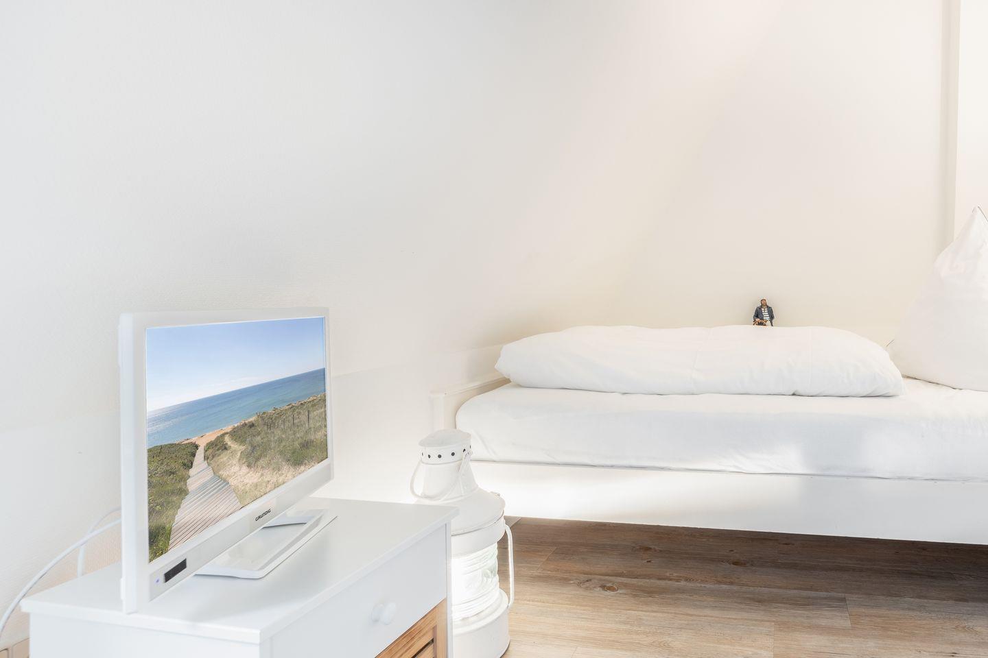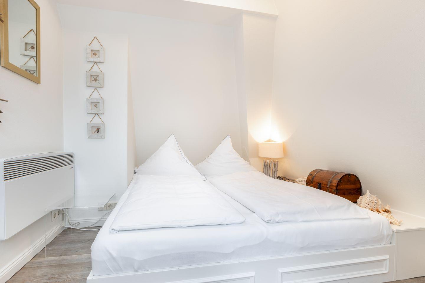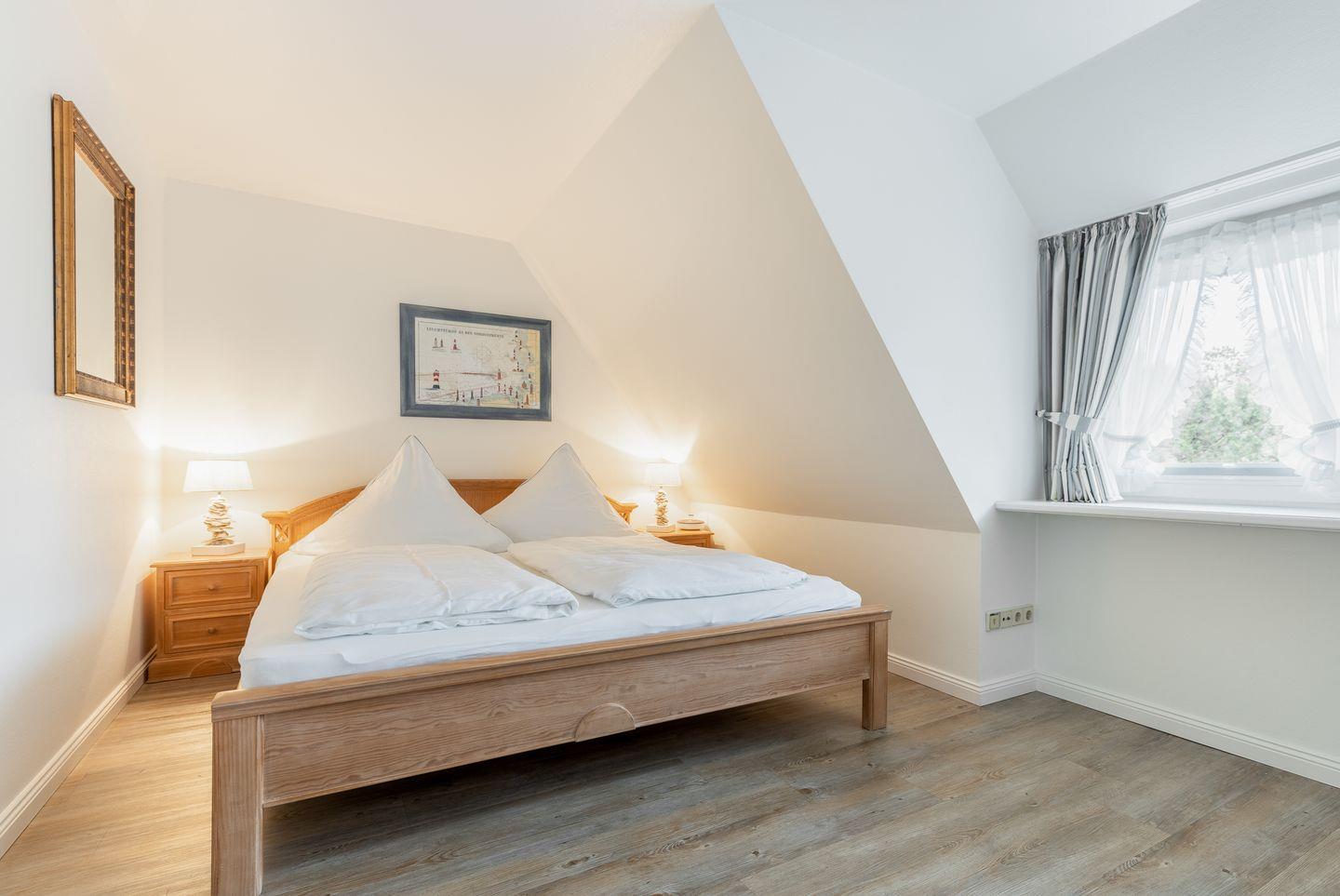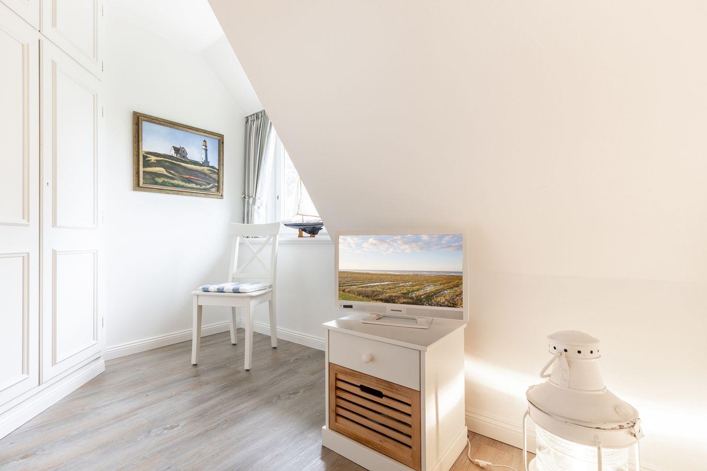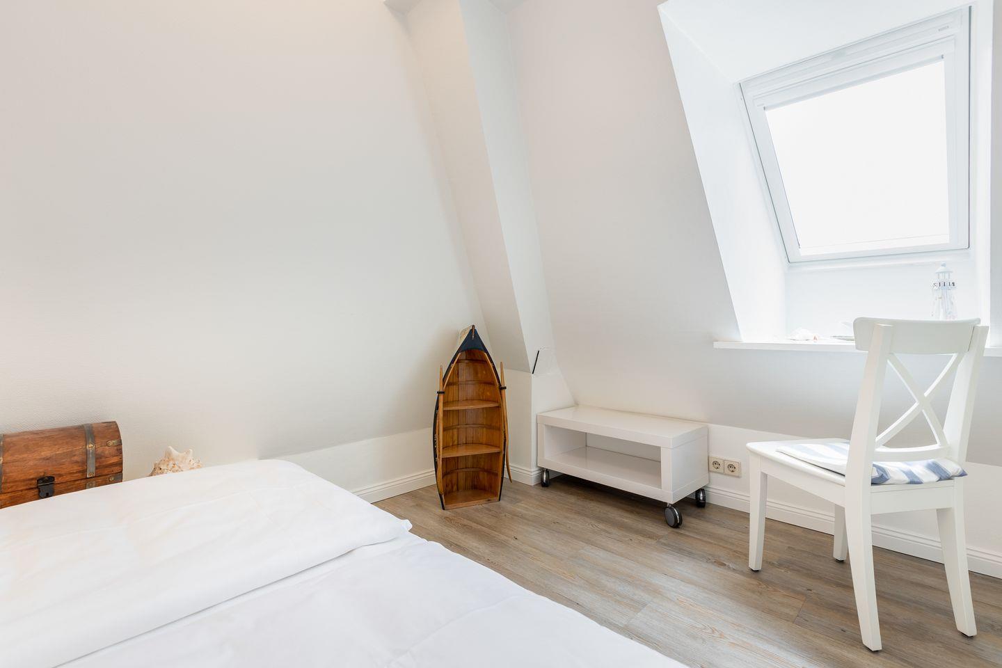 Dachgeschoss: Ihren Ausblick aus dem Dachgeschoss-Veluxfenster werden Sie so schnell nicht vergessen, liegt das Wattenmeer zum Greifen nahe und lässt es sich bei guter Sicht bis in Richtung Hindenburgdamm blicken. Hier steht Ihnen ein französisches Doppelbett (1,60 x 2,00 m) zur Verfügung.