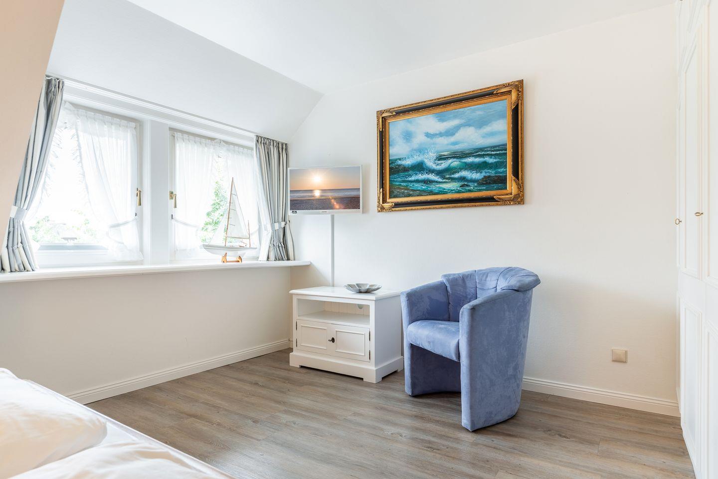 Obergeschoss: Im Obergeschoss empfängt Sie ein sehr schöner Masterbedroom mit Doppelbett (ca. 180cx200cm). Einfach fantastisch: Ihr Ausblick über das Lister Wattenmeer.