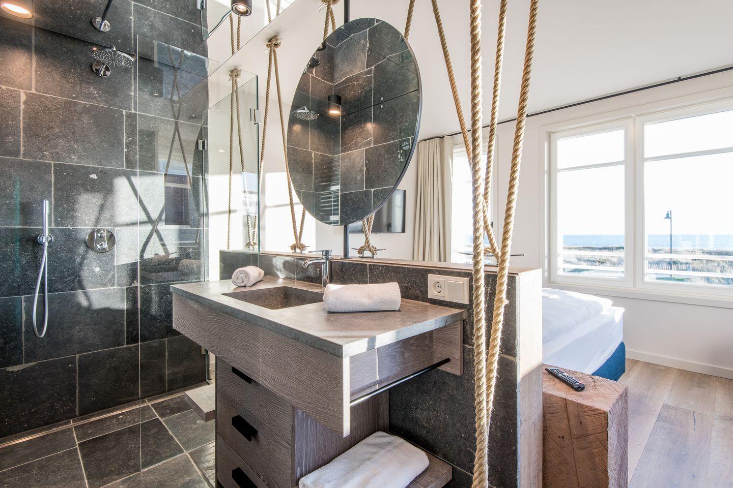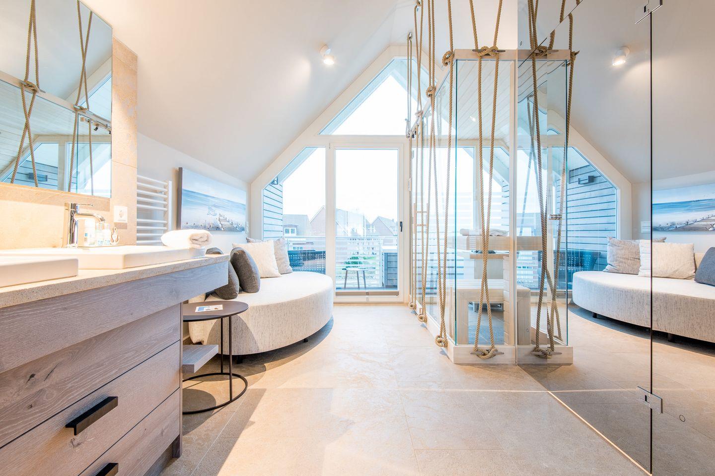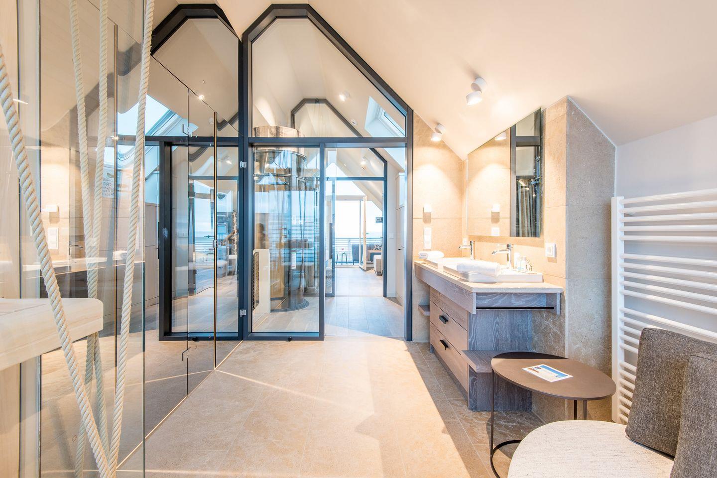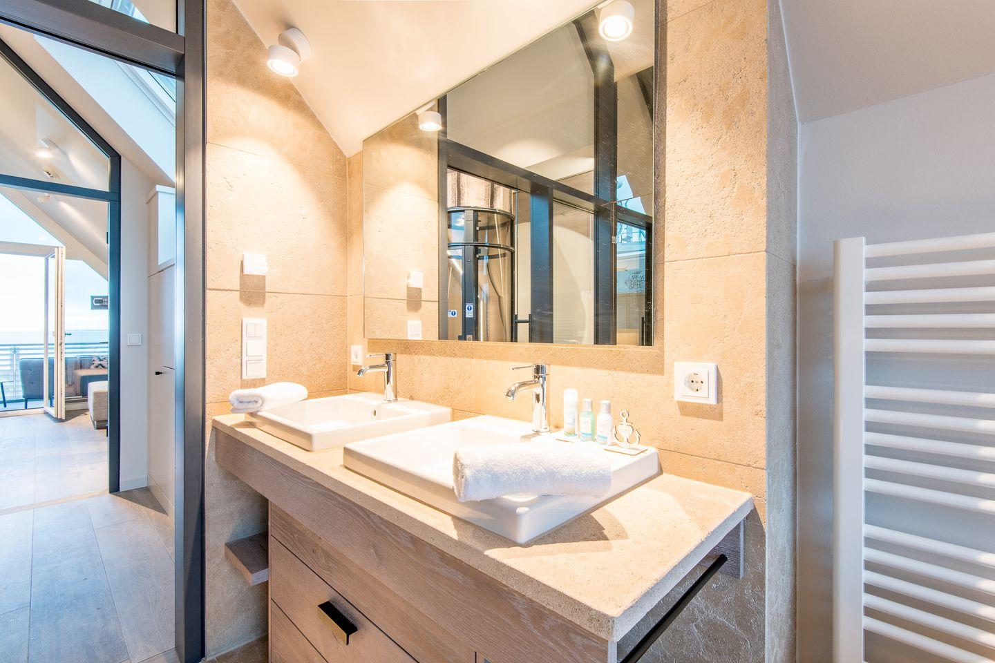 Sie gelangen von der Tiefgarage aus direkt in Ihr Beachhouse und betreten das Dünengeschoss (Untergeschoss) – hier befinden sich ein großzügiges Schlafzimmer und ein luxuriöses Naturstein-Badezimmer en Suite mit bodengleicher Dusche, Waschtisch und WC.