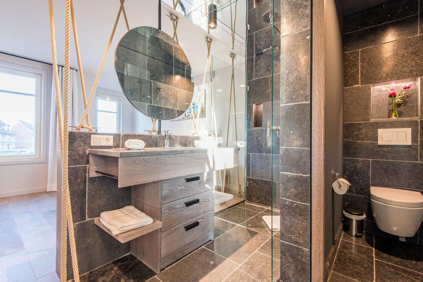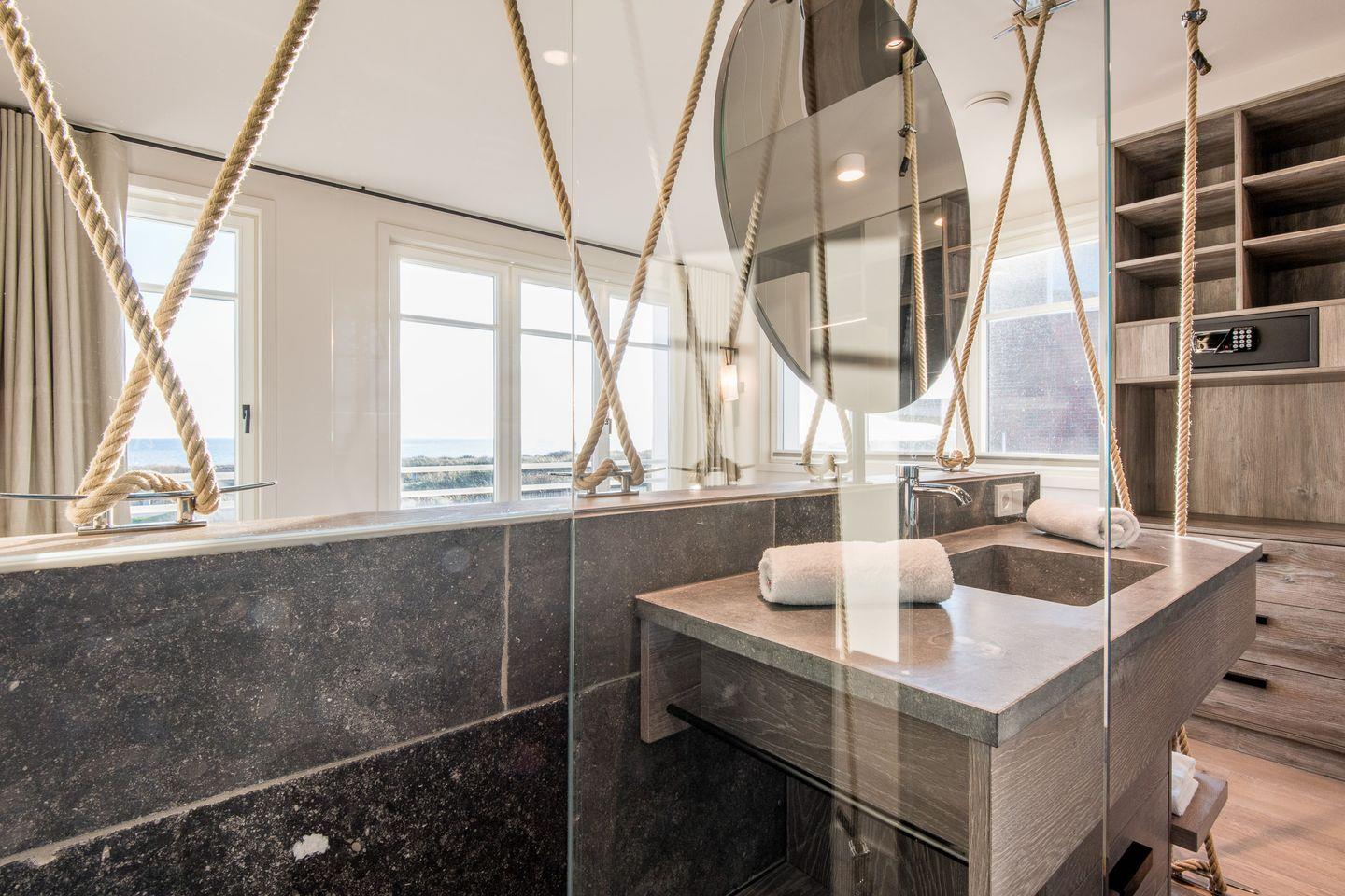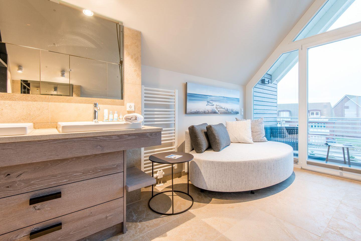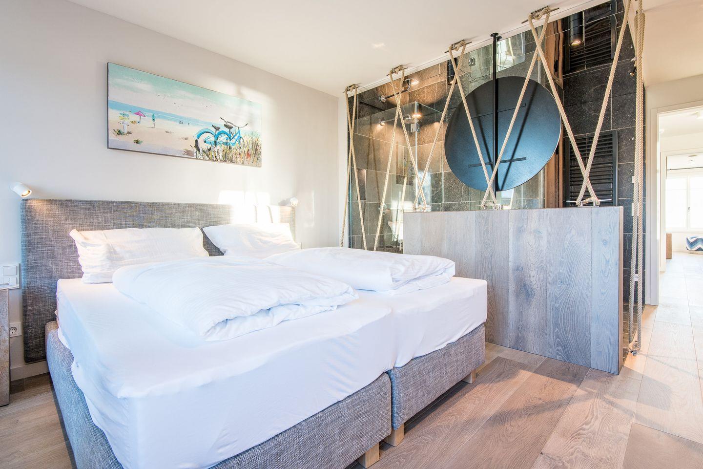 Sie gelangen von der Tiefgarage aus direkt in Ihr Beachhouse und betreten das Dünengeschoss (Untergeschoss) – hier befinden sich ein großzügiges Schlafzimmer und ein luxuriöses Naturstein-Badezimmer en Suite mit bodengleicher Dusche, Waschtisch und WC.