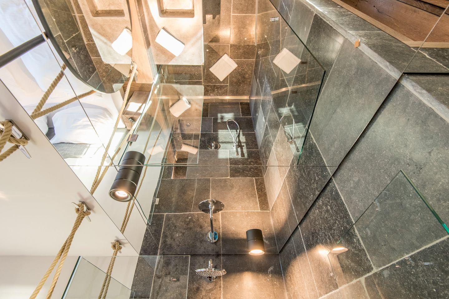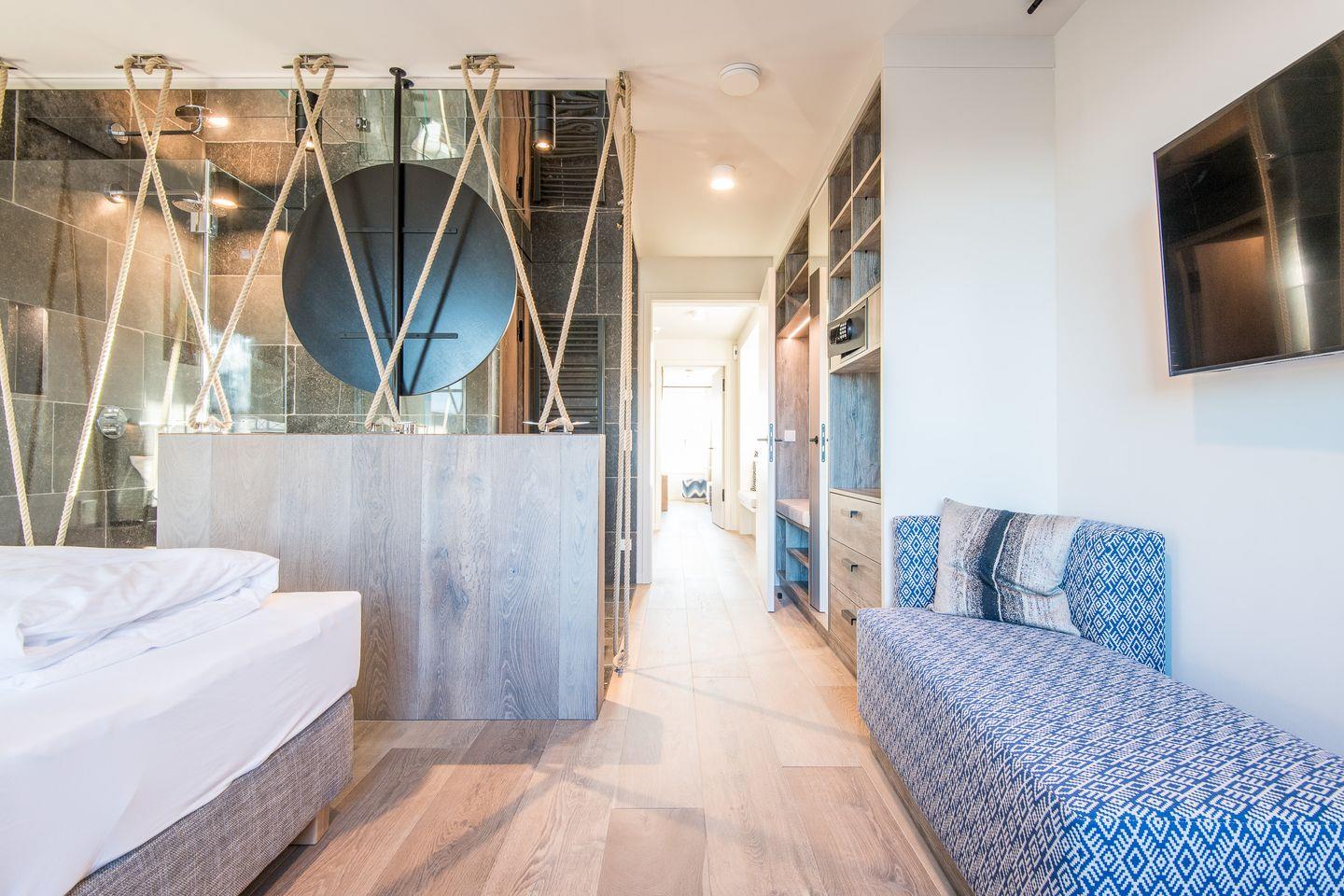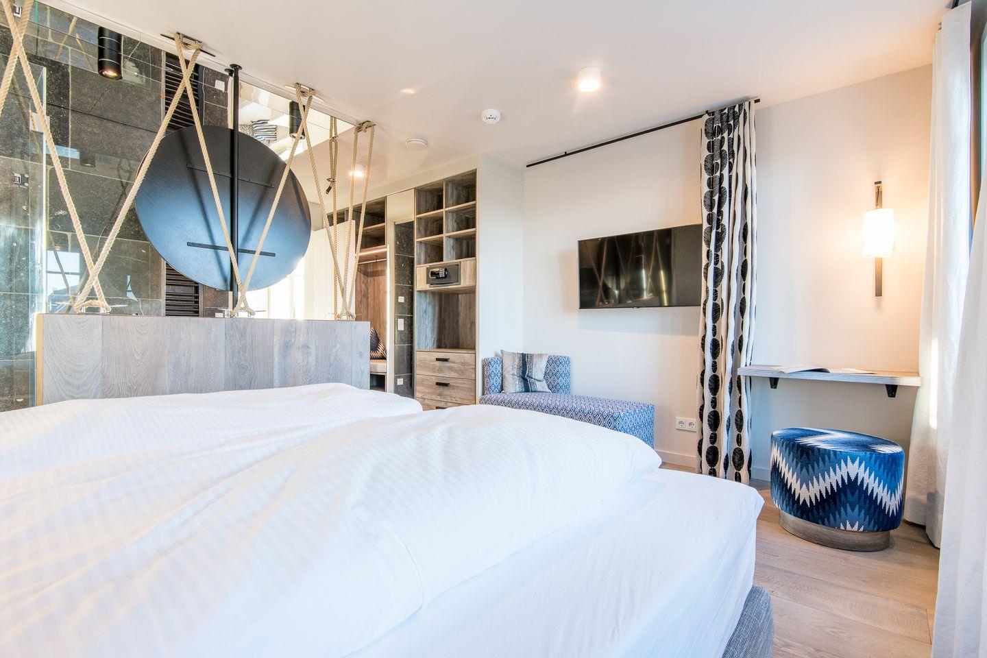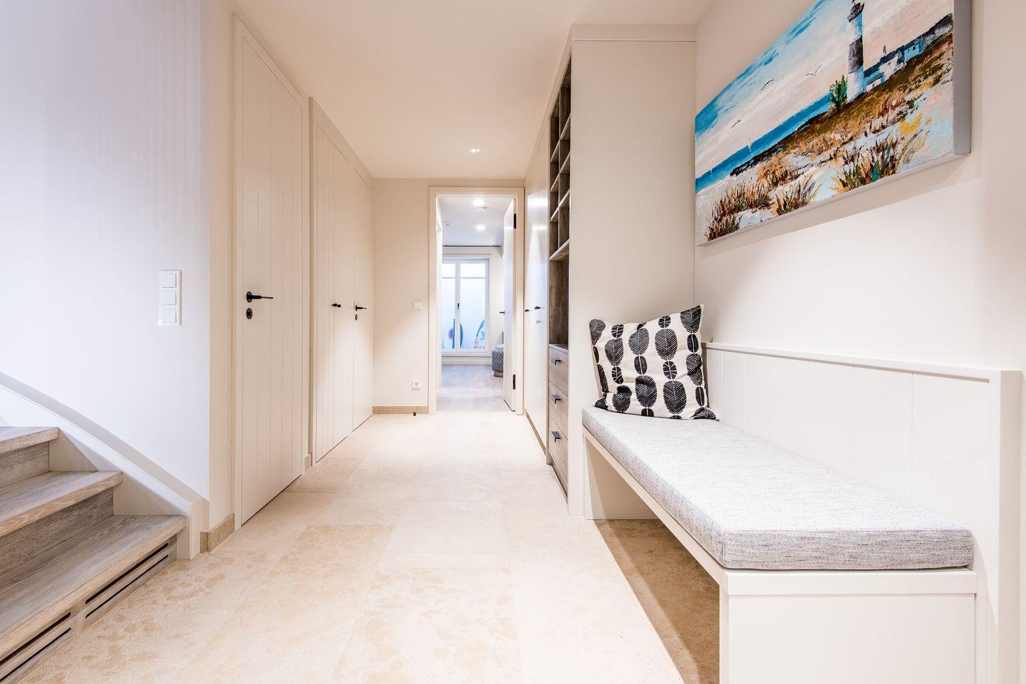 Sie gelangen von der Tiefgarage aus direkt in Ihr Beachhouse und betreten das Dünengeschoss (Untergeschoss) – hier befinden sich ein großzügiges Schlafzimmer und ein luxuriöses Naturstein-Badezimmer en Suite mit bodengleicher Dusche, Waschtisch und WC.