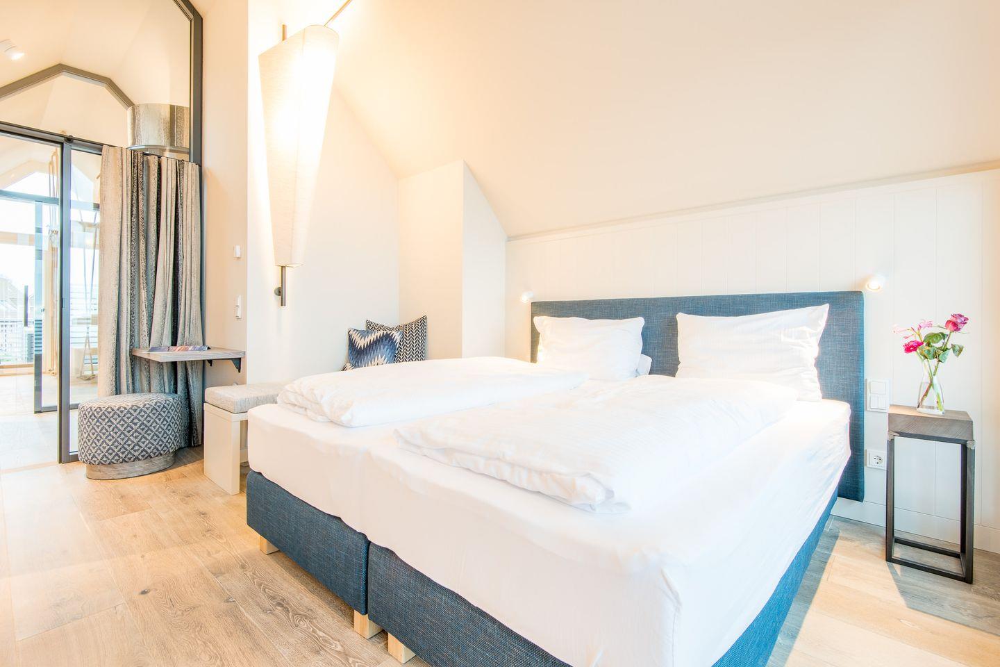 In der obersten Ebene angelangt finden Sie einen weiteres, wunderschönes Schlafzimmmer mit Austritt auf die eigene Loggia mit Blick auf das Wasser und gemütlichen Sitzmöbeln für zwei Personen.
