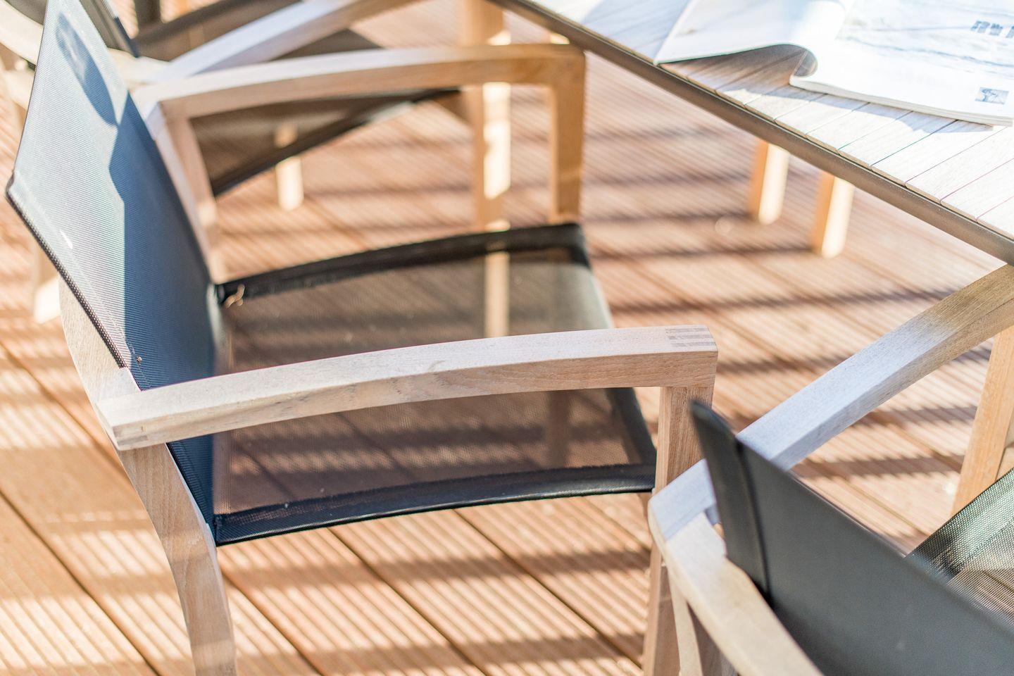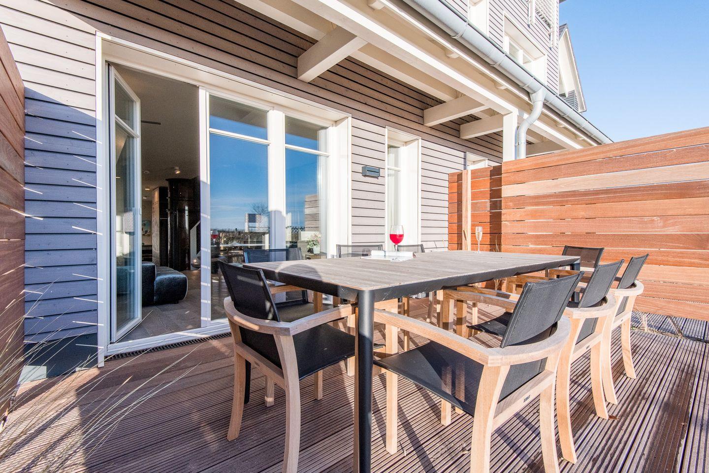Von hier aus gelangen Sie auf Ihre eigene Bangkirai-Terrasse mit exklusiven italienischen Designer-Möbeln für alle Bewohner, es schließt sich direkt die Naturgeschützte Dünenfläche mit Rosen an – hier gilt für alle Zwei – und Vierbeiner – Betreten leider nicht gestattet, Blick und Flair genießen Ausdrücklich erlaubt.