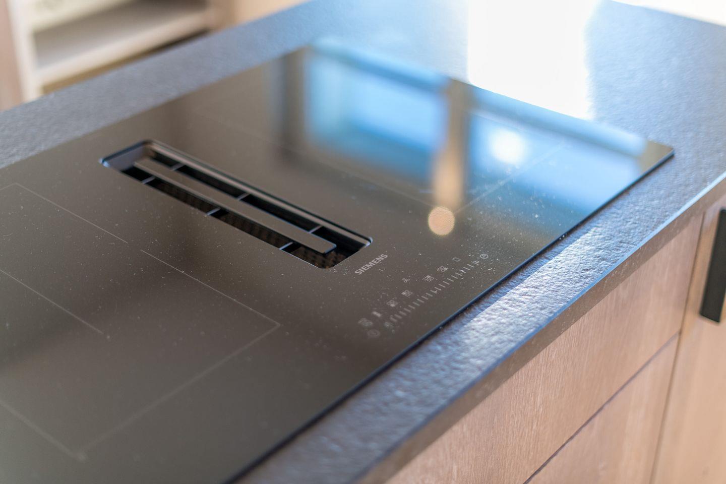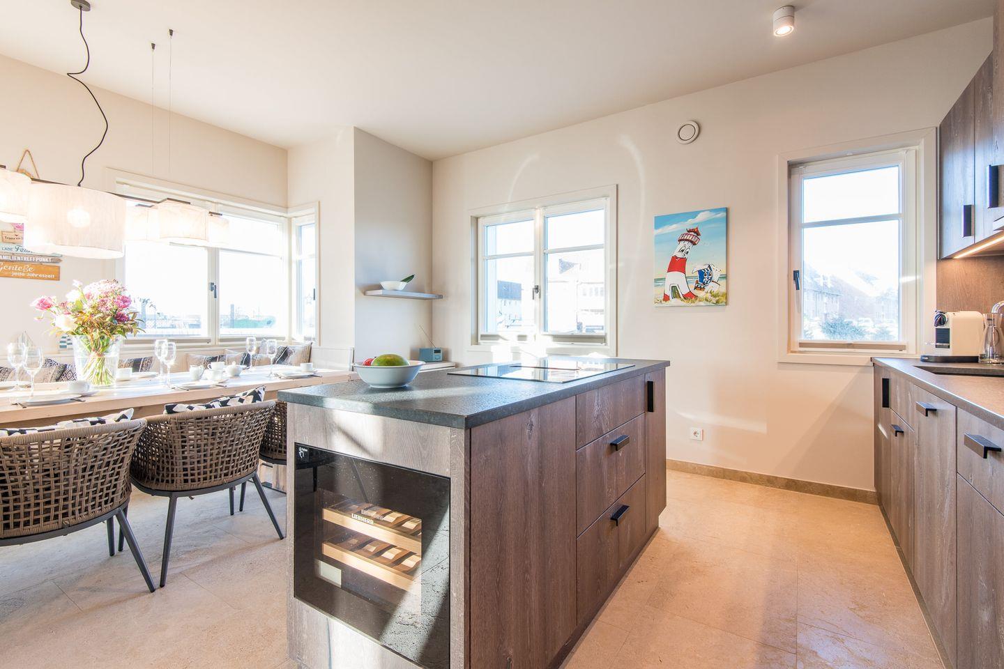 Die schöne, tischlergefertigte Küche lässt keine Wünsche offen, der individuell angefertigte Tisch aus historischem Holz und die dazu kombinierten Designer-Stühle nebst bequemer, angefertigter Sitzbank an der Wand mit hochwertigen Luxus-Stoffen laden die Bewohner zum gemütlichen Verweilen und genießen ein – Sie finden ausserdem einen gläsernen Weinklimaschrank in Ihrem Domizil.