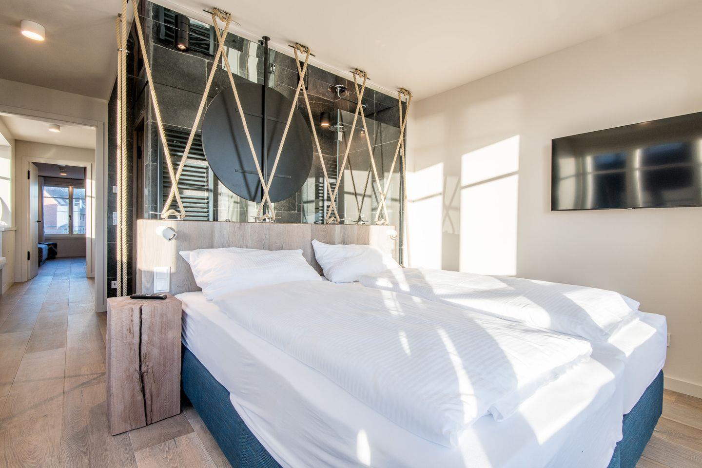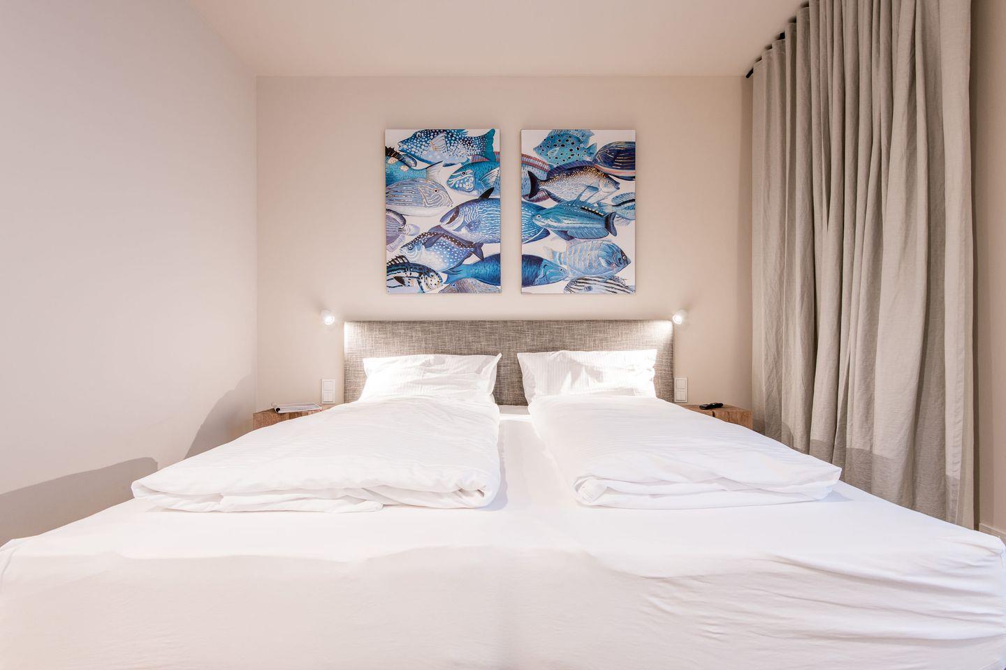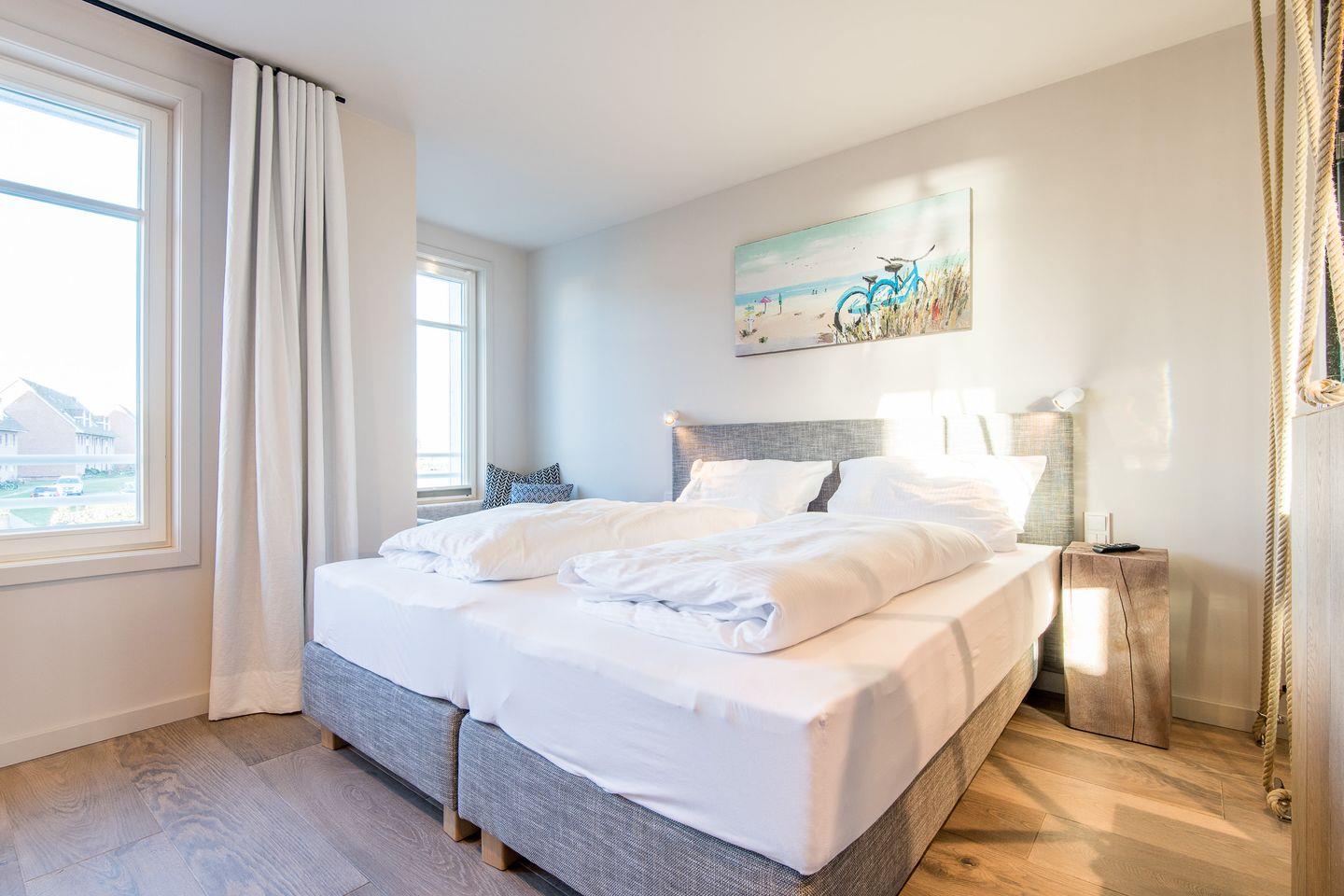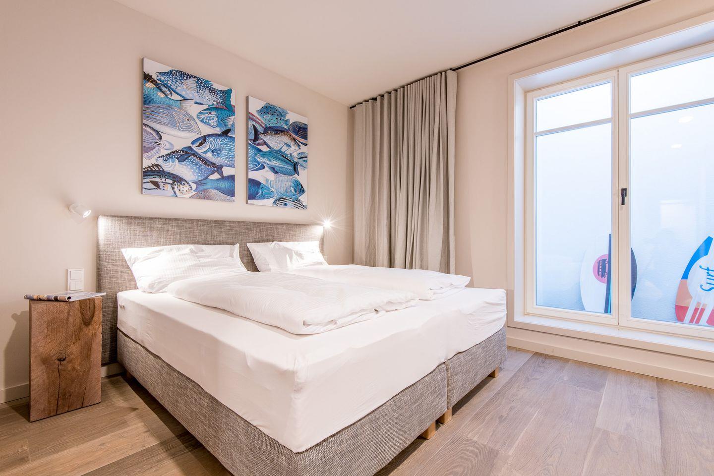 Es stehen Ihnen vier exklusive Schlafzimmer für je zwei Gäste zur Verfügung - zwei Schlafzimmer davon mit wunderschönem Wasserblick. Ein Badezimmer schließt sich jedem Schlafzimmer an (Duschbäder). Jedes Schlafzimmer verfügt über Tischlergefertigte Schrankeinbauten nebst Hotelsafe und TV.