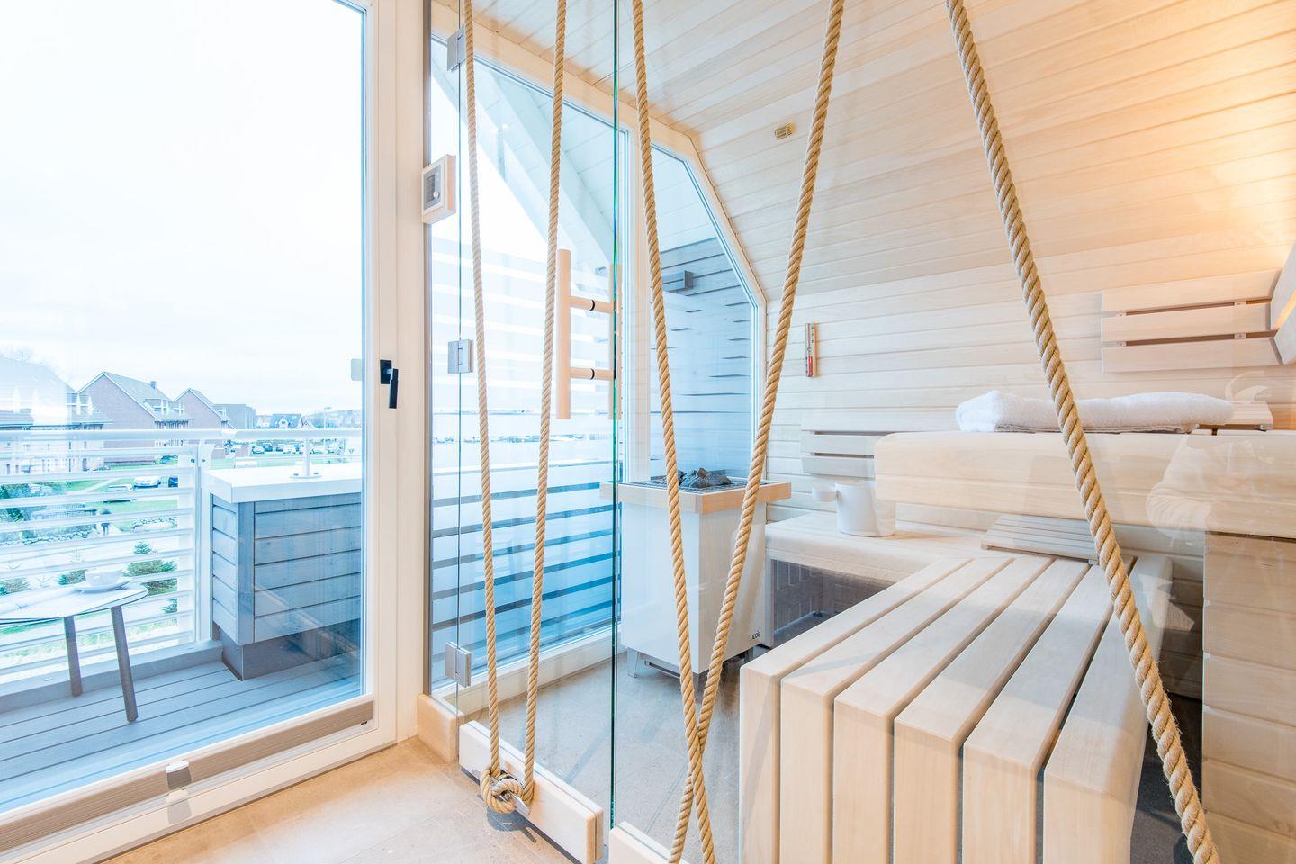 Die Sauna mit Relax-Sofa, sowie eine Dusche und ein separates WC befinden sich ebenfalls auf dieser oberen Ebene. Eine weitere Loggia mit Sitzmöbeln für zwei Bewohner schliesst sich hier an.