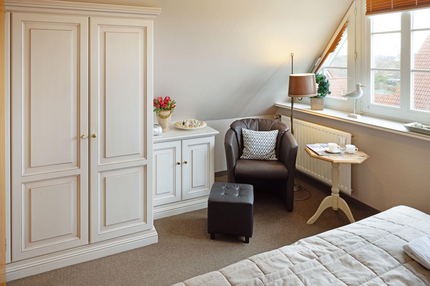 Die Ferienwohnung verfügt über ein Schlafzimmer mit Doppelbett (im zweiten Obergeschoss) und eine Schlafcouch für zwei Personen mit zusätzlichen Topper im Wohnzimmer.