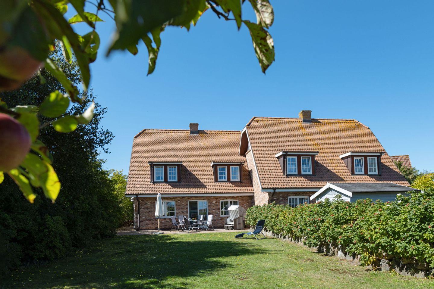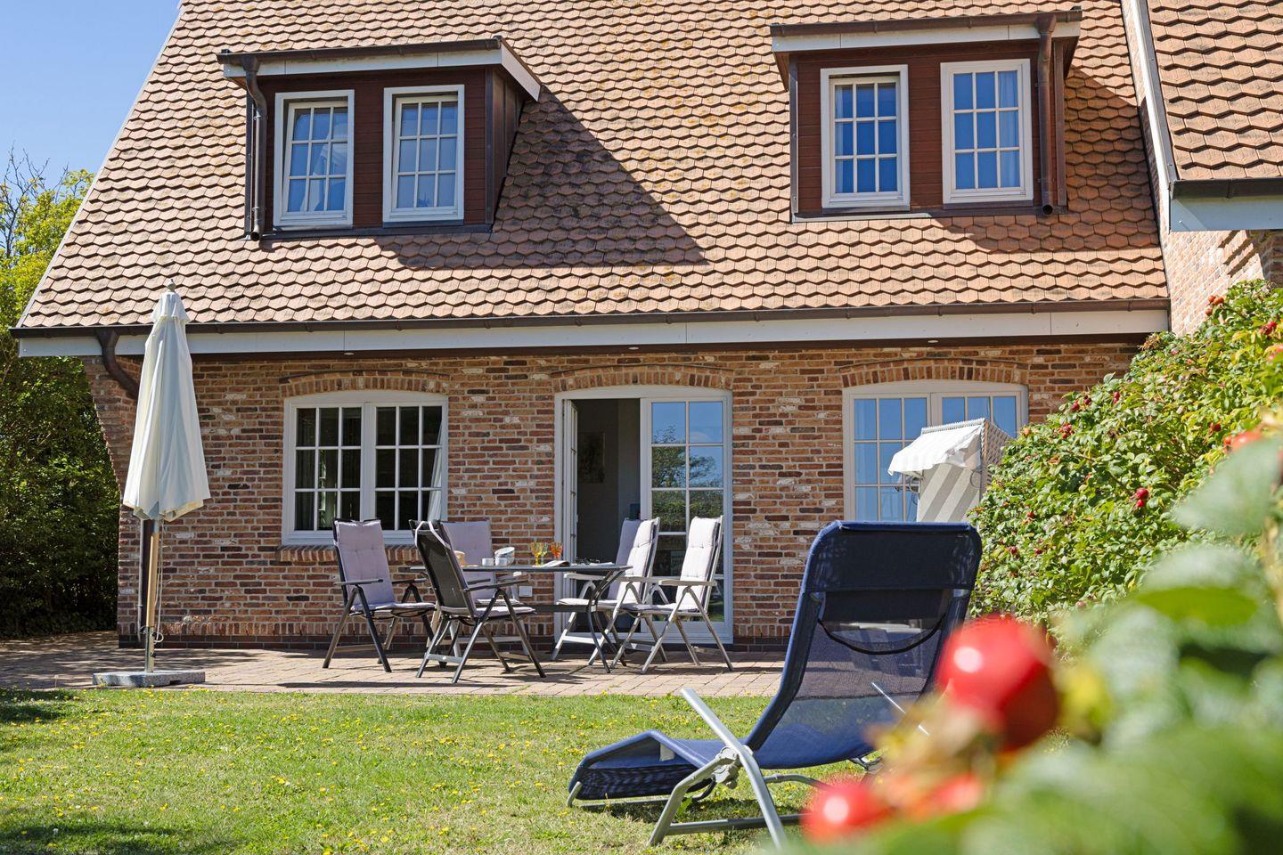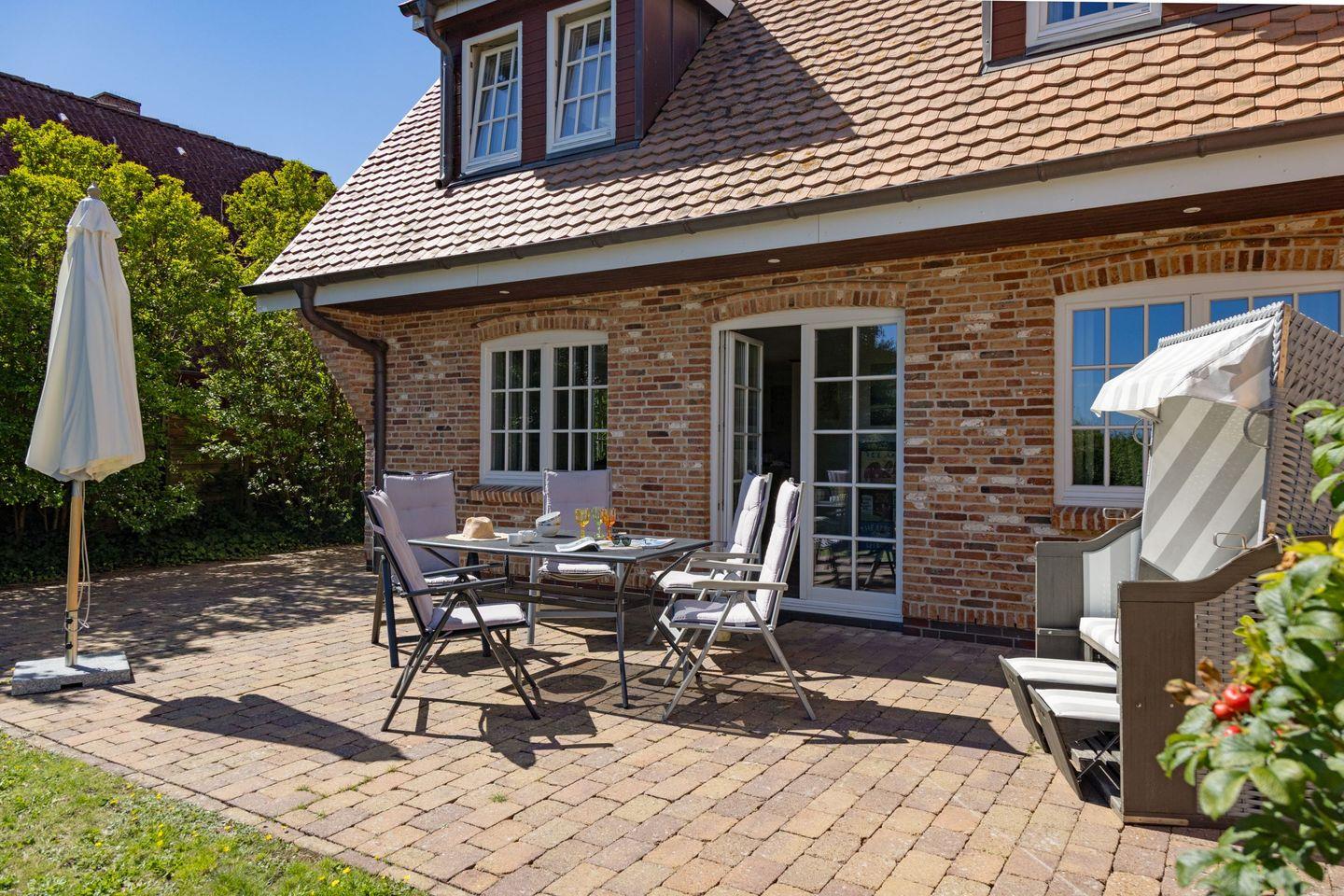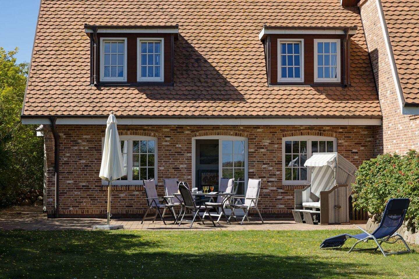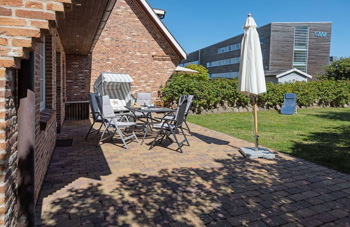 Vom Garten mit großer Terrasse, Gartenmöbel und ein Strandkorb sind vorhanden sind Sie in ca. 66 Metern am Strand.