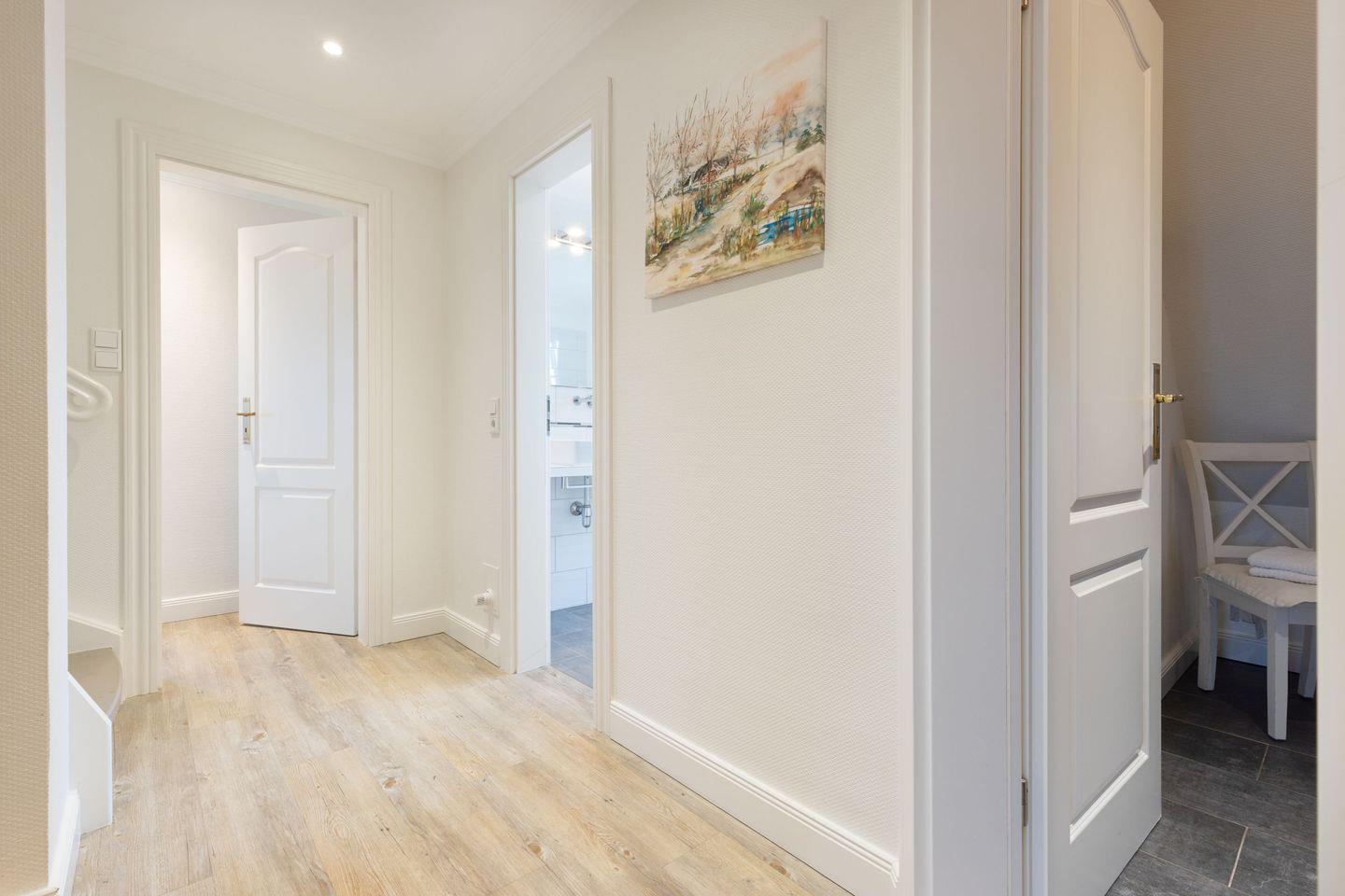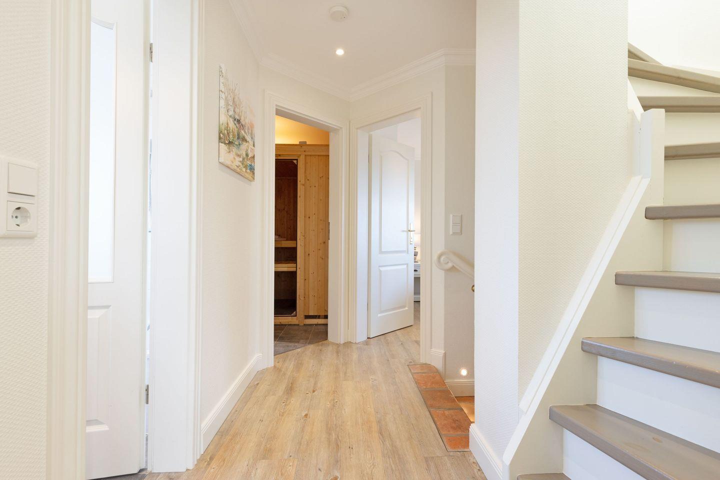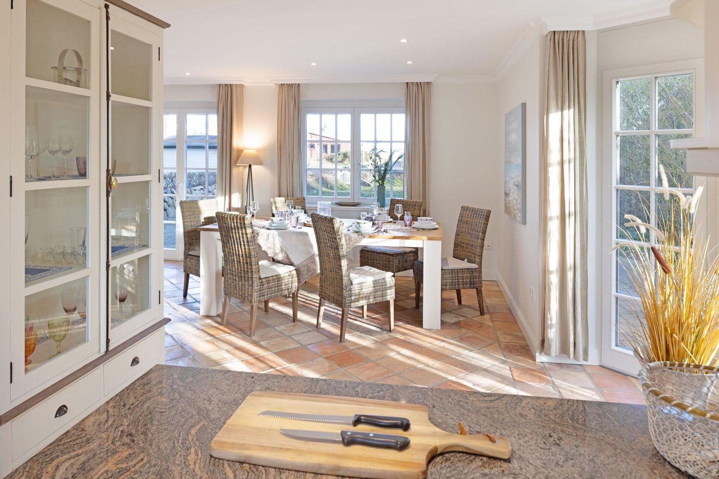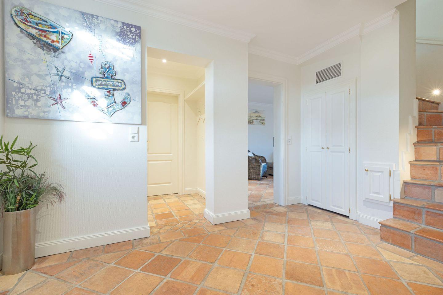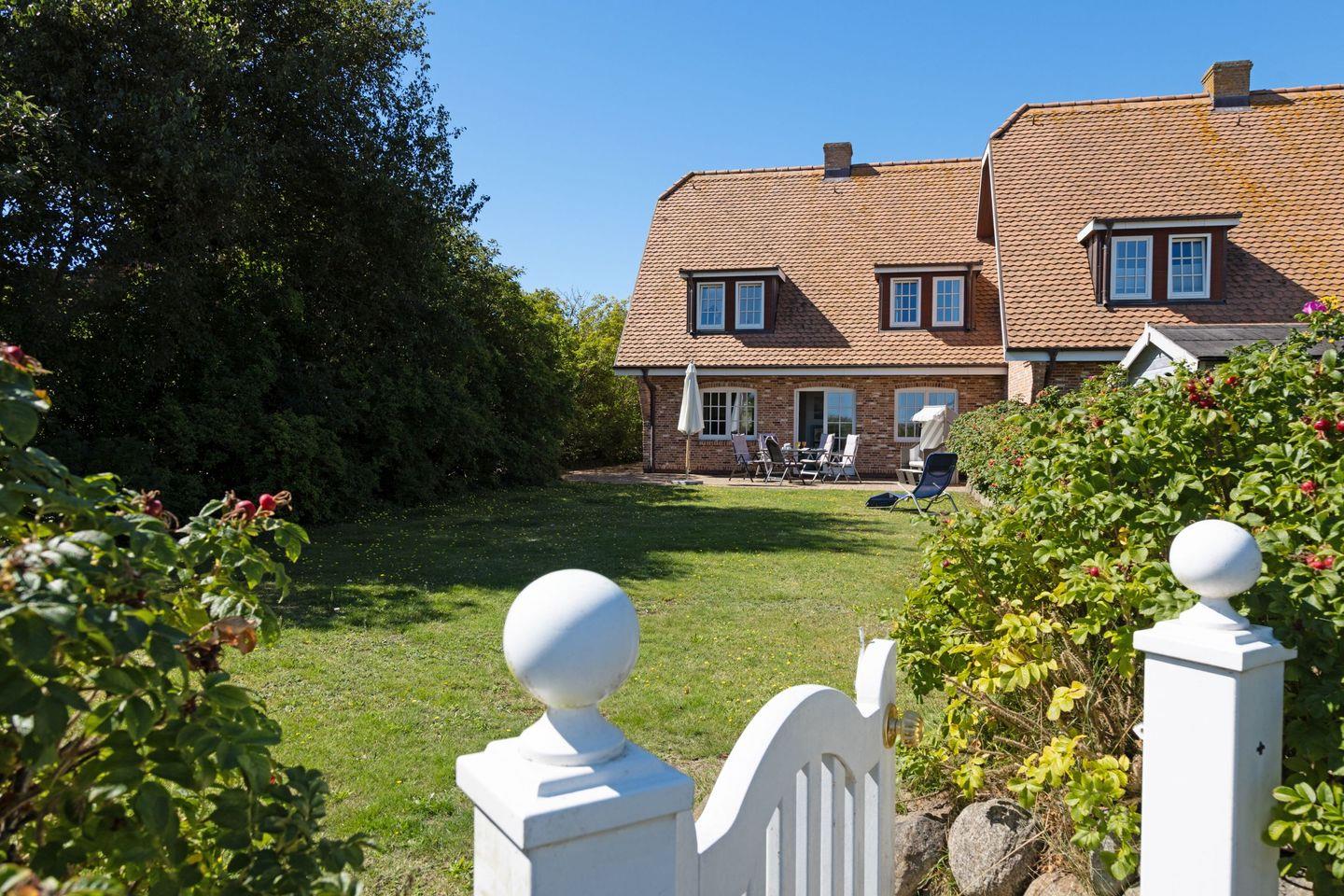 Vom Garten mit großer Terrasse, Gartenmöbel und ein Strandkorb sind vorhanden sind Sie in ca. 66 Metern am Strand.