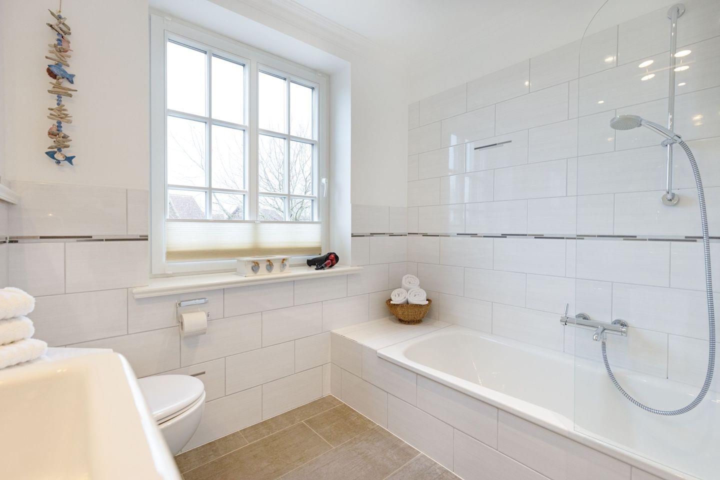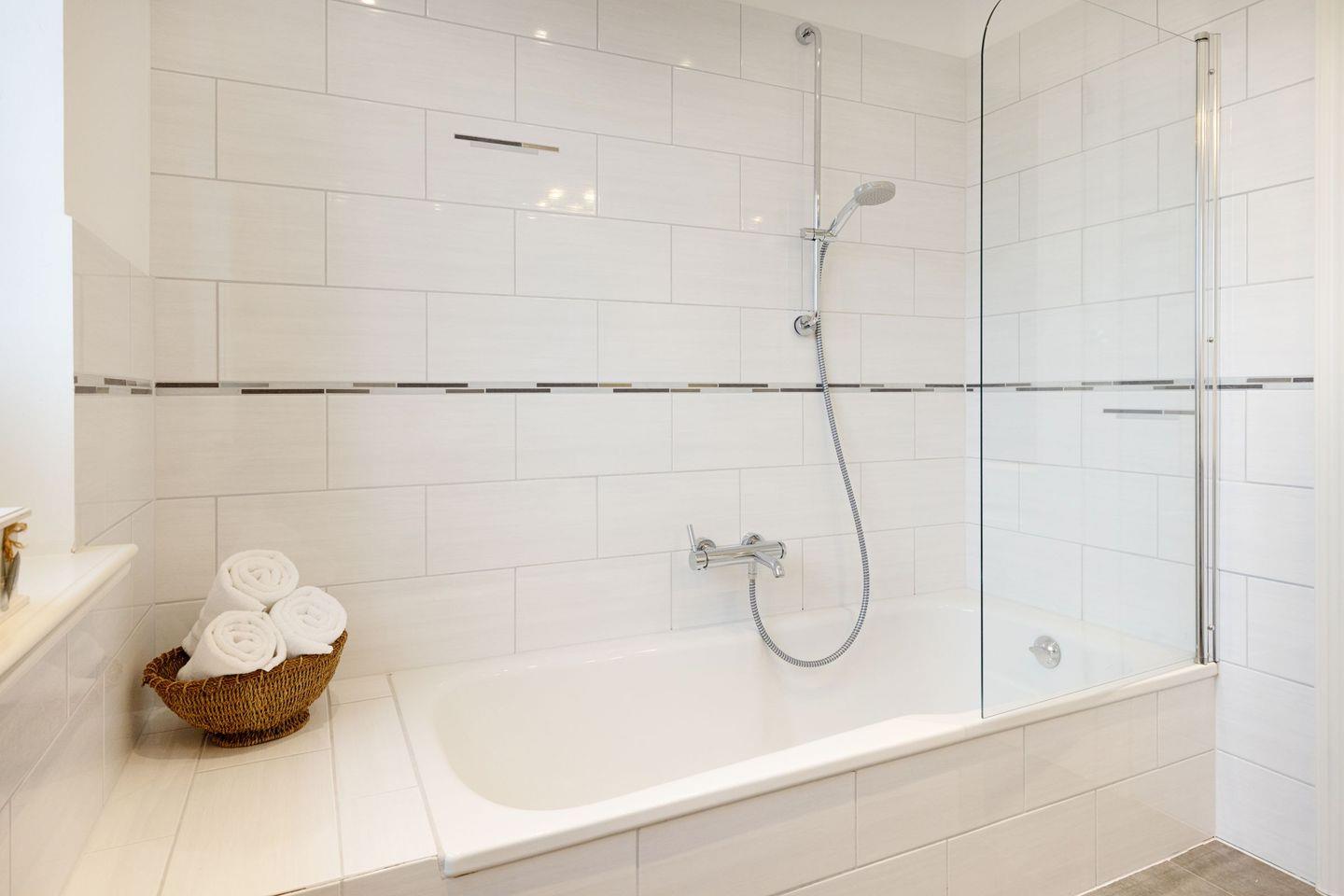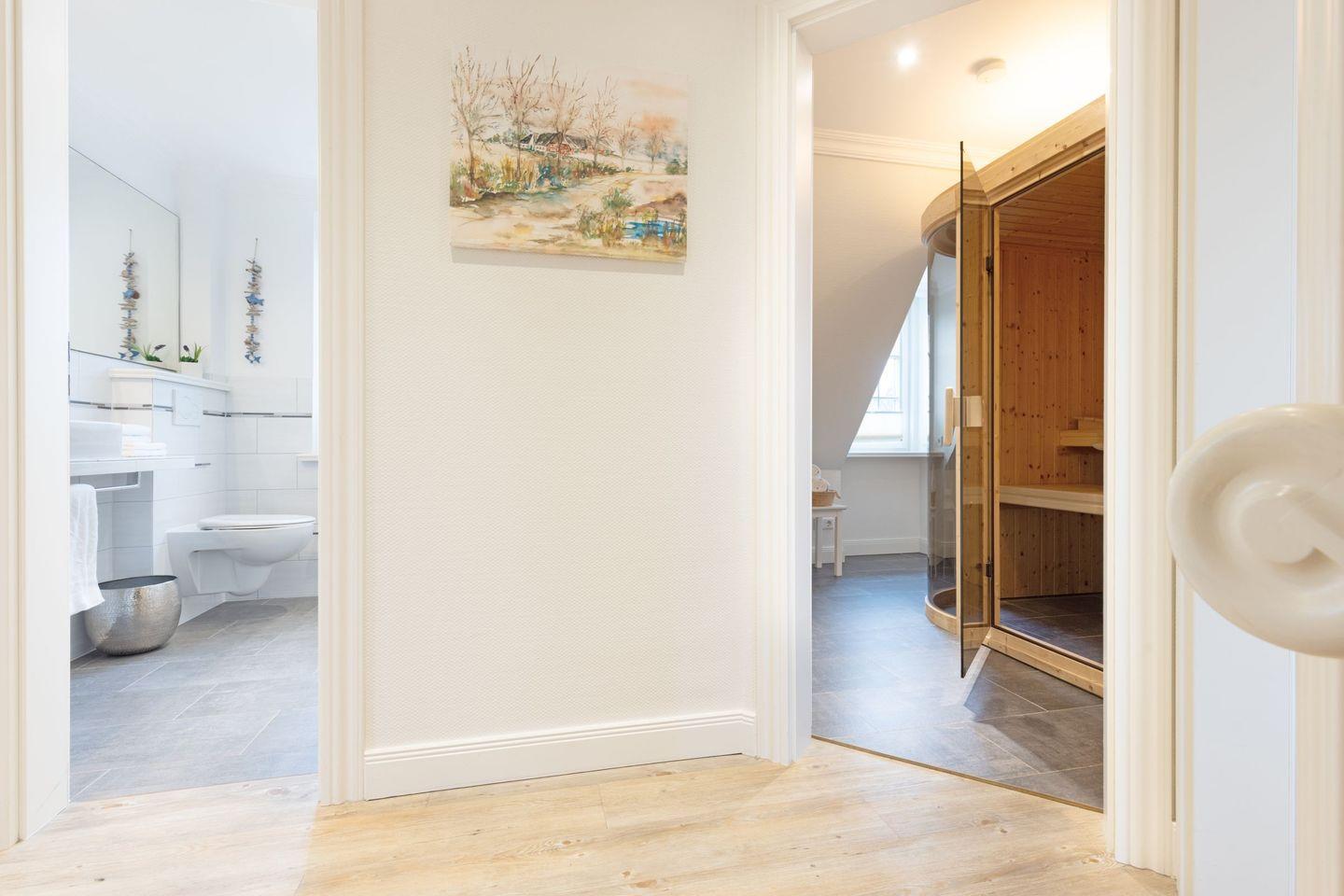 Ein Badezimmer mit Dusche, ein zweites Badezimmer mit einer Dusch/Badewanne und eine große Sauna.