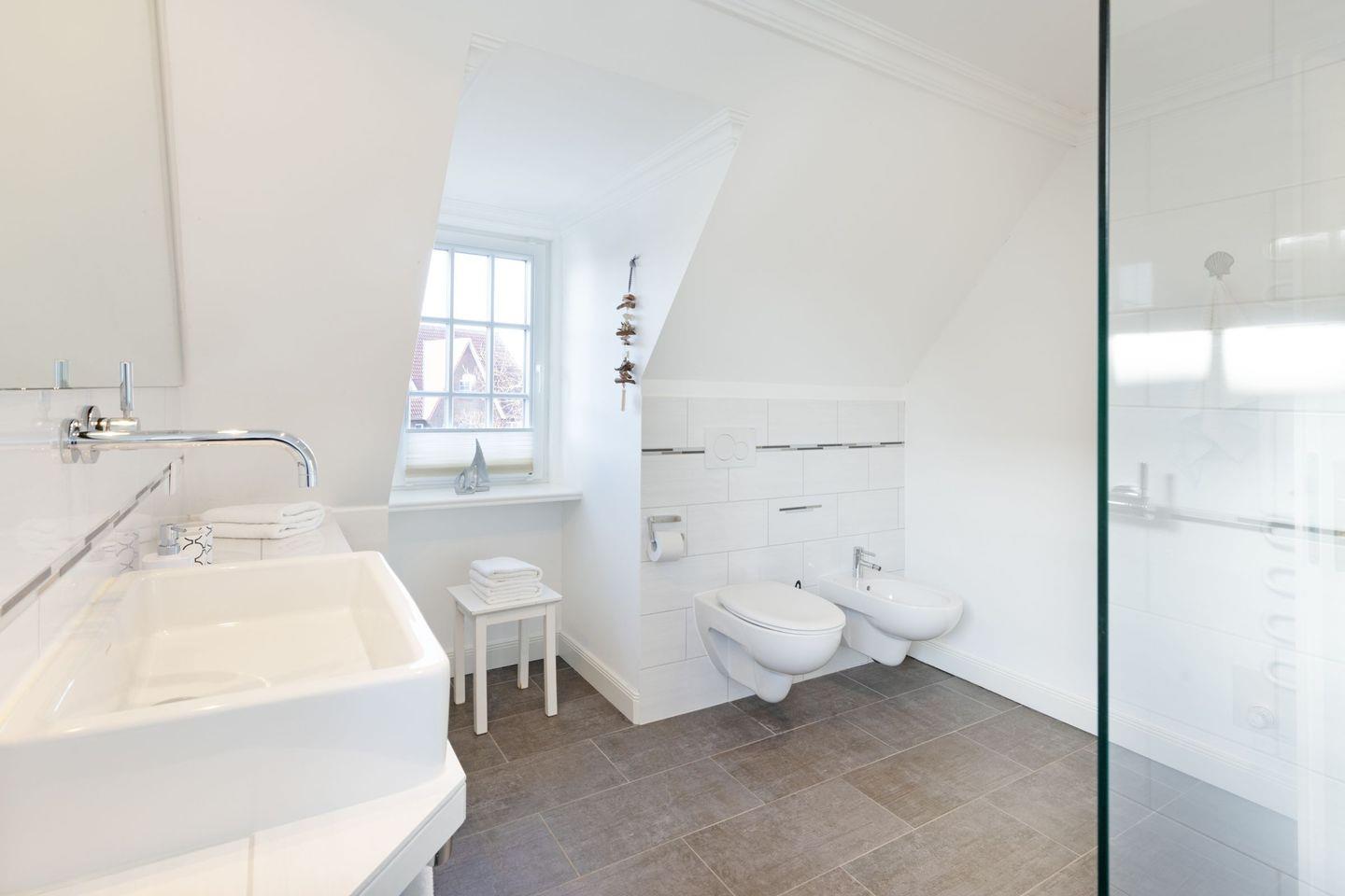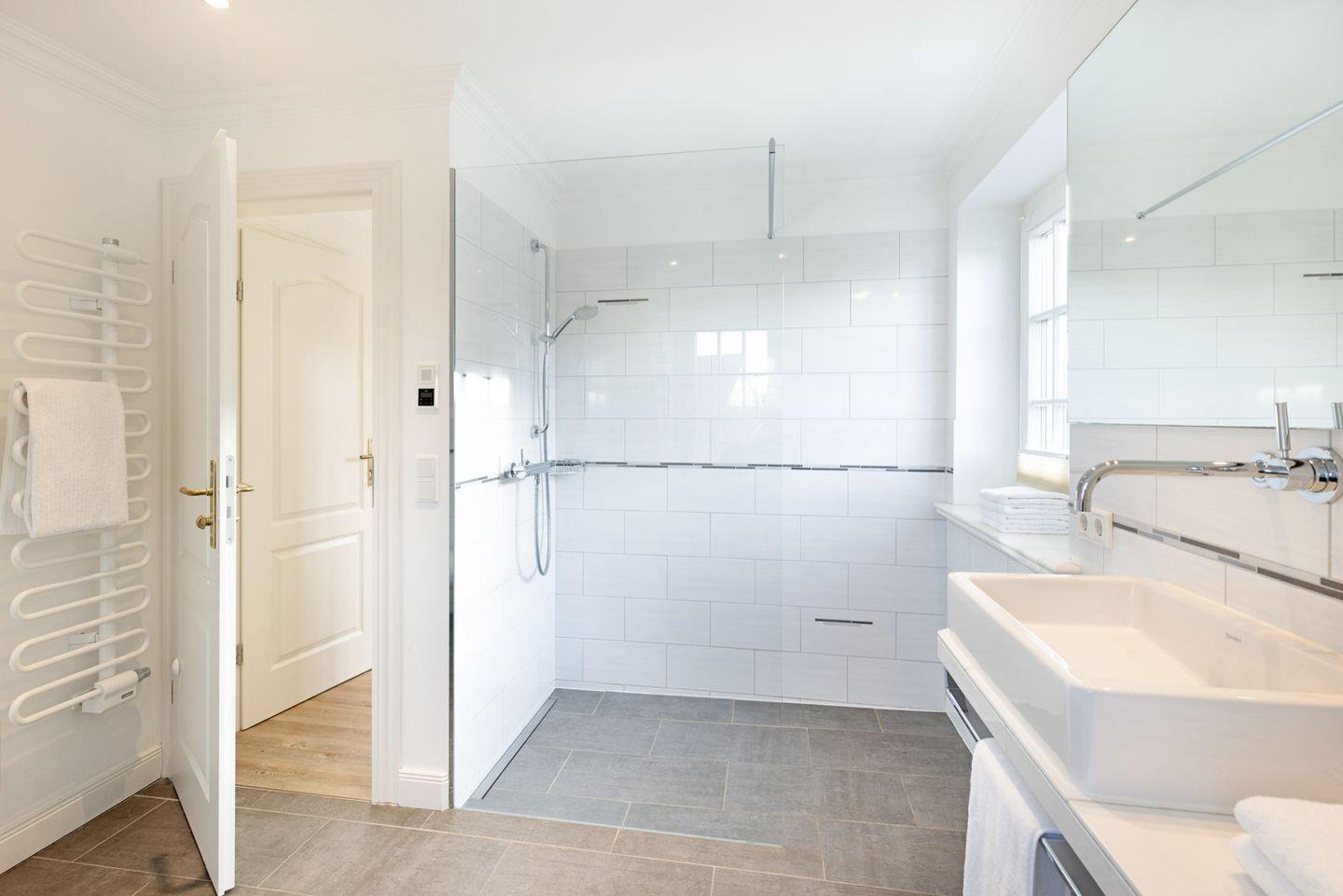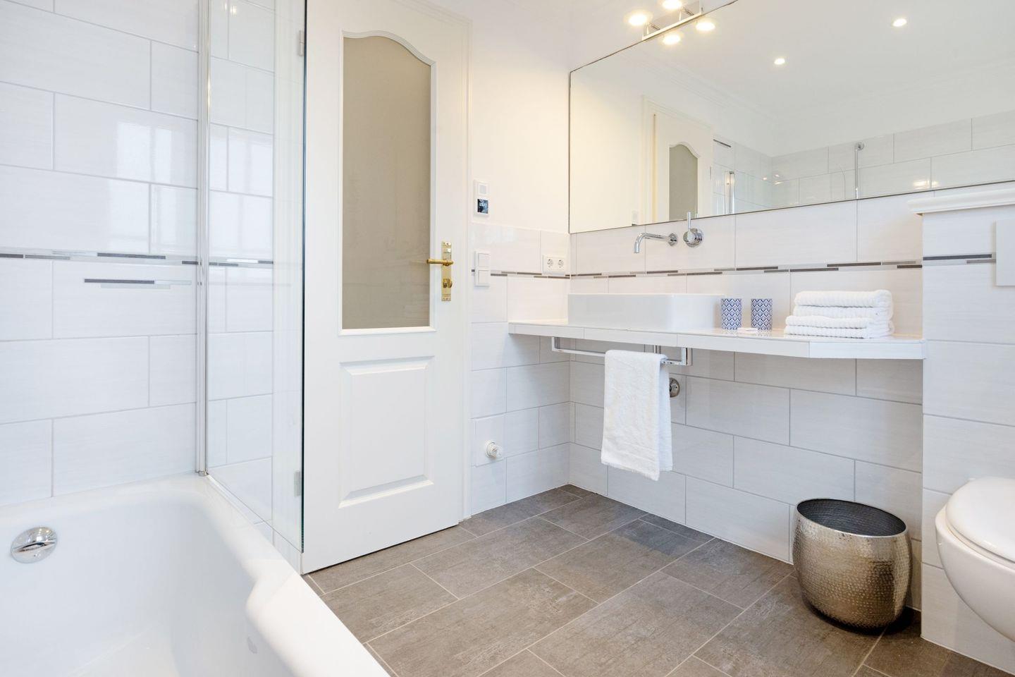 Ein Badezimmer mit Dusche, ein zweites Badezimmer mit einer Dusch/Badewanne und eine große Sauna.