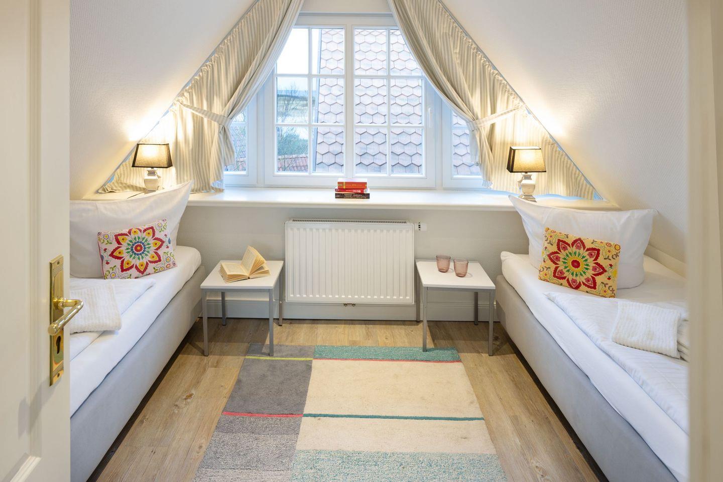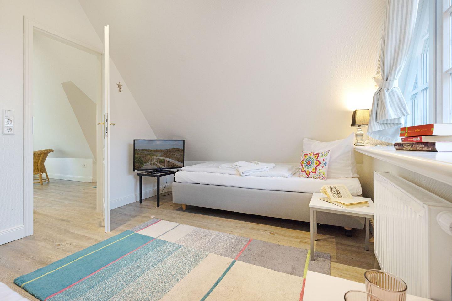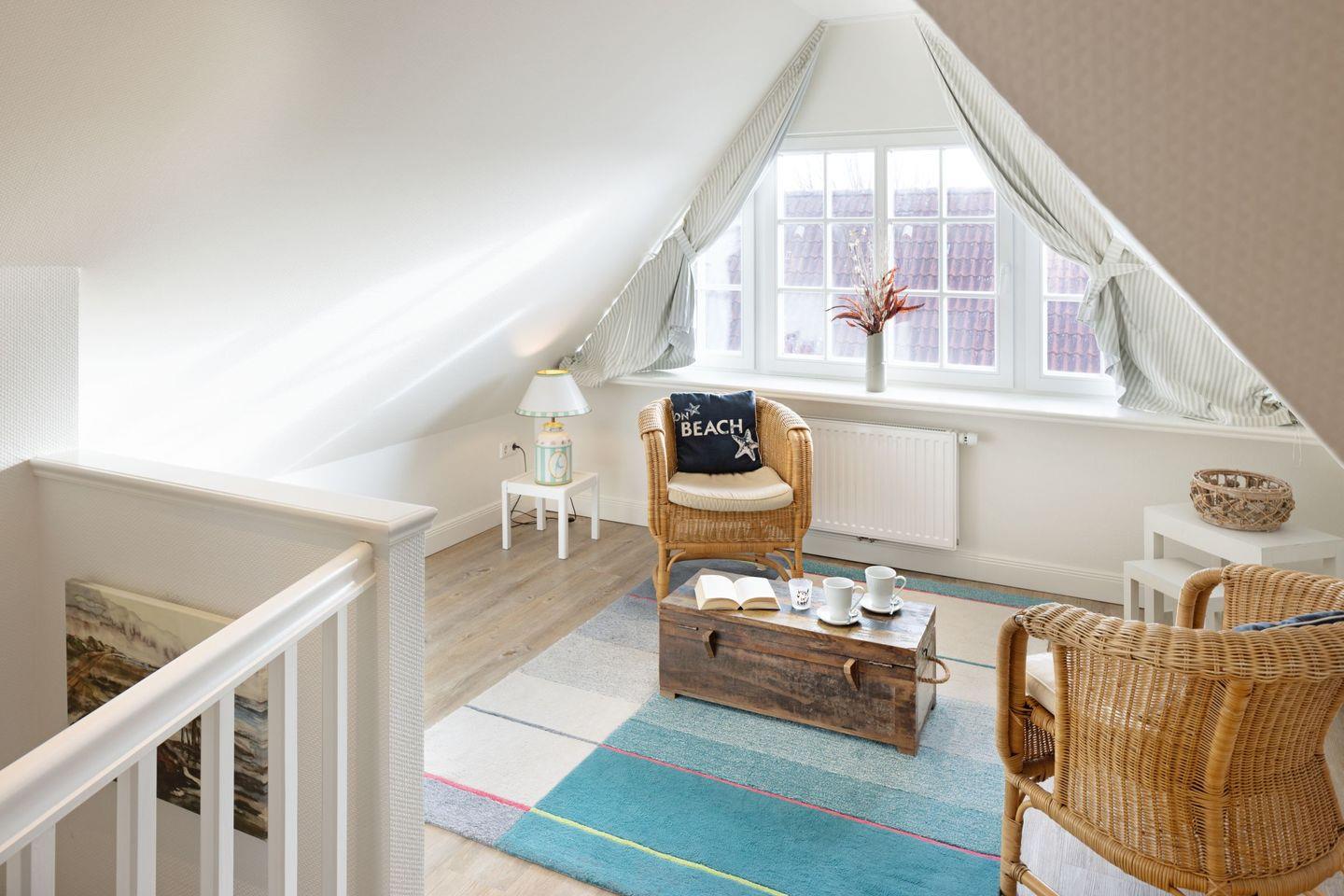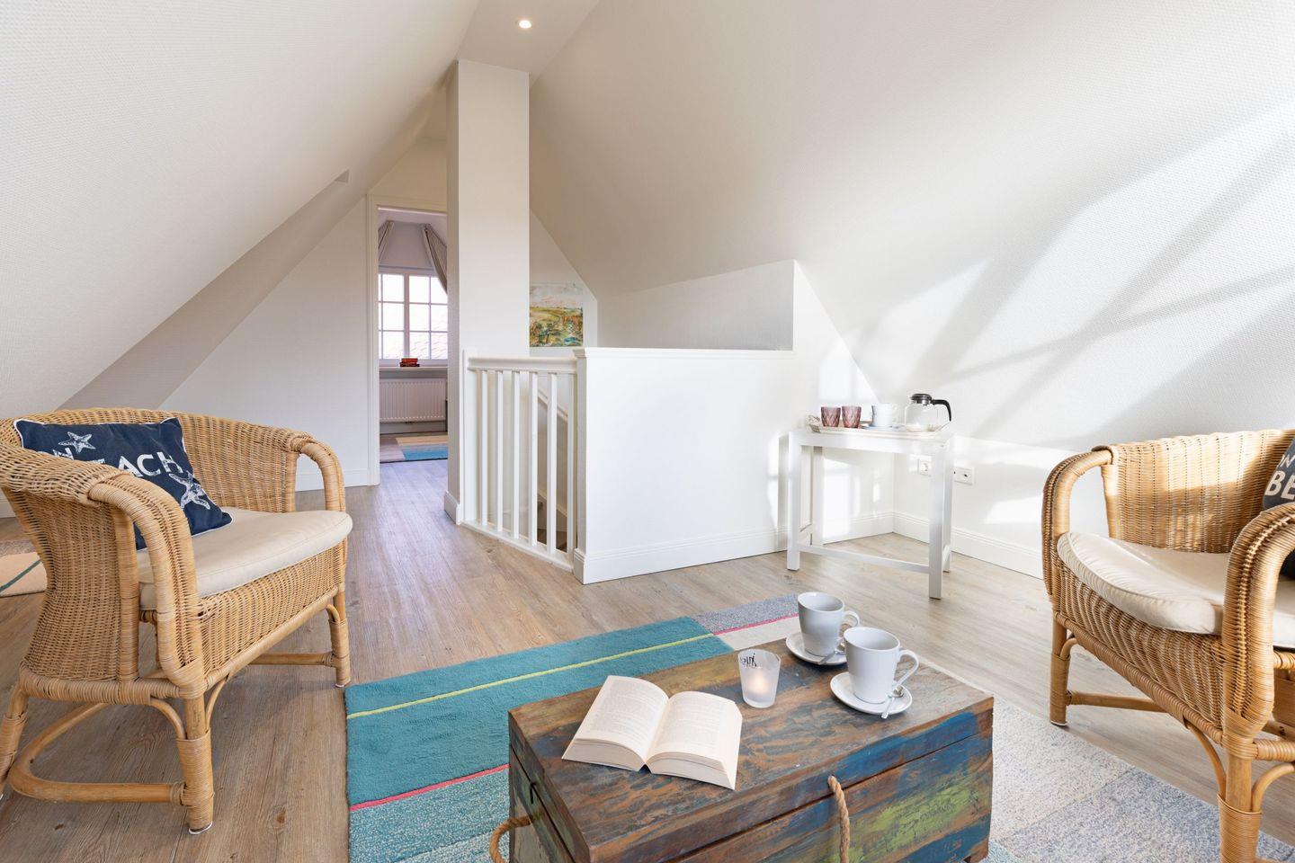 Im Dachgeschoss des Hauses finden Sie das dritte Schlafzimmer mit zwei Einzelbetten und einem Fernseher sowie einen gemütlichen Aufenthaltsraum.