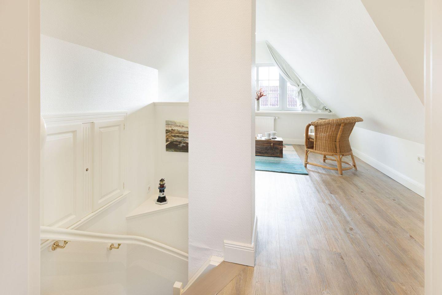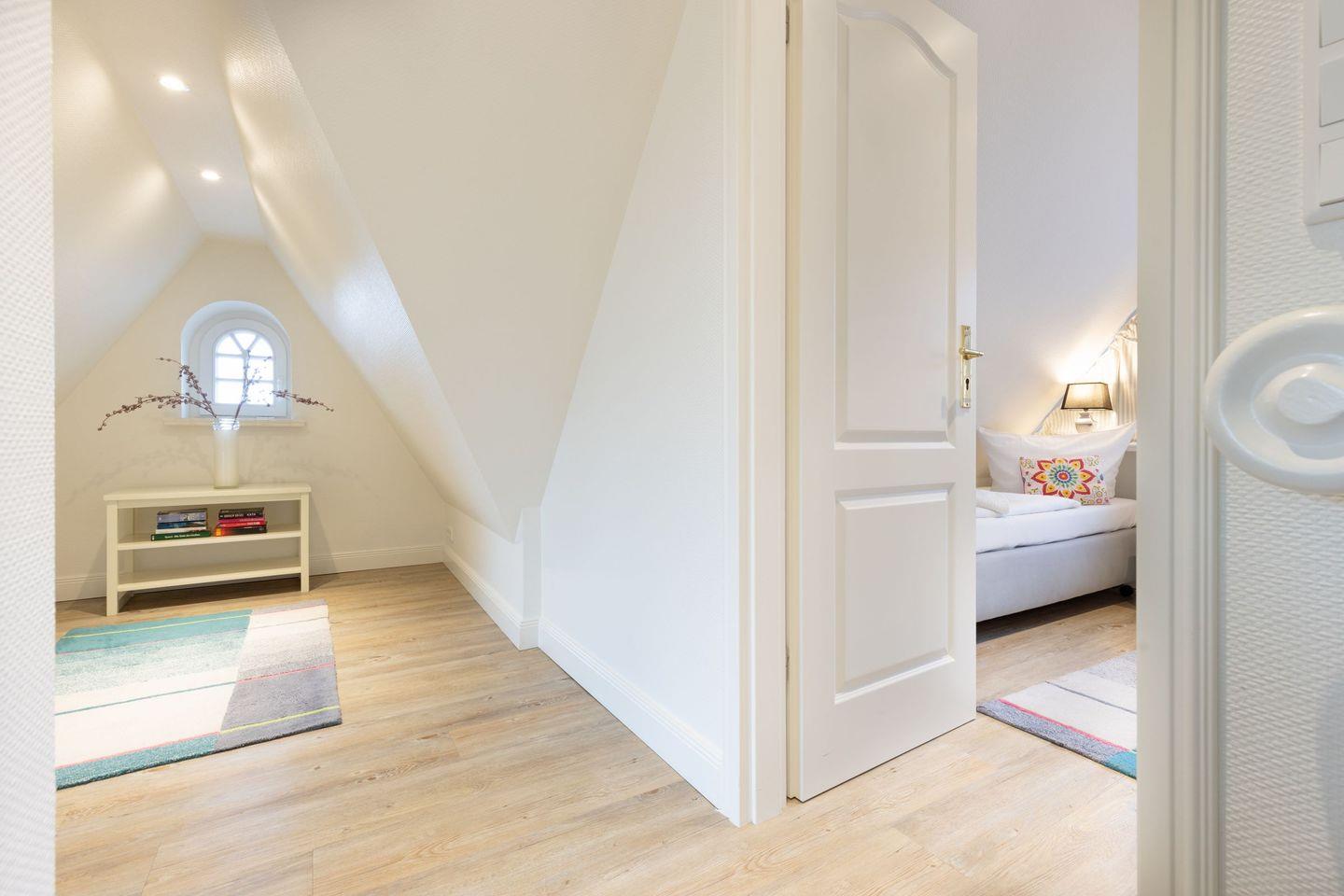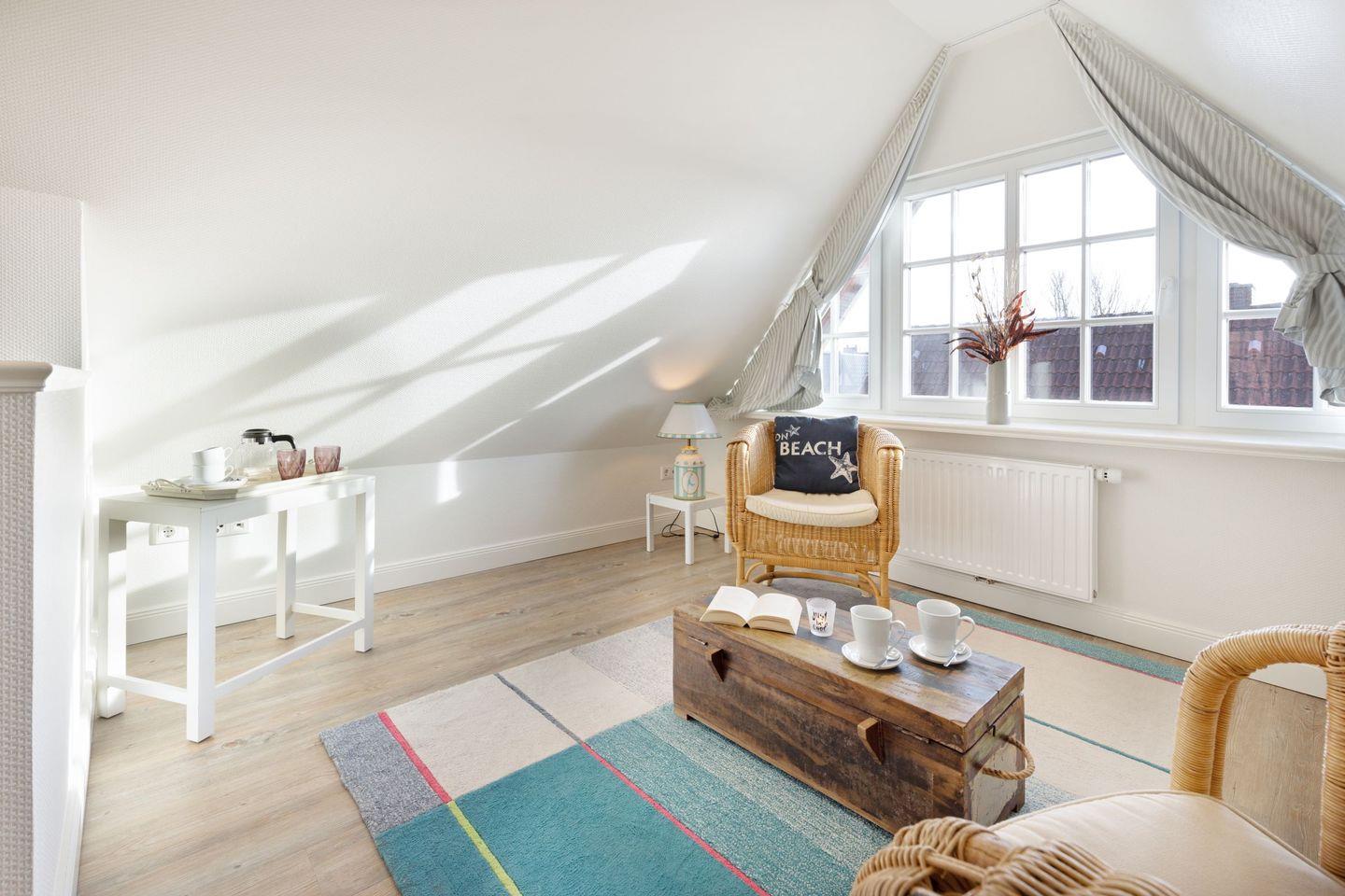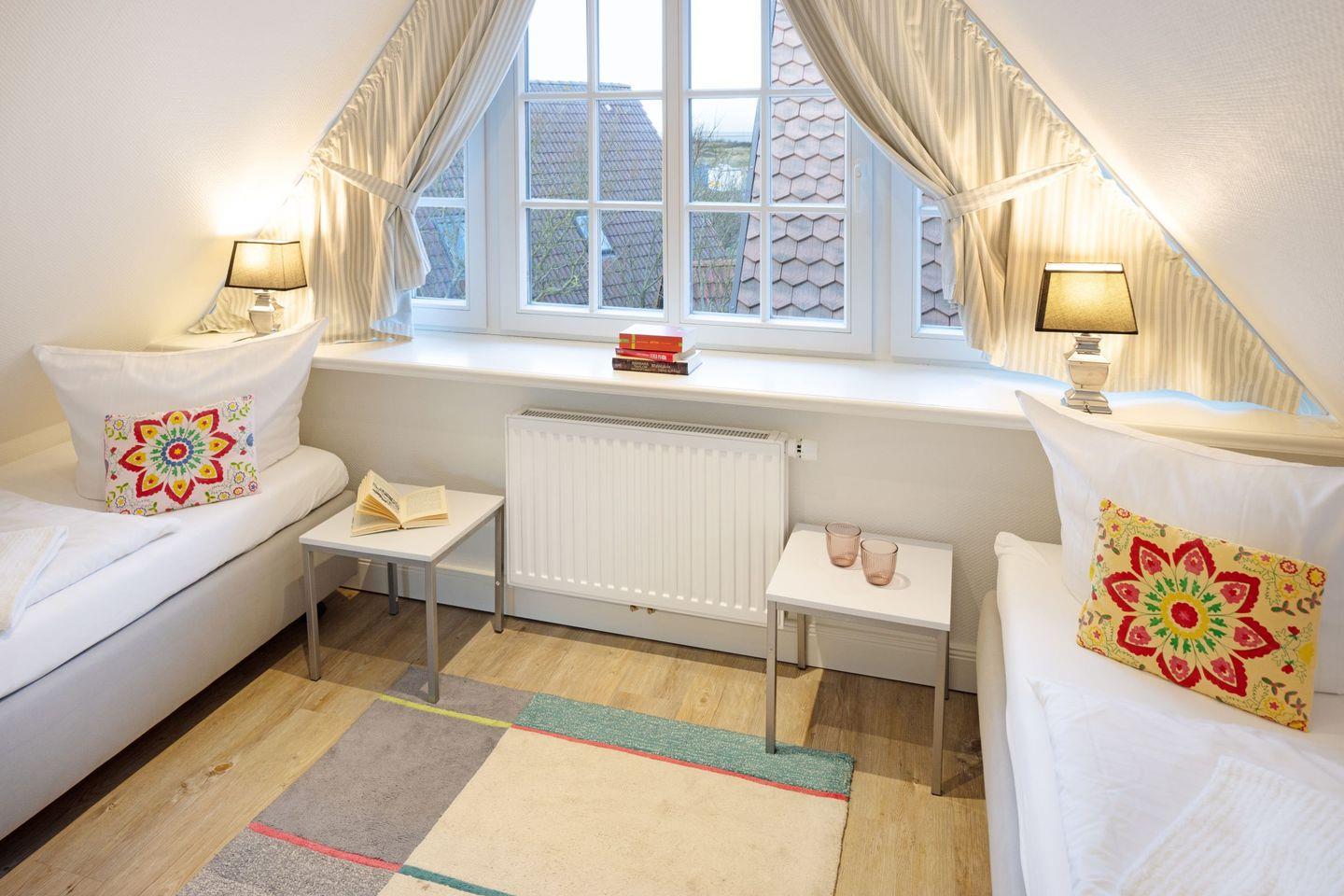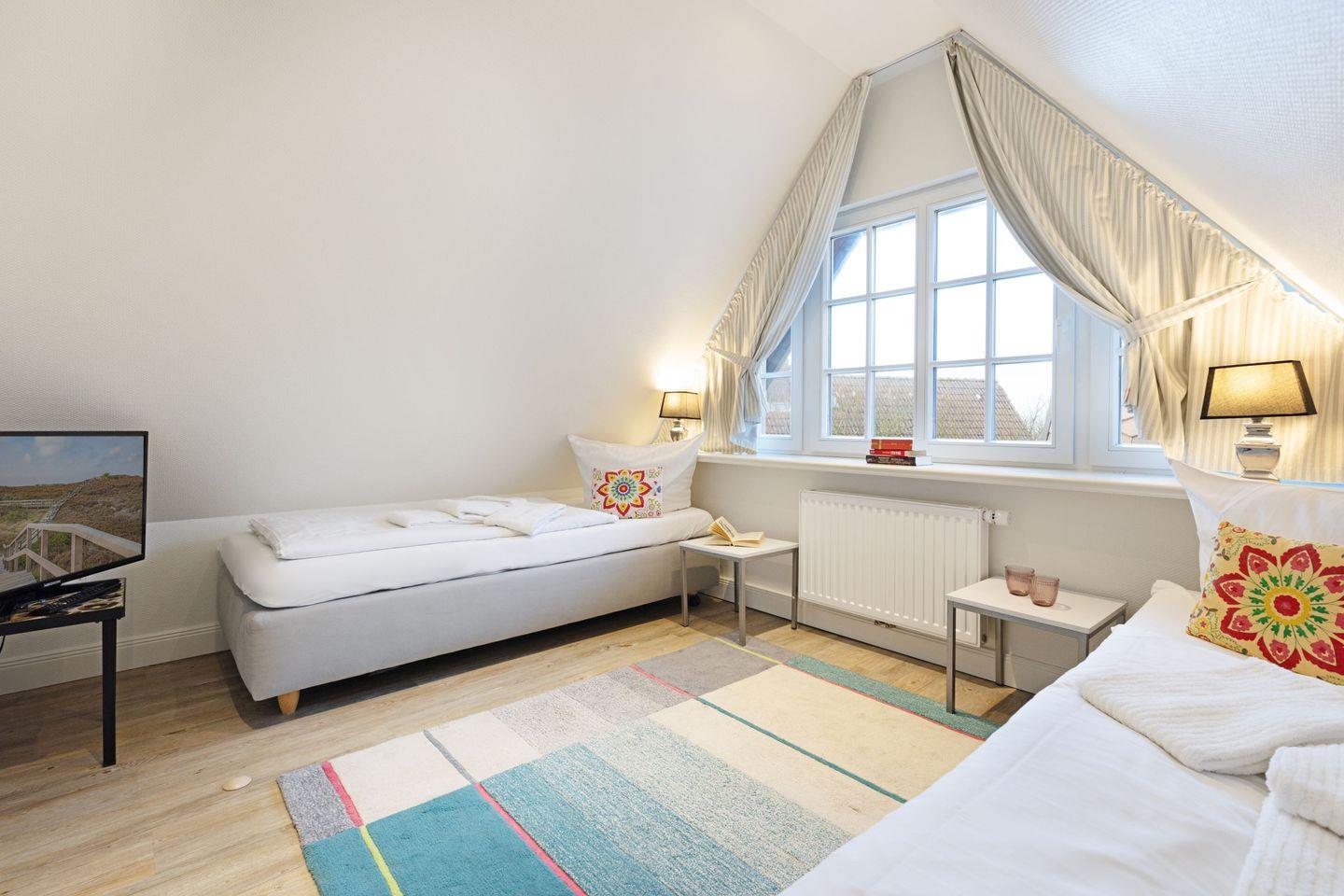 Im Dachgeschoss des Hauses finden Sie das dritte Schlafzimmer mit zwei Einzelbetten und einem Fernseher sowie einen gemütlichen Aufenthaltsraum.