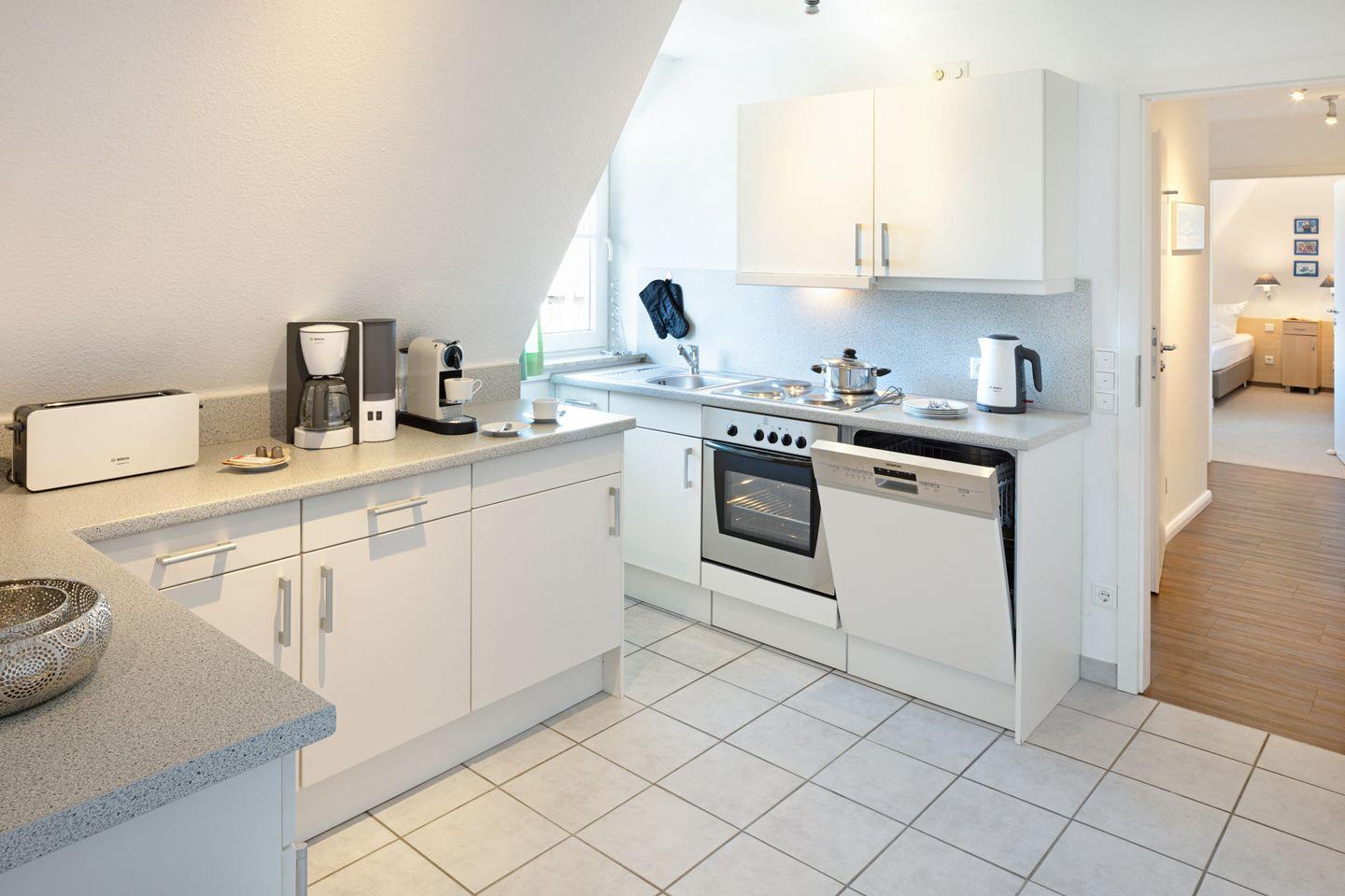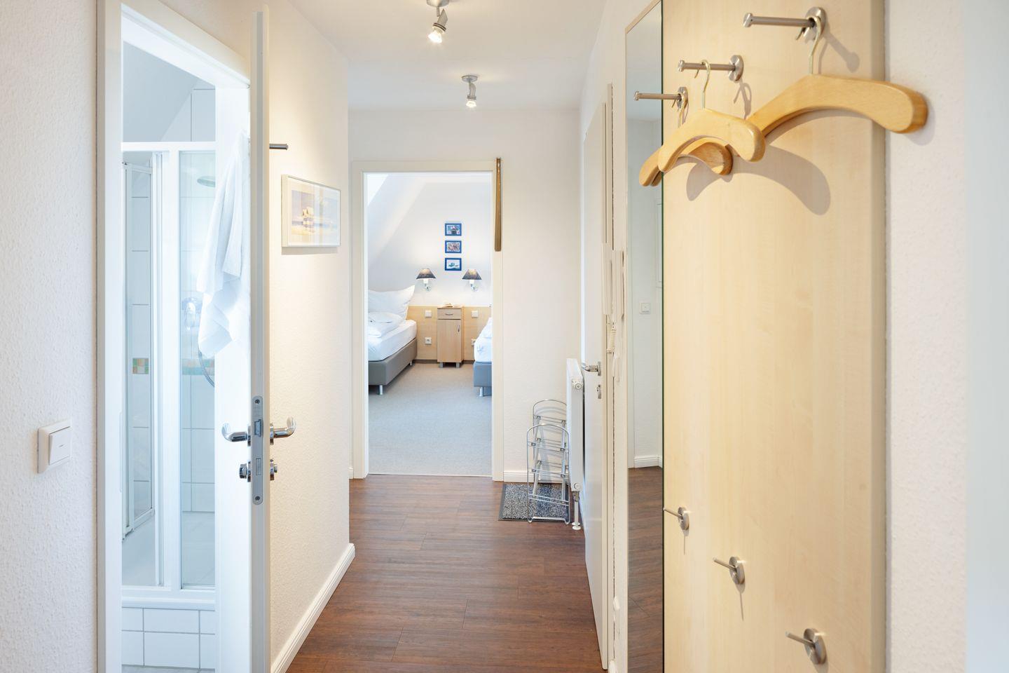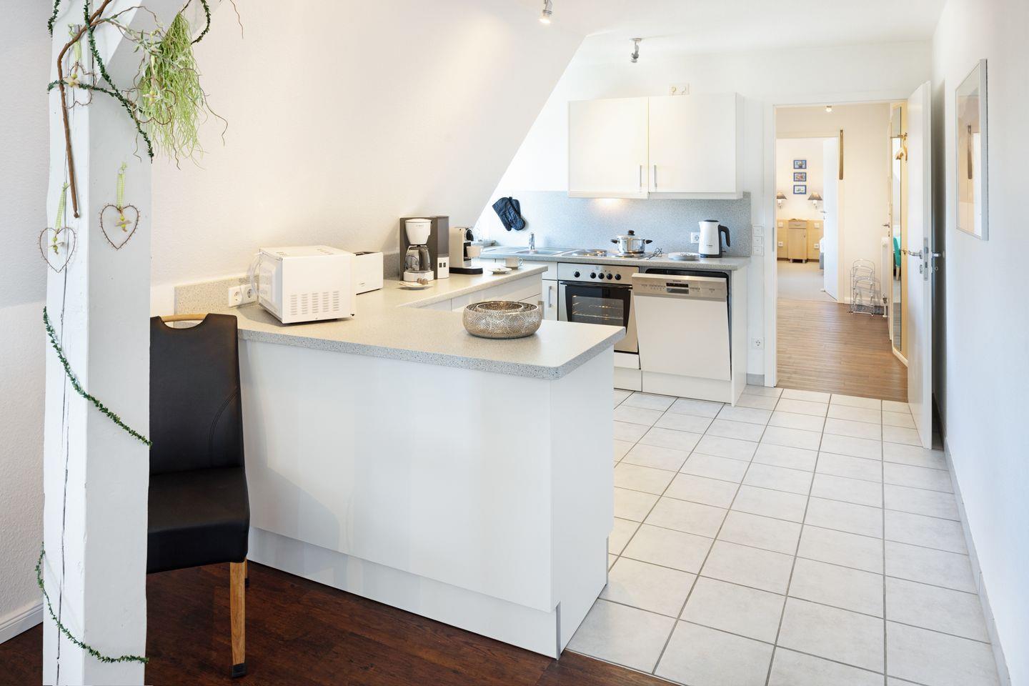Das Appartement befindet sich im 1. Stock und ist mit zwei behaglichen Schlafzimmern ausgestattet, die mit Teppichboden versehen sind und eine gemütliche Atmosphäre zum Entspannen bieten. Ein helles und freundliches Wohnzimmer mit Laminatboden lädt zum Verweilen ein und ist ausgestattet mit einer komfortablen Sofaecke, in der Sie sich zurücklehnen und die Zeit genießen können. Der Essbereich ist ideal für gemeinsame Mahlzeiten und gemütliche Abende, während die voll ausgestattete Küche Ihnen ermöglicht, eigene kulinarische Köstlichkeiten zuzubereiten.