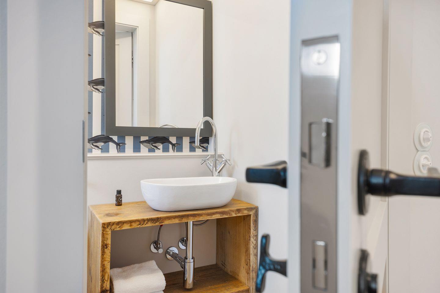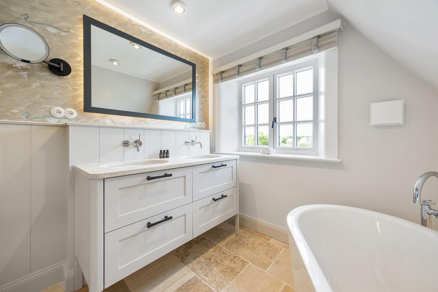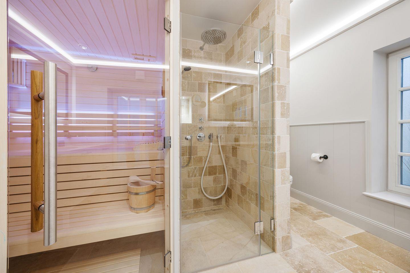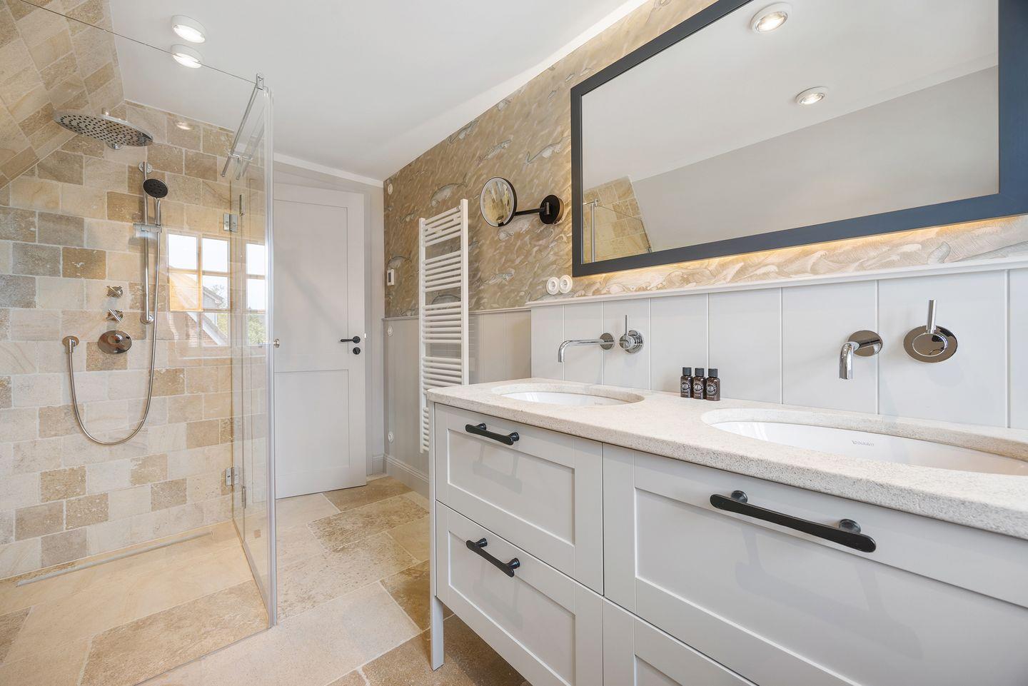 Das Haus bietet zwei moderne Badezimmer. Das erste Badezimmer verfügt über eine bodengleiche Dusche, Tageslicht und einen Föhn. Das zweite, luxuriöse Wellnessbad lädt mit einer Sauna, einer Badewanne und einer bodengleichen Dusche zur Entspannung ein – perfekt, um nach einem Tag auf der Insel zu relaxen. Ein Gäste-WC sorgt für zusätzlichen Komfort.