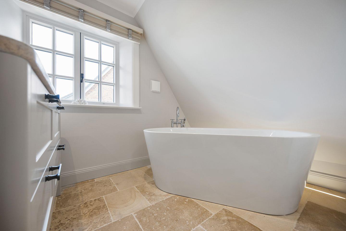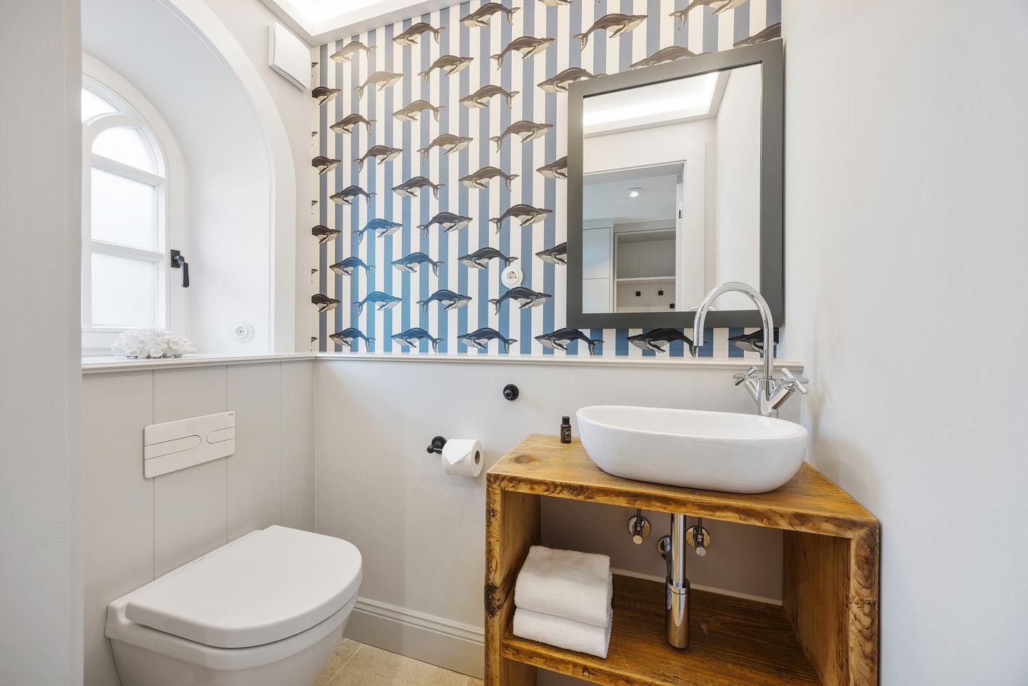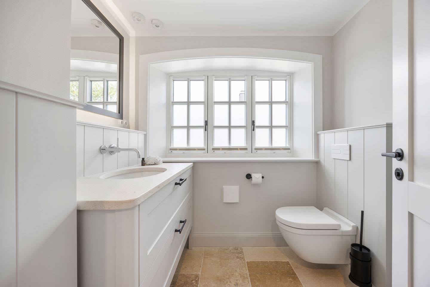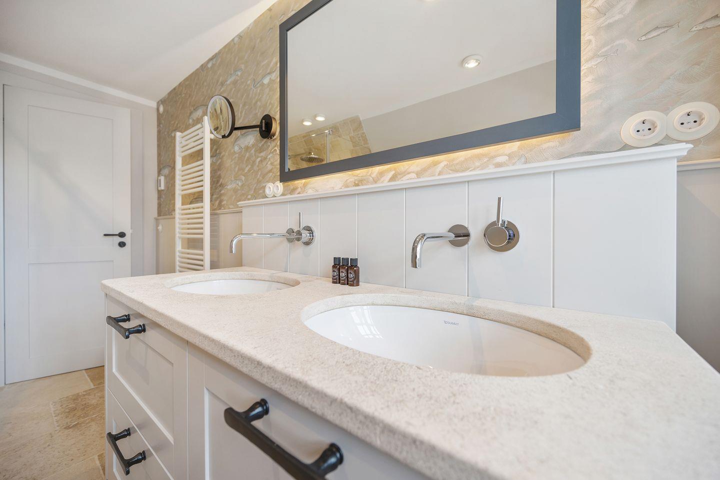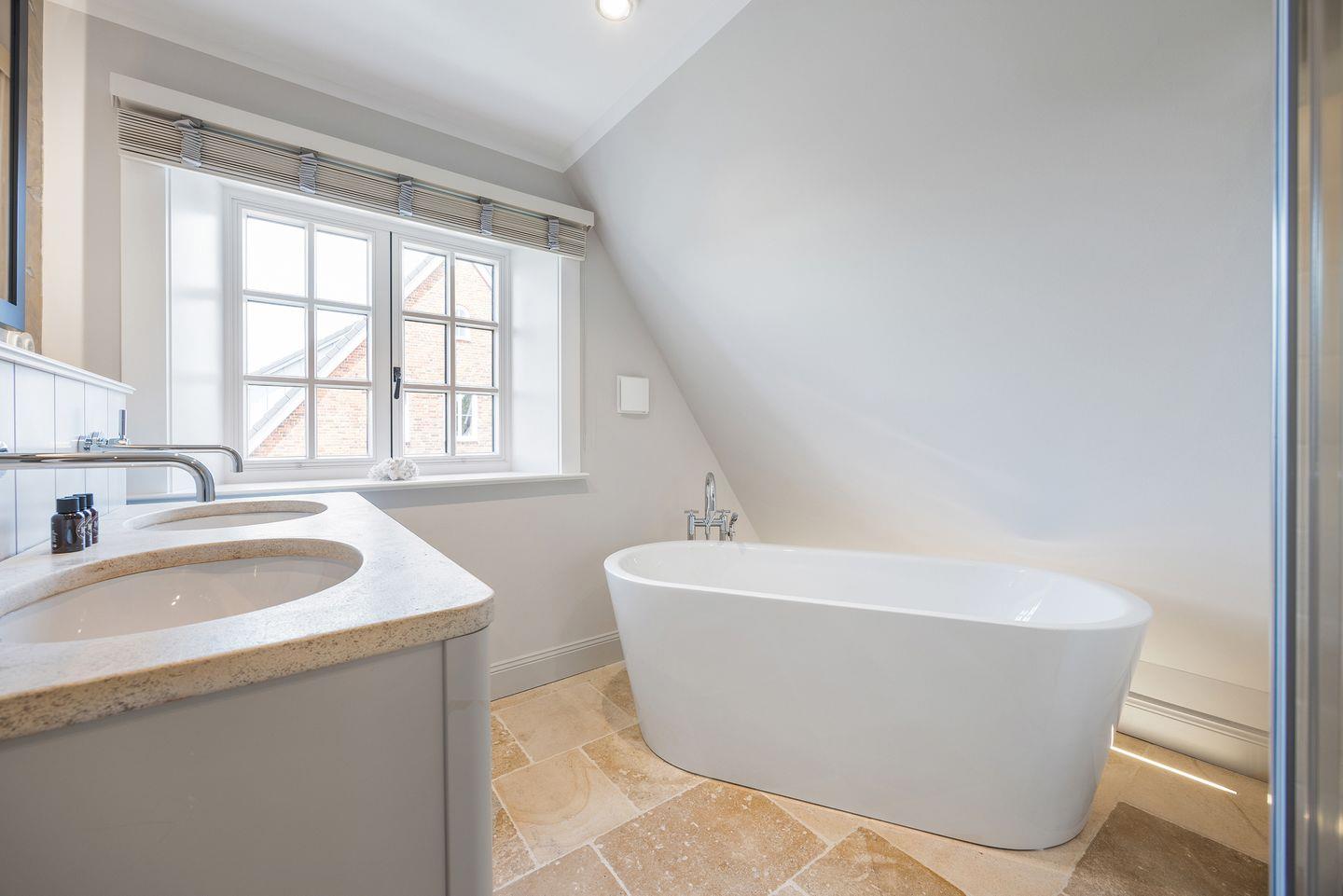 Das Haus bietet zwei moderne Badezimmer. Das erste Badezimmer verfügt über eine bodengleiche Dusche, Tageslicht und einen Föhn. Das zweite, luxuriöse Wellnessbad lädt mit einer Sauna, einer Badewanne und einer bodengleichen Dusche zur Entspannung ein – perfekt, um nach einem Tag auf der Insel zu relaxen. Ein Gäste-WC sorgt für zusätzlichen Komfort.