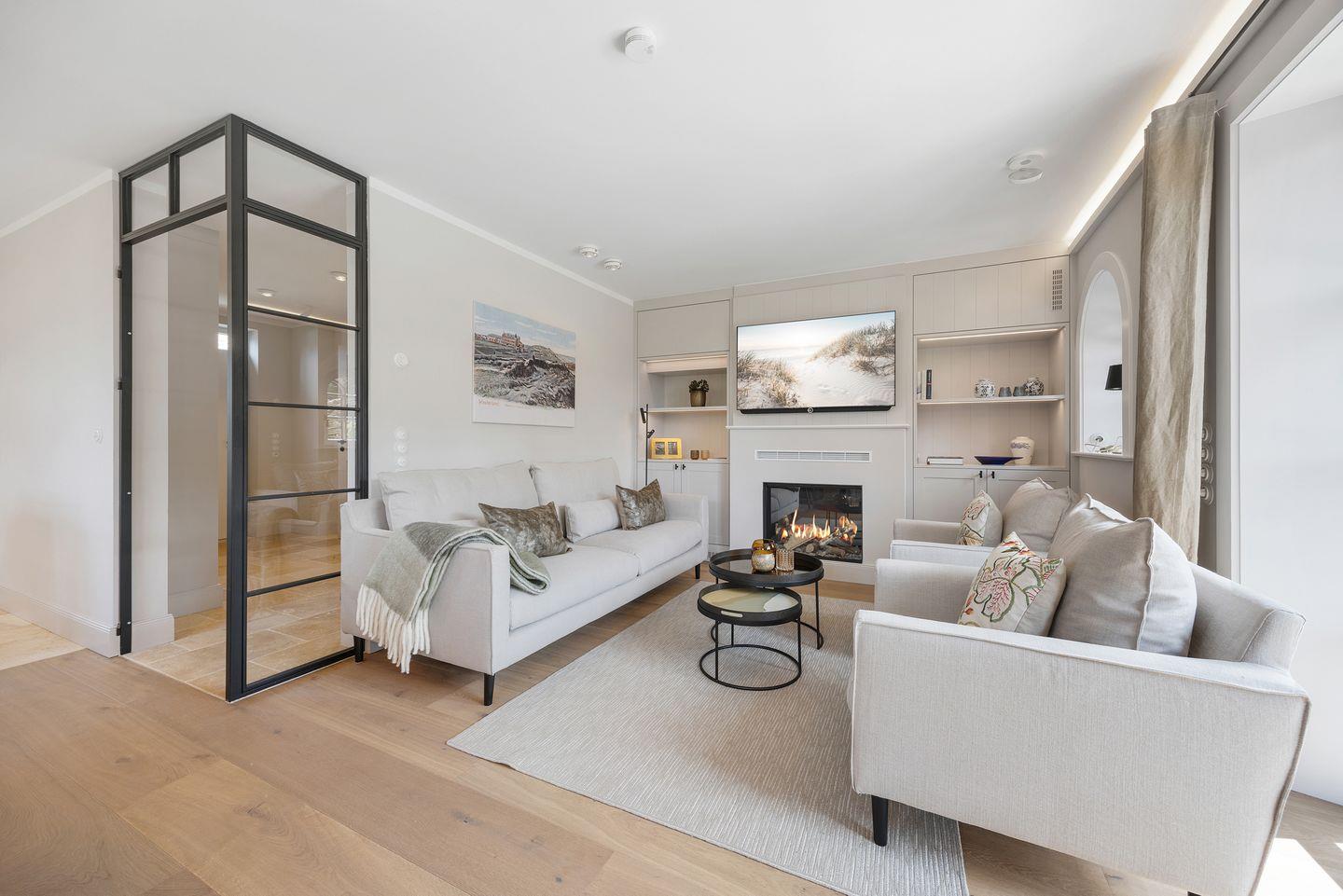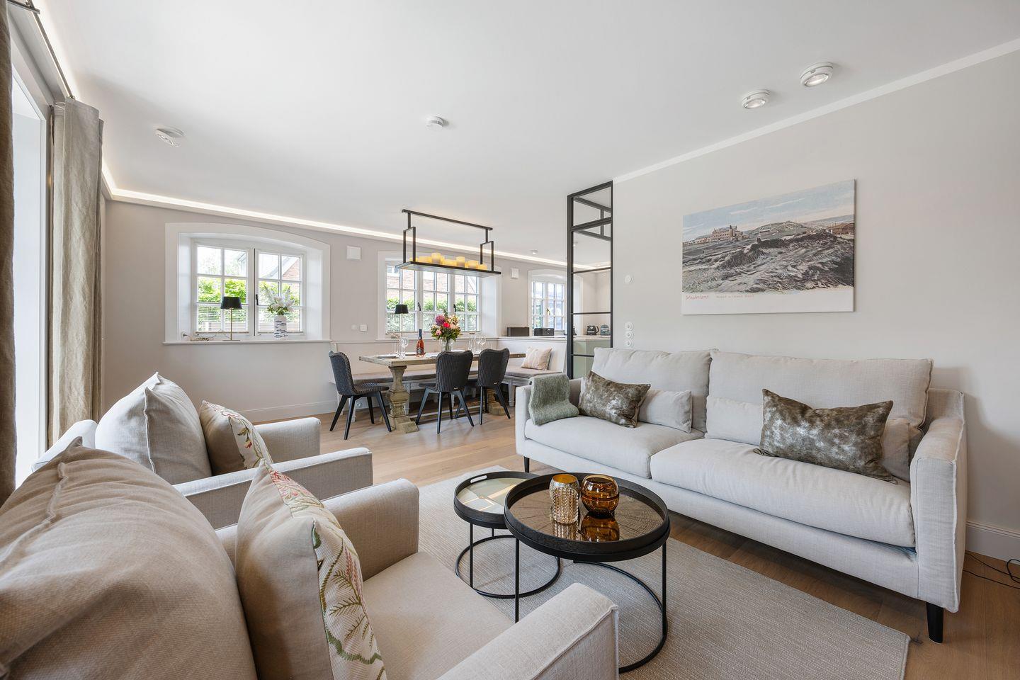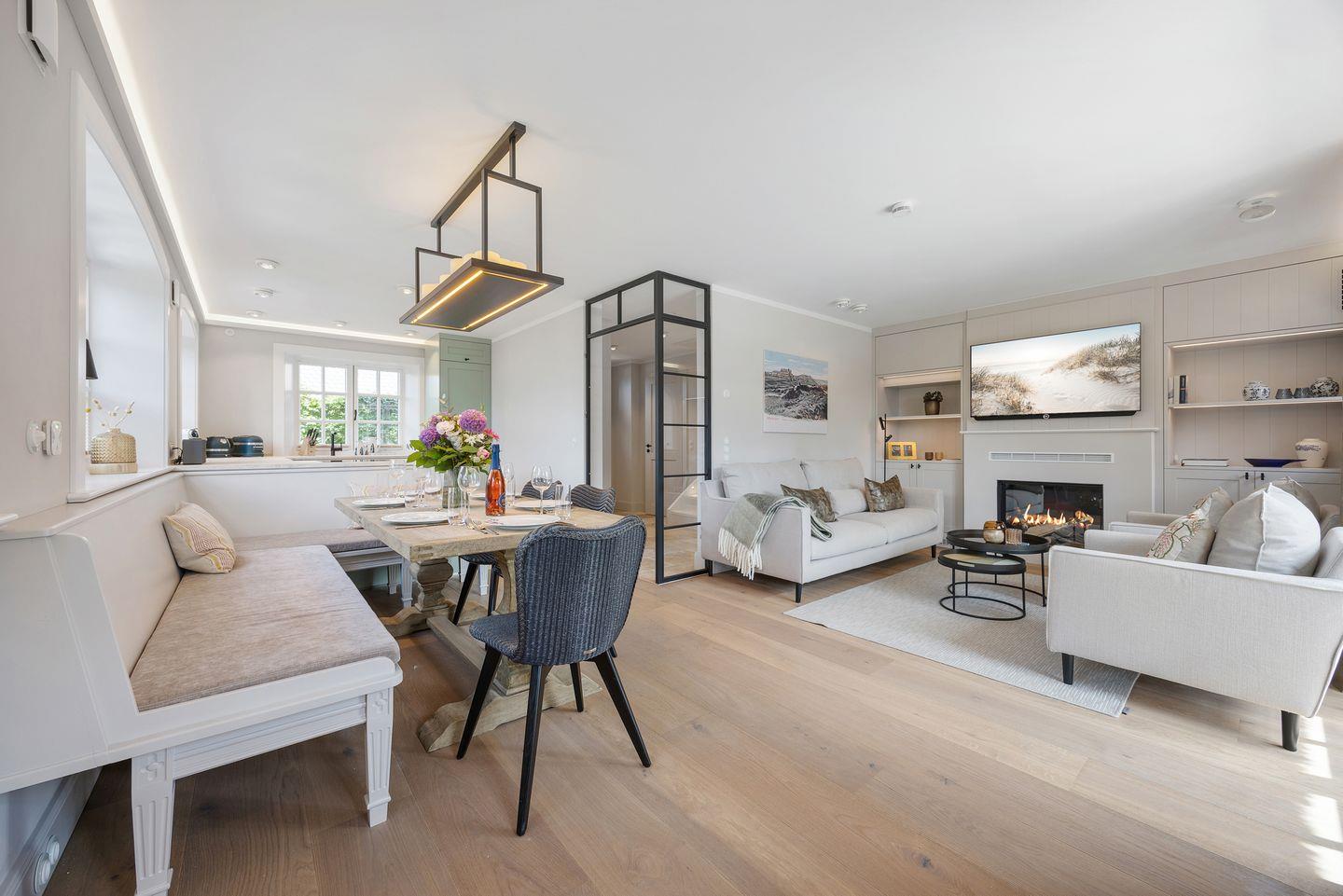 Das lichtdurchflutete Wohnzimmer mit einem gemütlichen Gaskamin schafft eine einladende Atmosphäre, in der Sie entspannte Stunden verbringen können. Die stilvolle Einrichtung, mit zeitlosen Möbeln und eleganten Details wie einer Authentage Lampe, sorgt für eine harmonische Kombination aus Luxus und Gemütlichkeit. Große Fenster bieten einen herrlichen Blick auf die umliegende Landschaft und führen direkt zum Freisitz, wo Sie die Sonne und frische Nordseeluft genießen können.