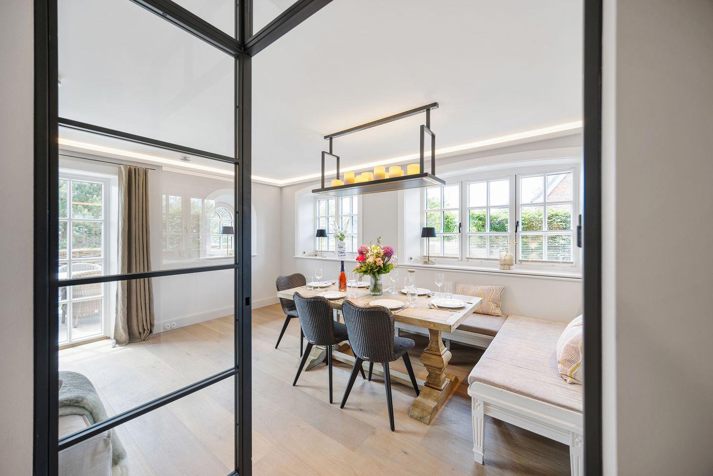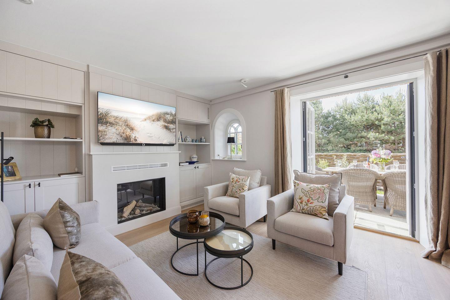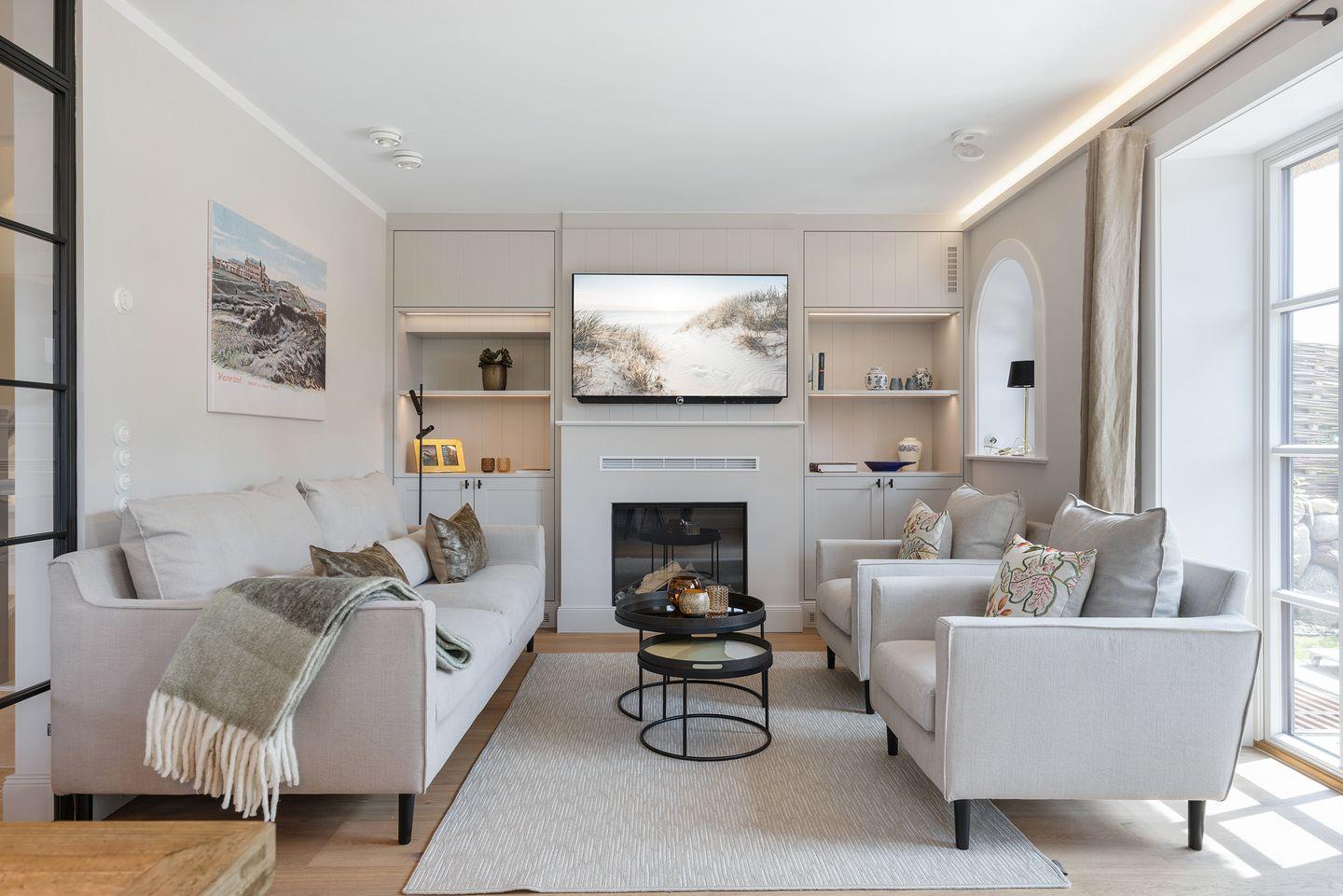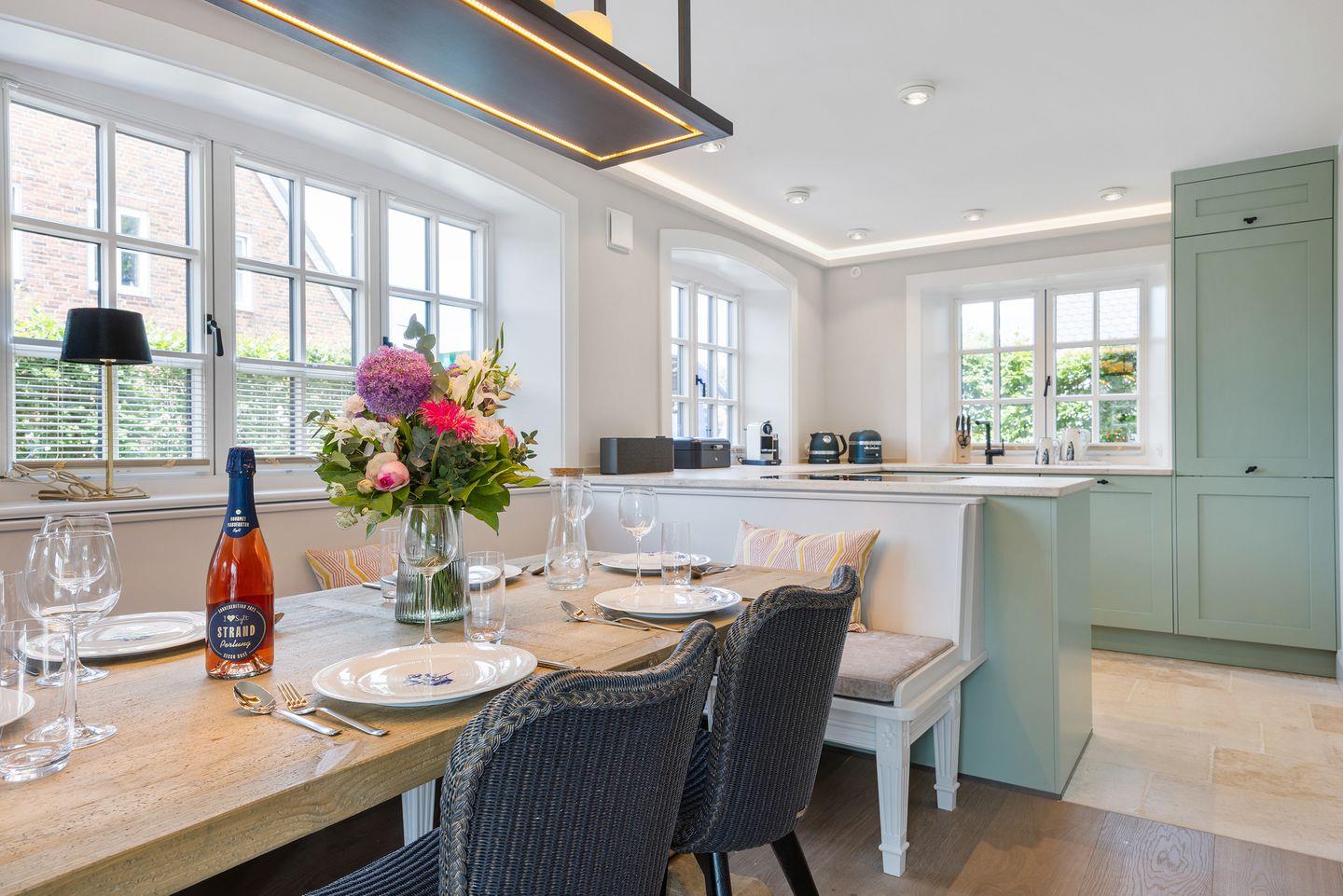 Das lichtdurchflutete Wohnzimmer mit einem gemütlichen Gaskamin schafft eine einladende Atmosphäre, in der Sie entspannte Stunden verbringen können. Die stilvolle Einrichtung, mit zeitlosen Möbeln und eleganten Details wie einer Authentage Lampe, sorgt für eine harmonische Kombination aus Luxus und Gemütlichkeit. Große Fenster bieten einen herrlichen Blick auf die umliegende Landschaft und führen direkt zum Freisitz, wo Sie die Sonne und frische Nordseeluft genießen können.